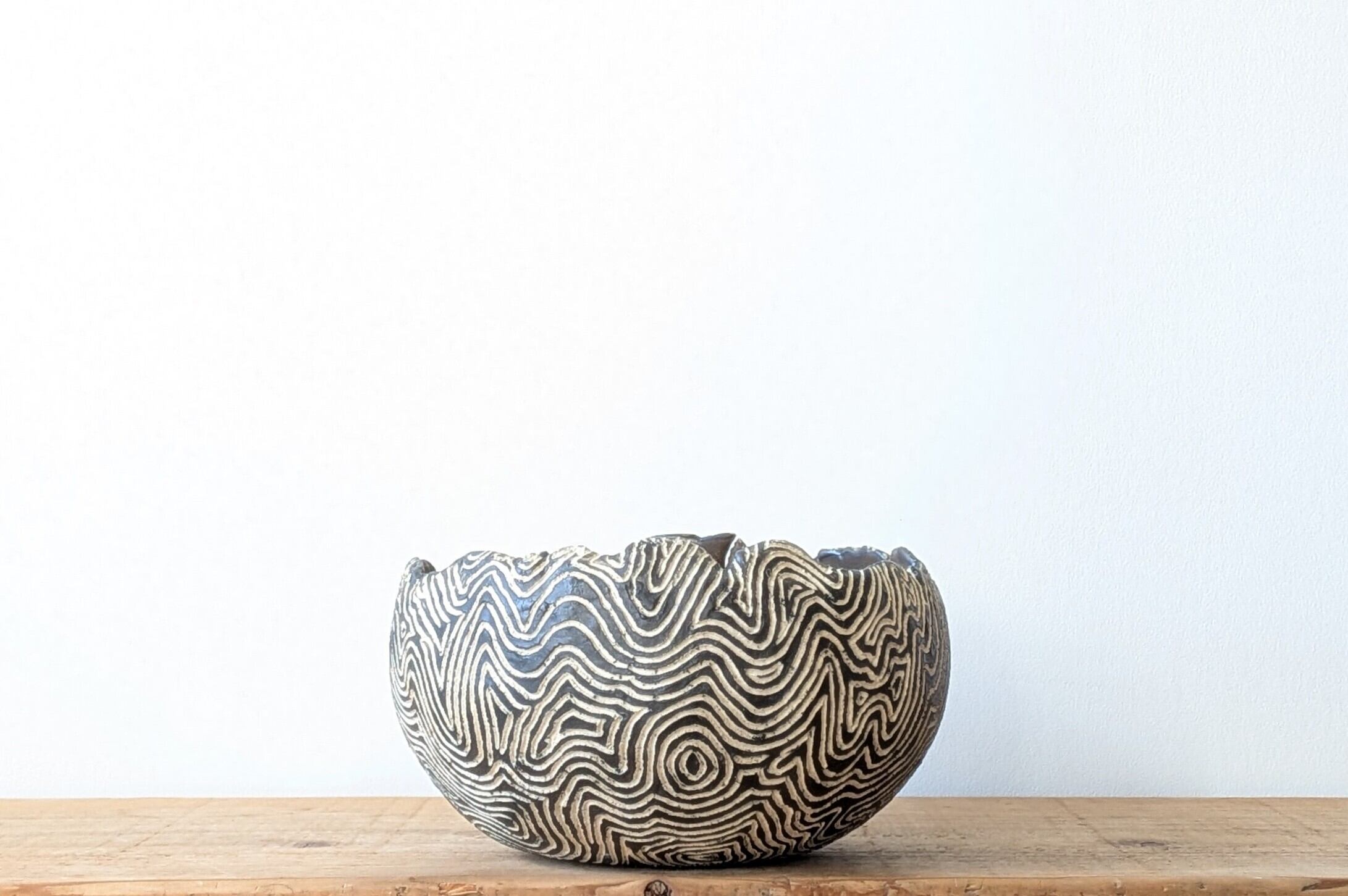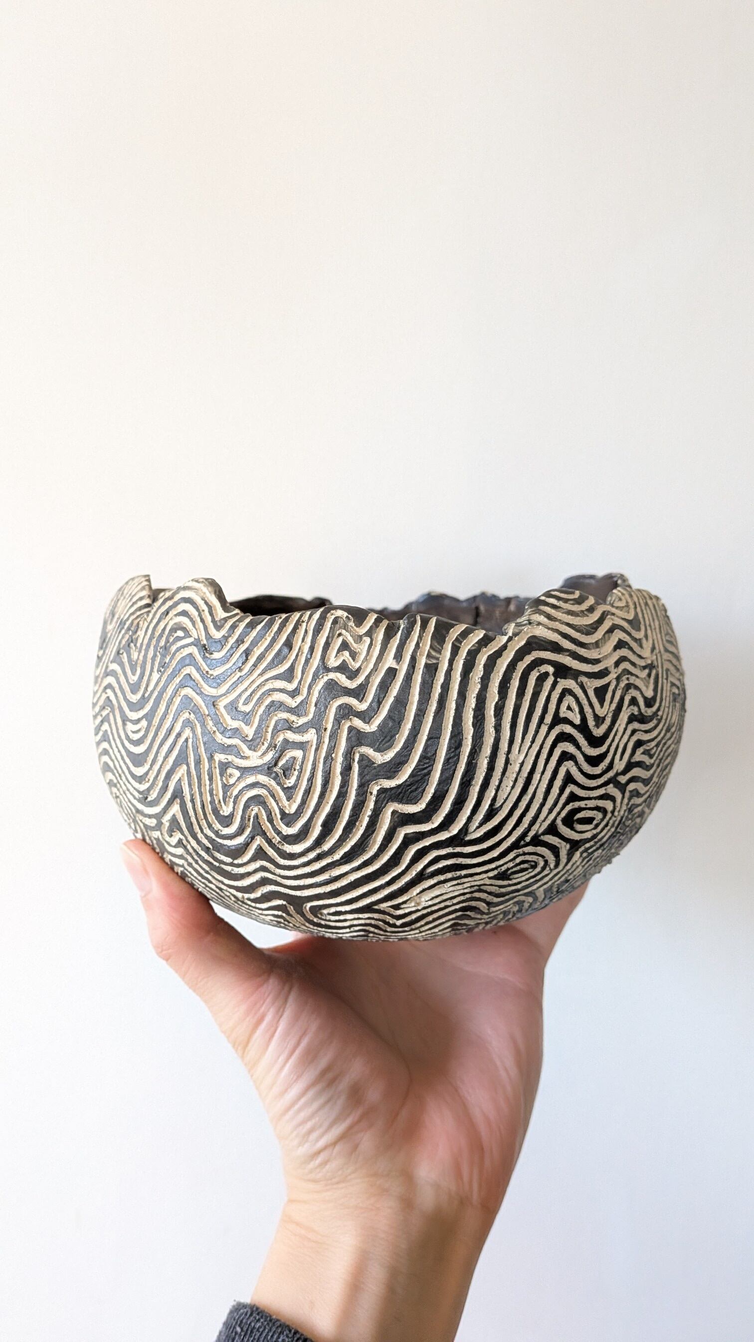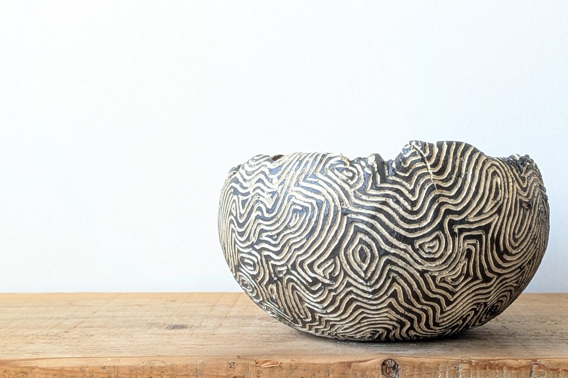 お椀型に成形した信楽粘土に特殊な製法で木の表面の様な模様を施しました。通常のお椀型の2倍サイズとなりますが見た目は4倍くらいあります。