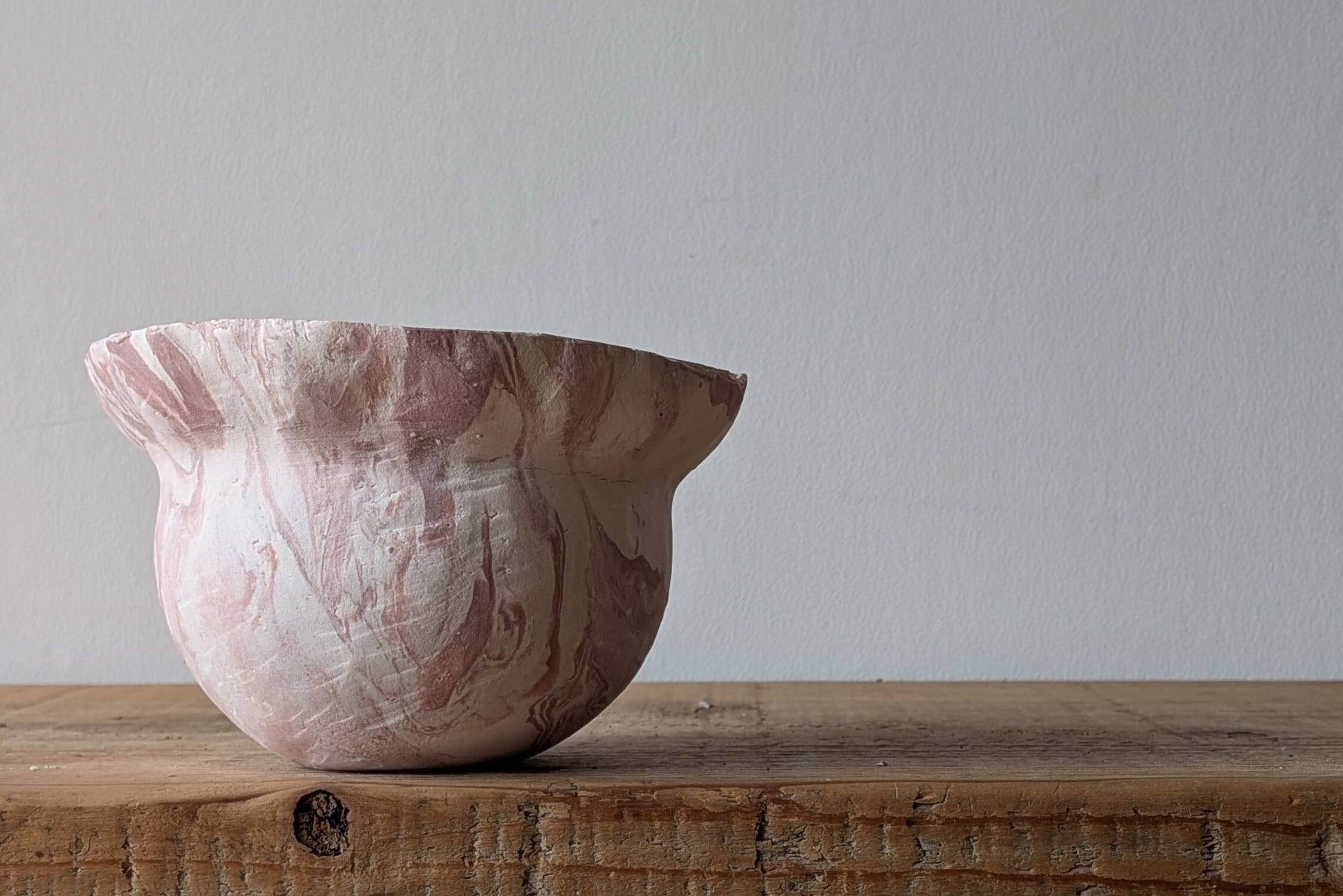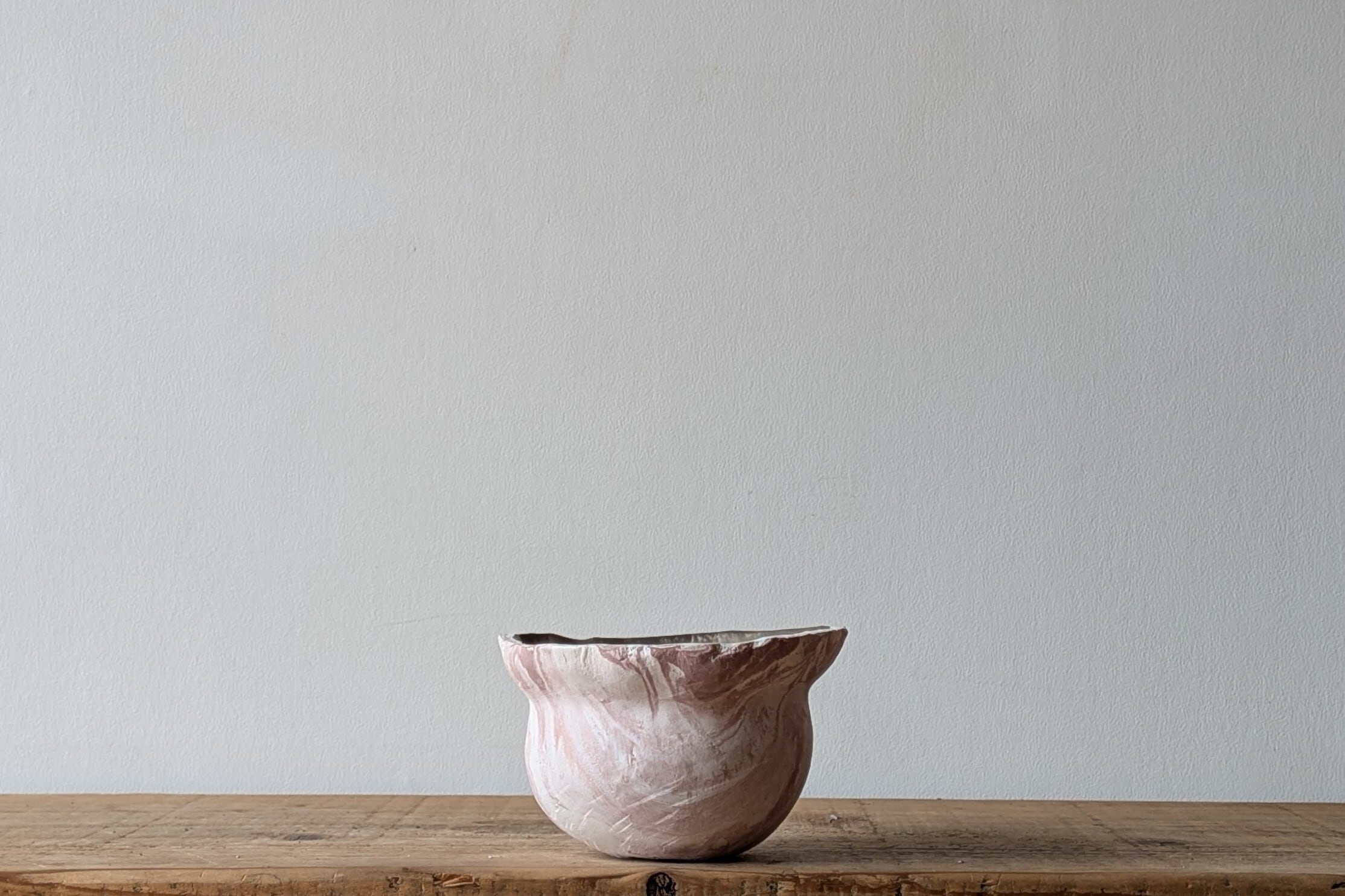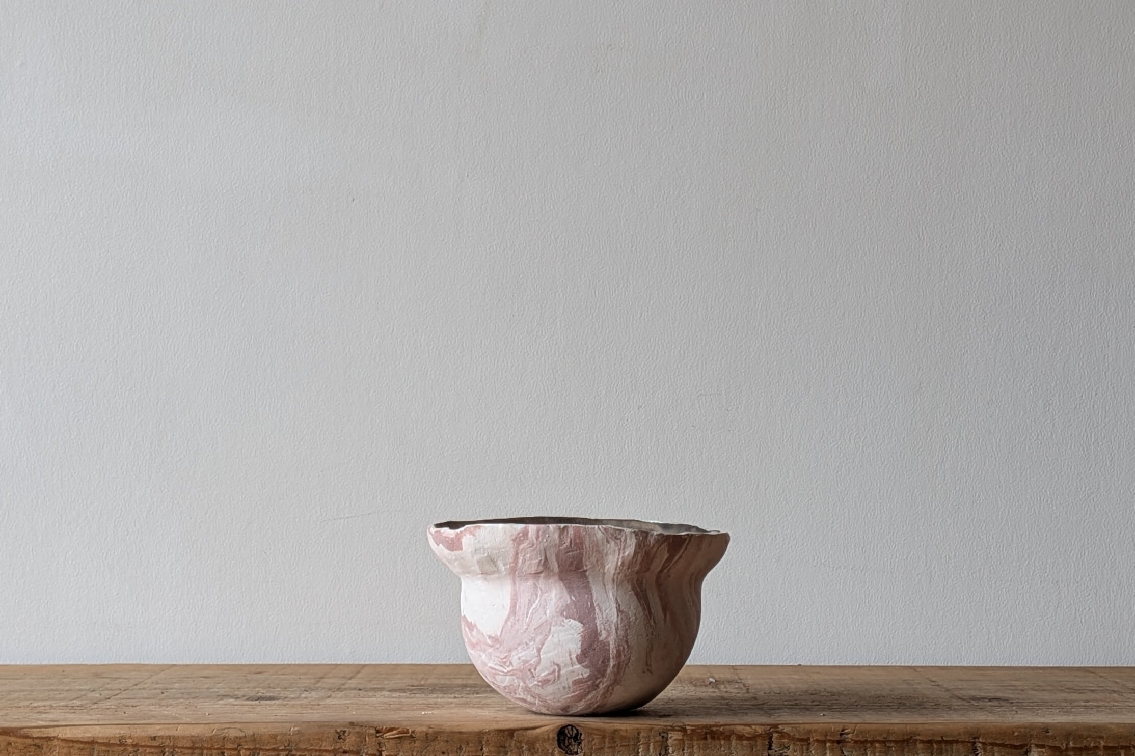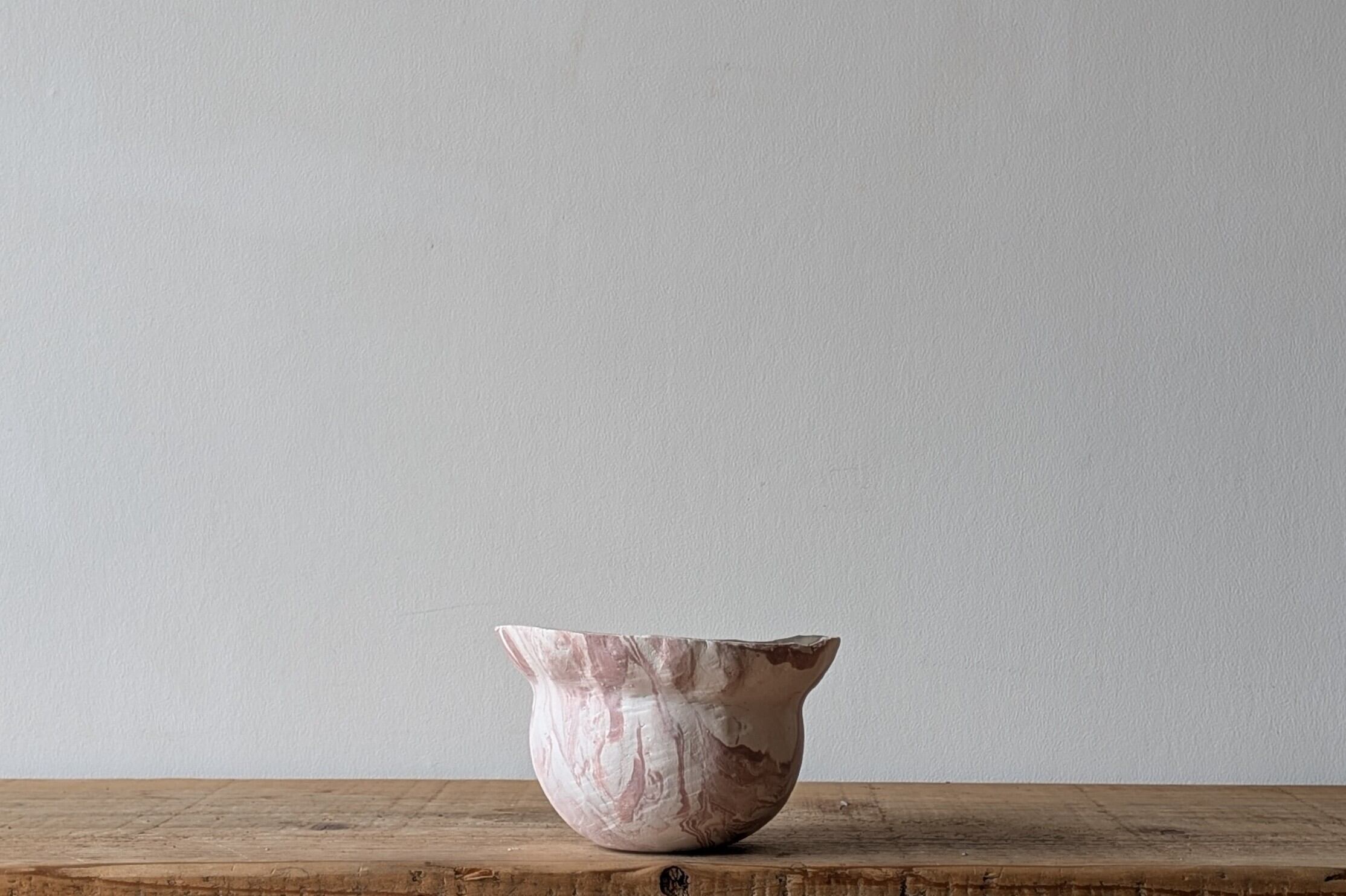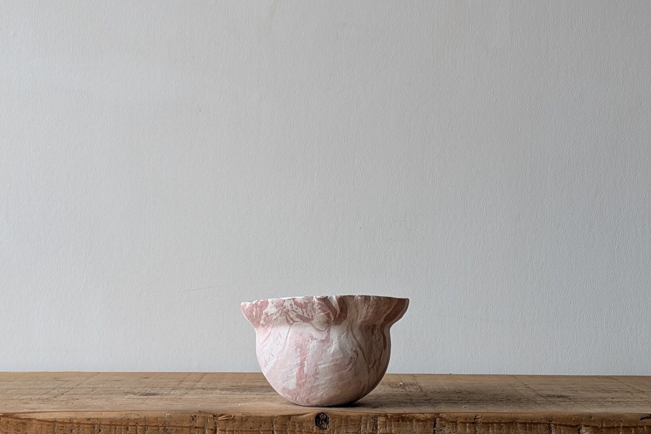 特殊な陶土を練り込みマーブル模様を作り壷型に成型しました。ピンクと白のコントラストが美しい器です。