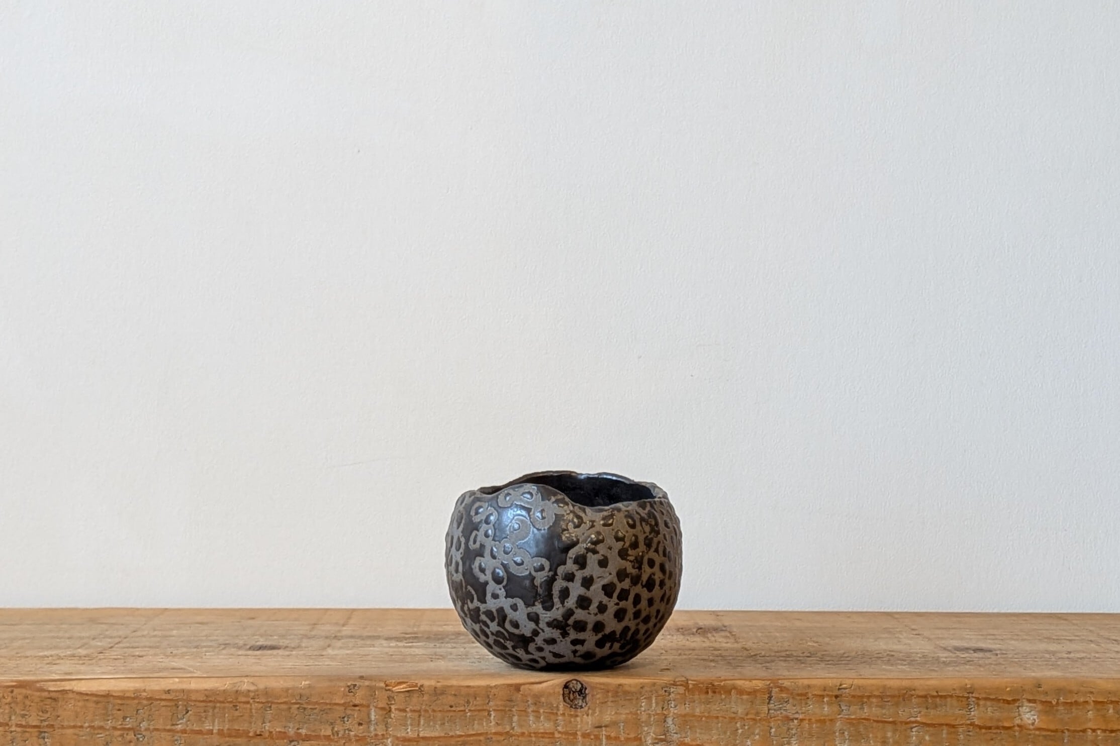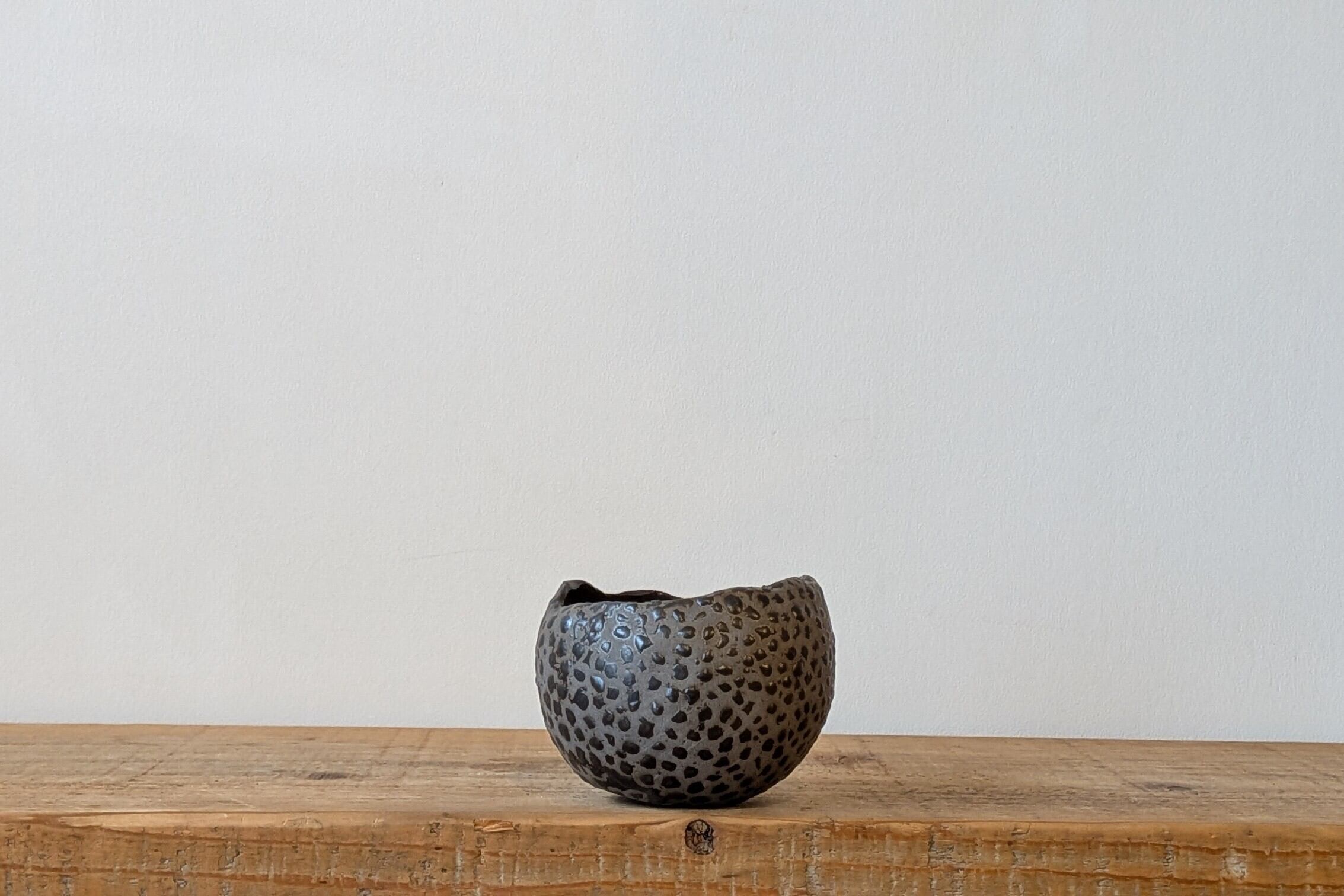 グレー色の陶土に点状に釉薬を塗り、ところどころ崩して不思議な模様にしました。
