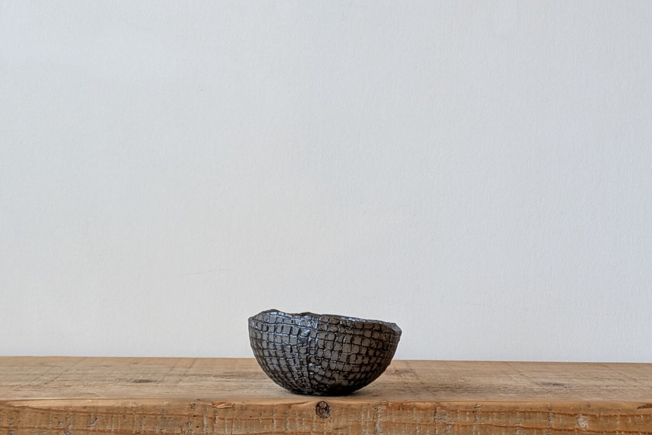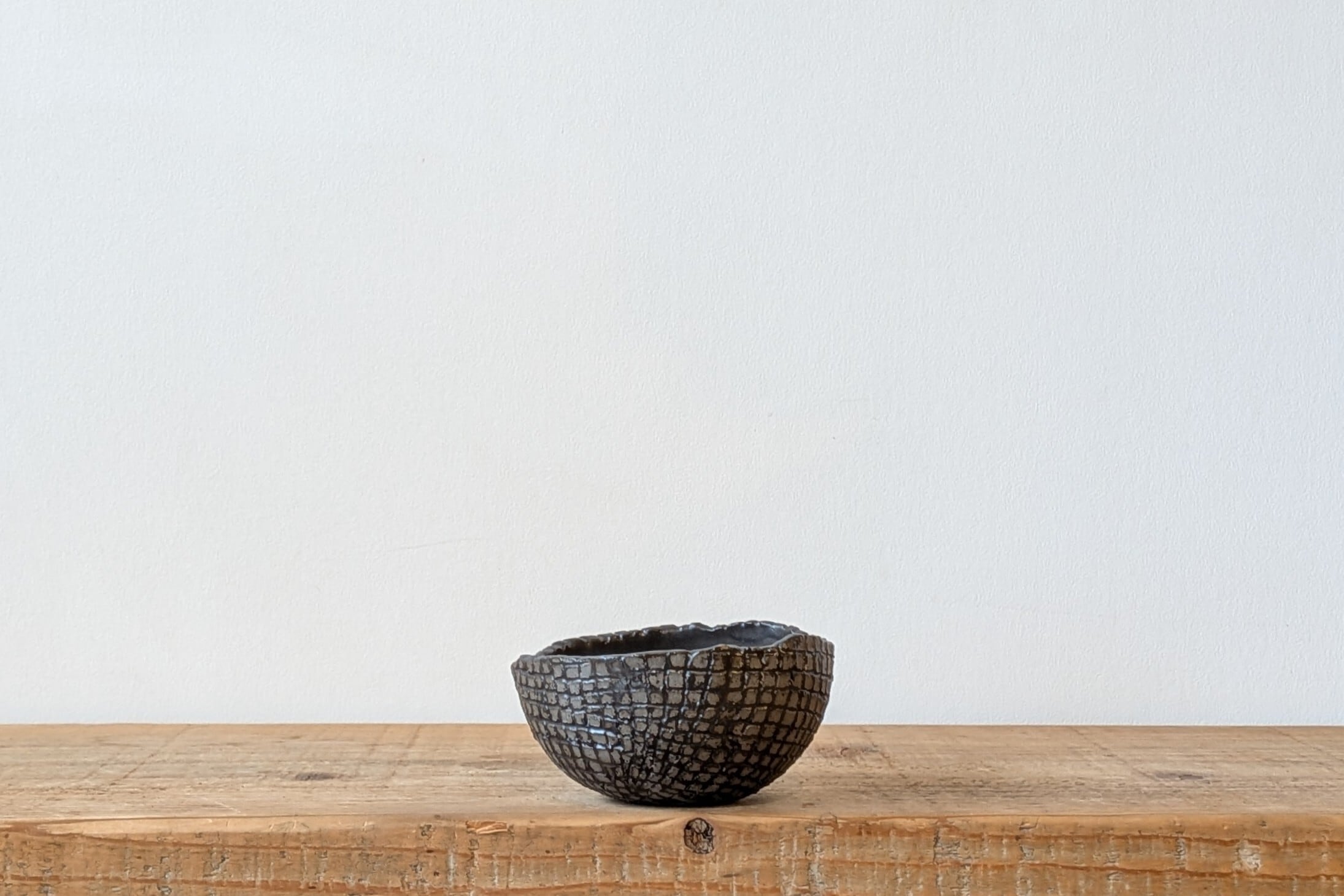 グレー色の陶土に線を彫りを隙間にマットブラックの釉薬を入れました。細かい造形が植物の存在感を引き立てます。