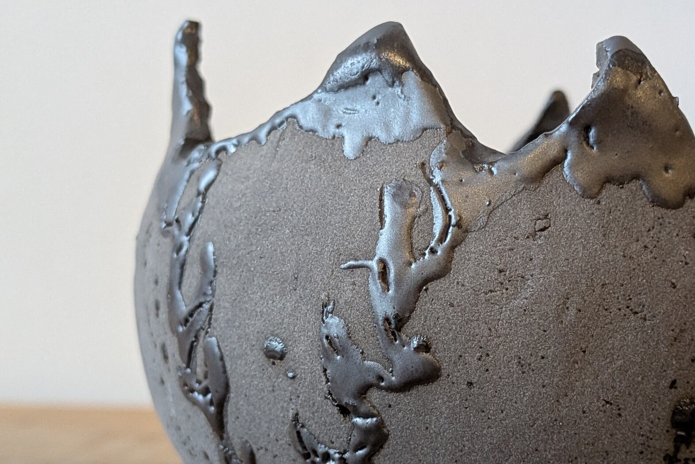 グレー色の陶土をアガベの様な形状にし、トゲを黒マット釉薬で再現しました。