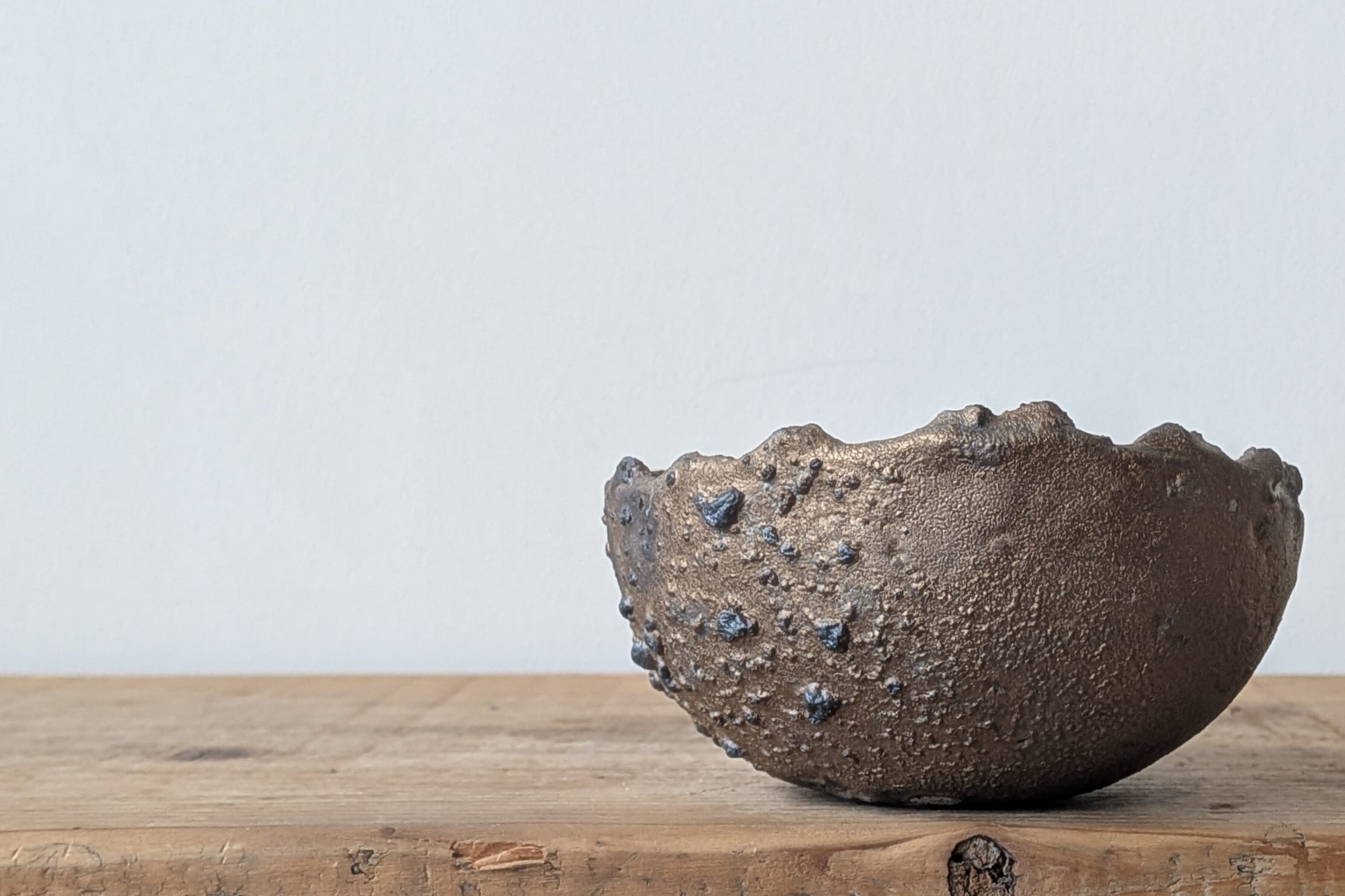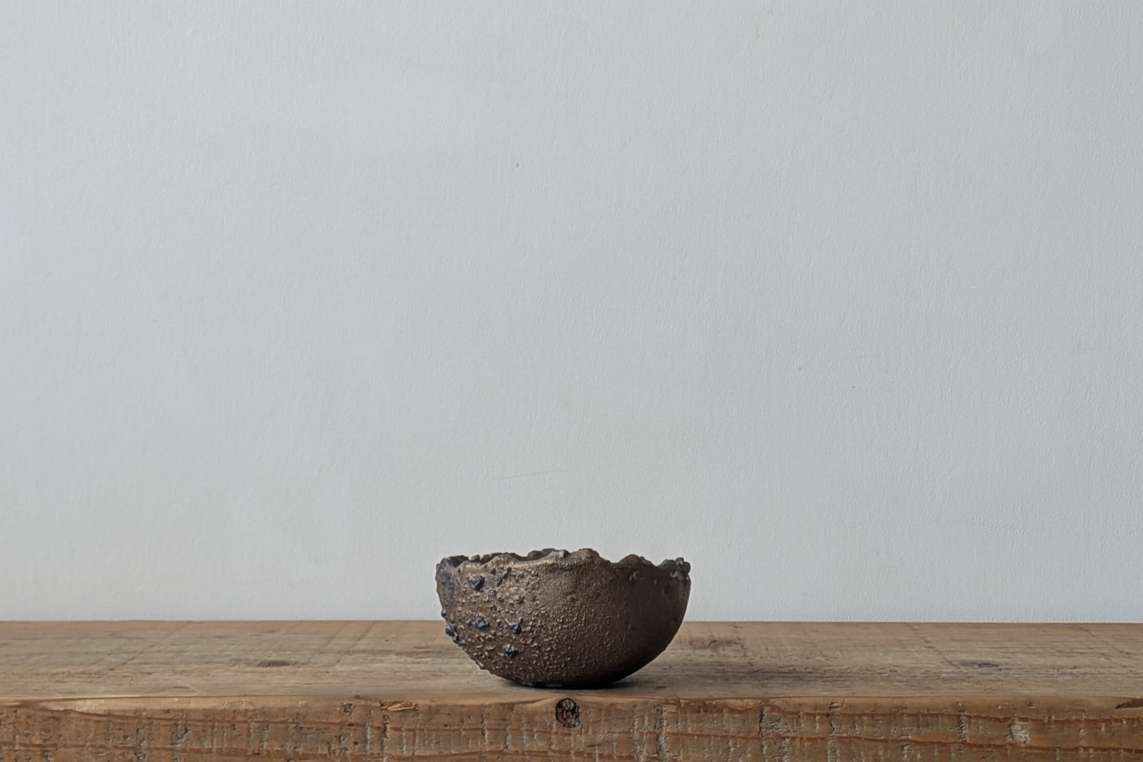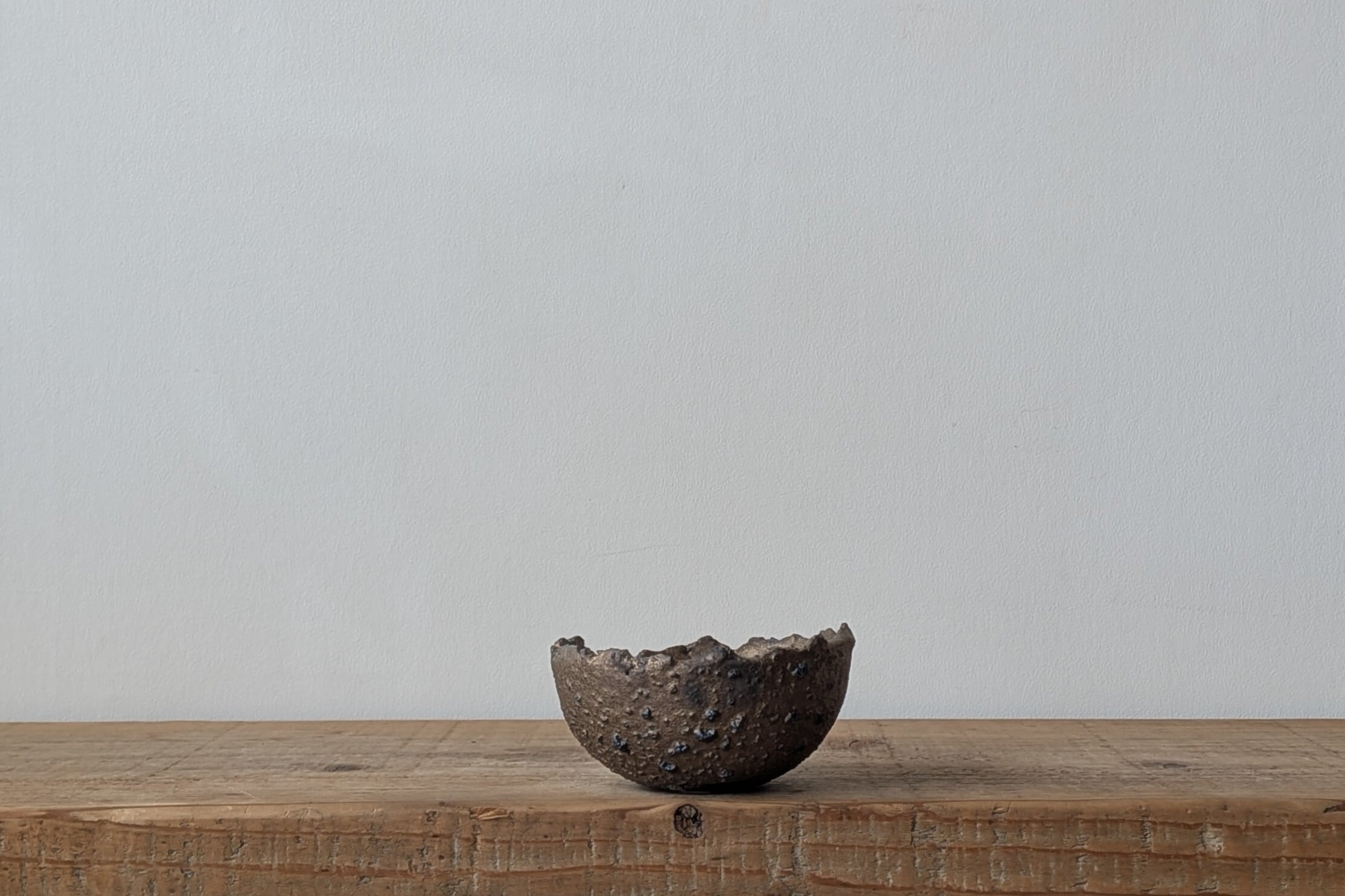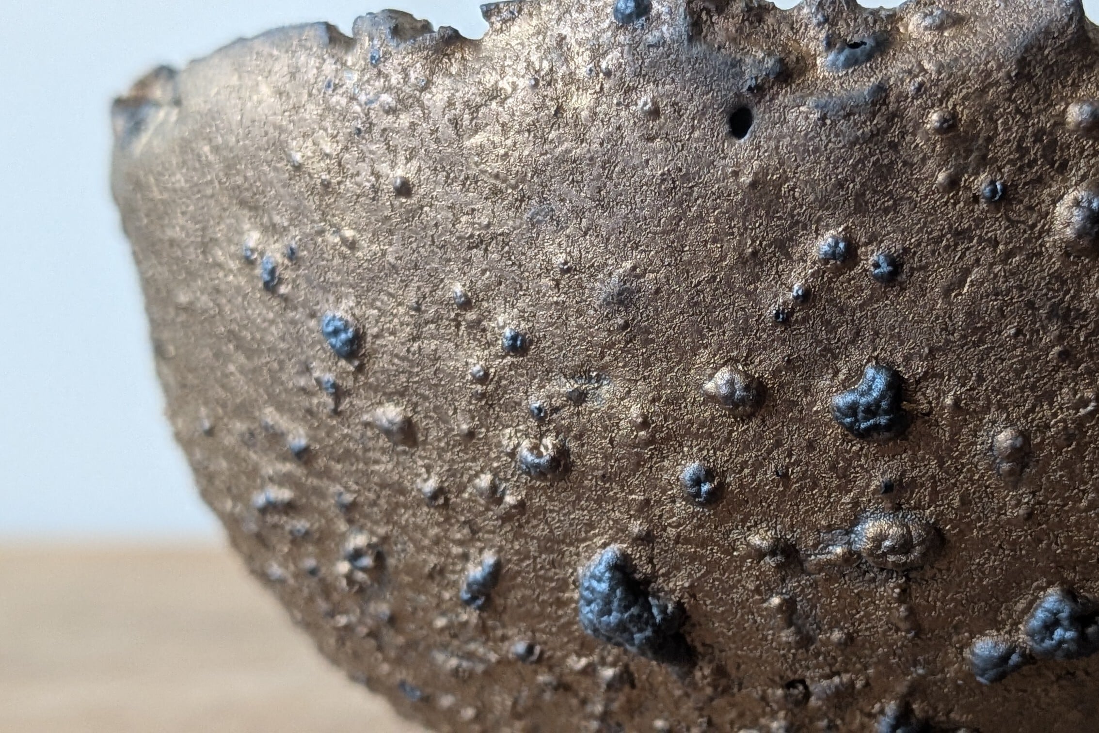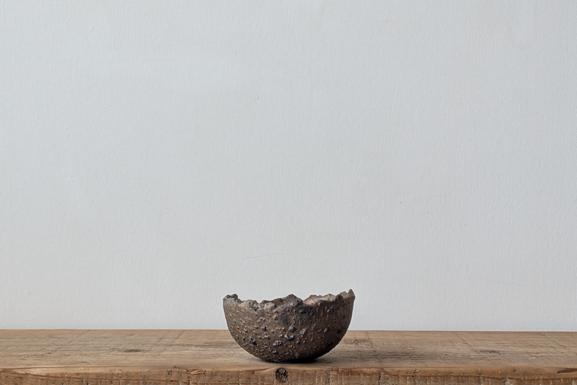 土の粒感が際立つ粗い黒土と、口縁のダイナミックな造形が特徴。アンティークゴールド釉薬が光を受けて深みを増し、大地や自然のエネルギーを感じさせる陶器鉢です。