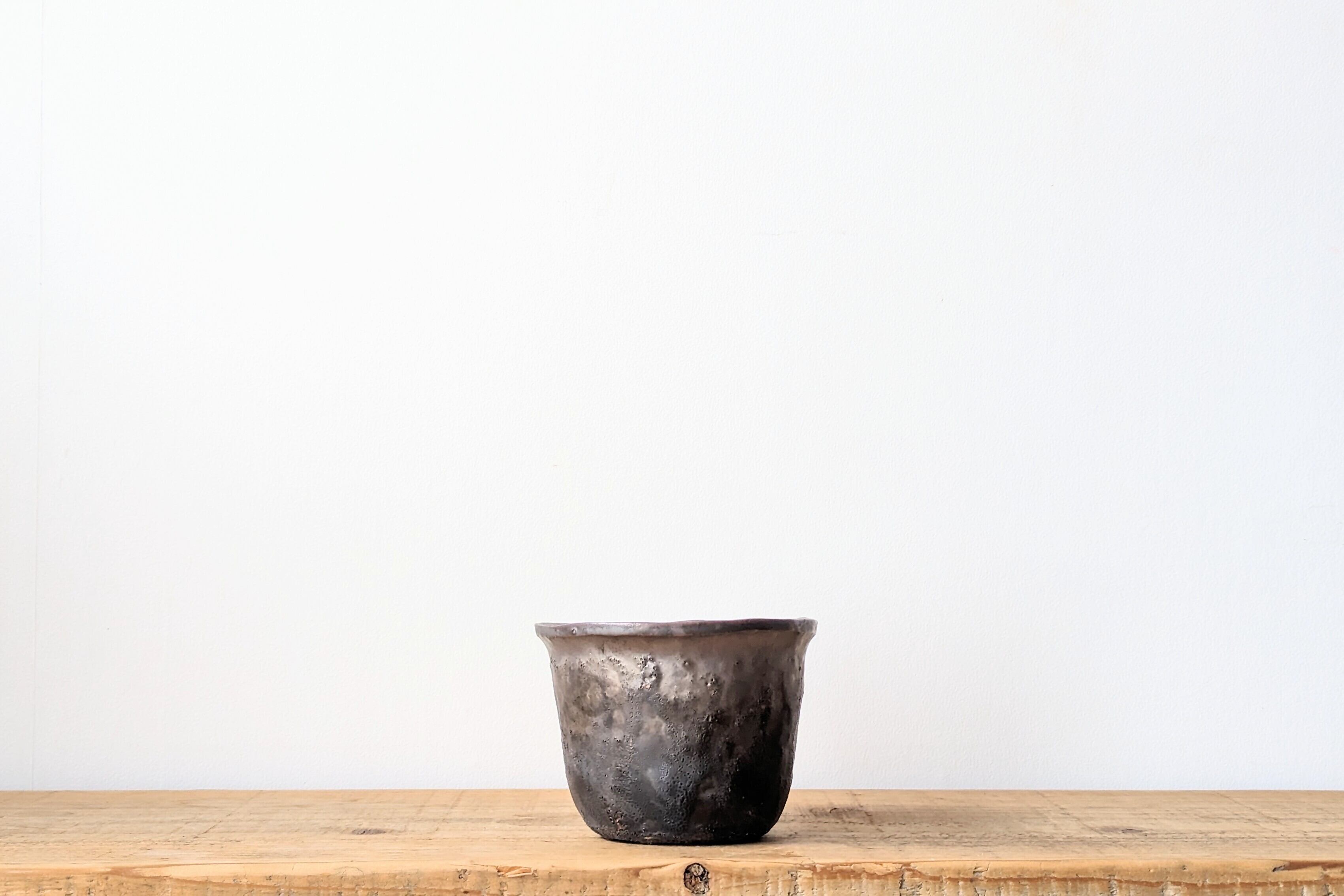 ところどころ銀色に輝く、焼け残った隕石の様な表面の器です。