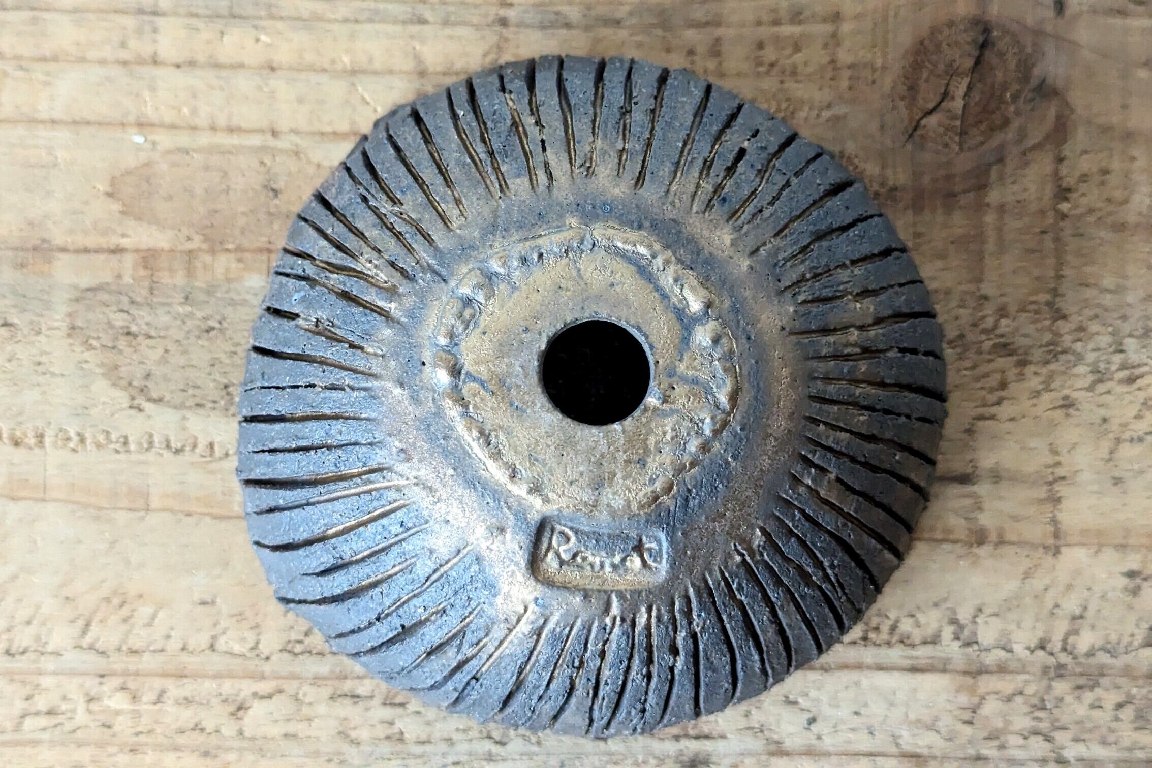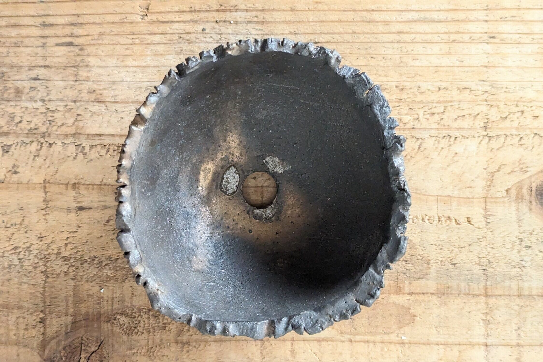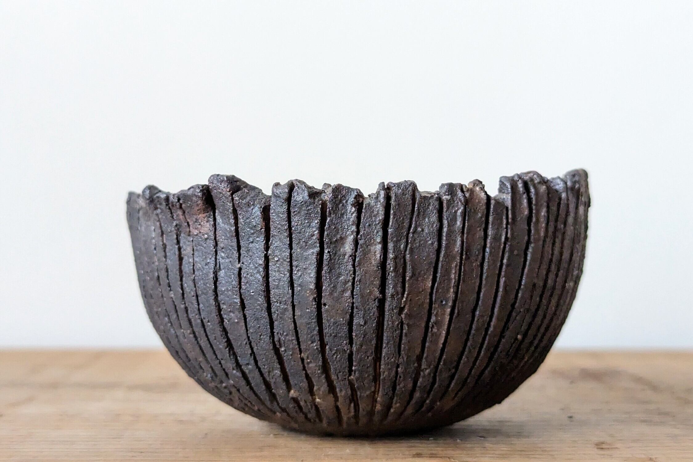 半円に成型した陶土に切れ目を沢山入れ模様を作り、炭で燻して仕上げ、更に釉薬で仕上げました。深みのある黒色の器です