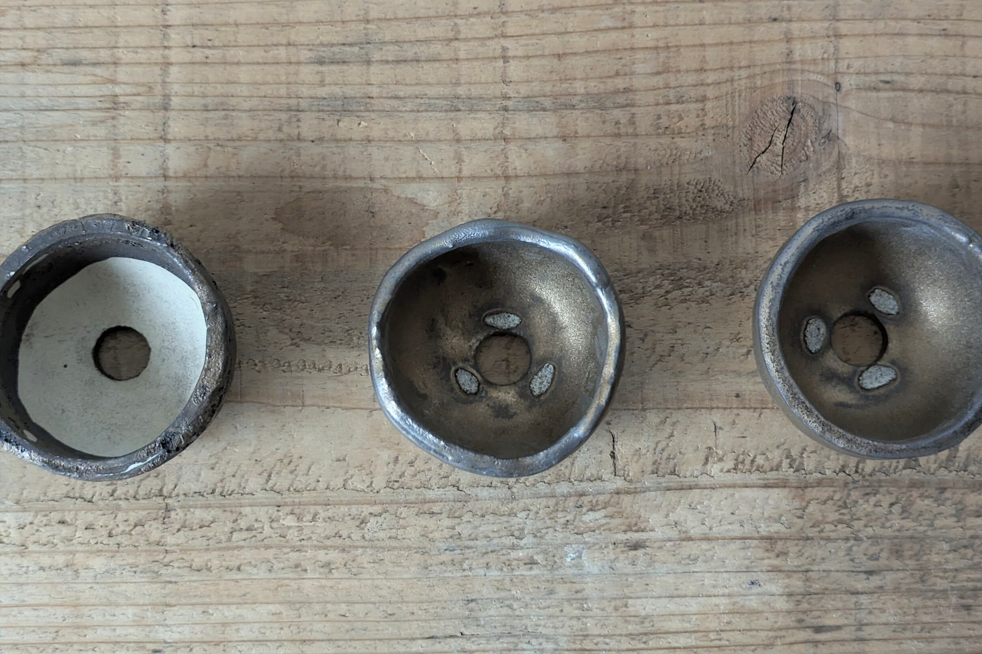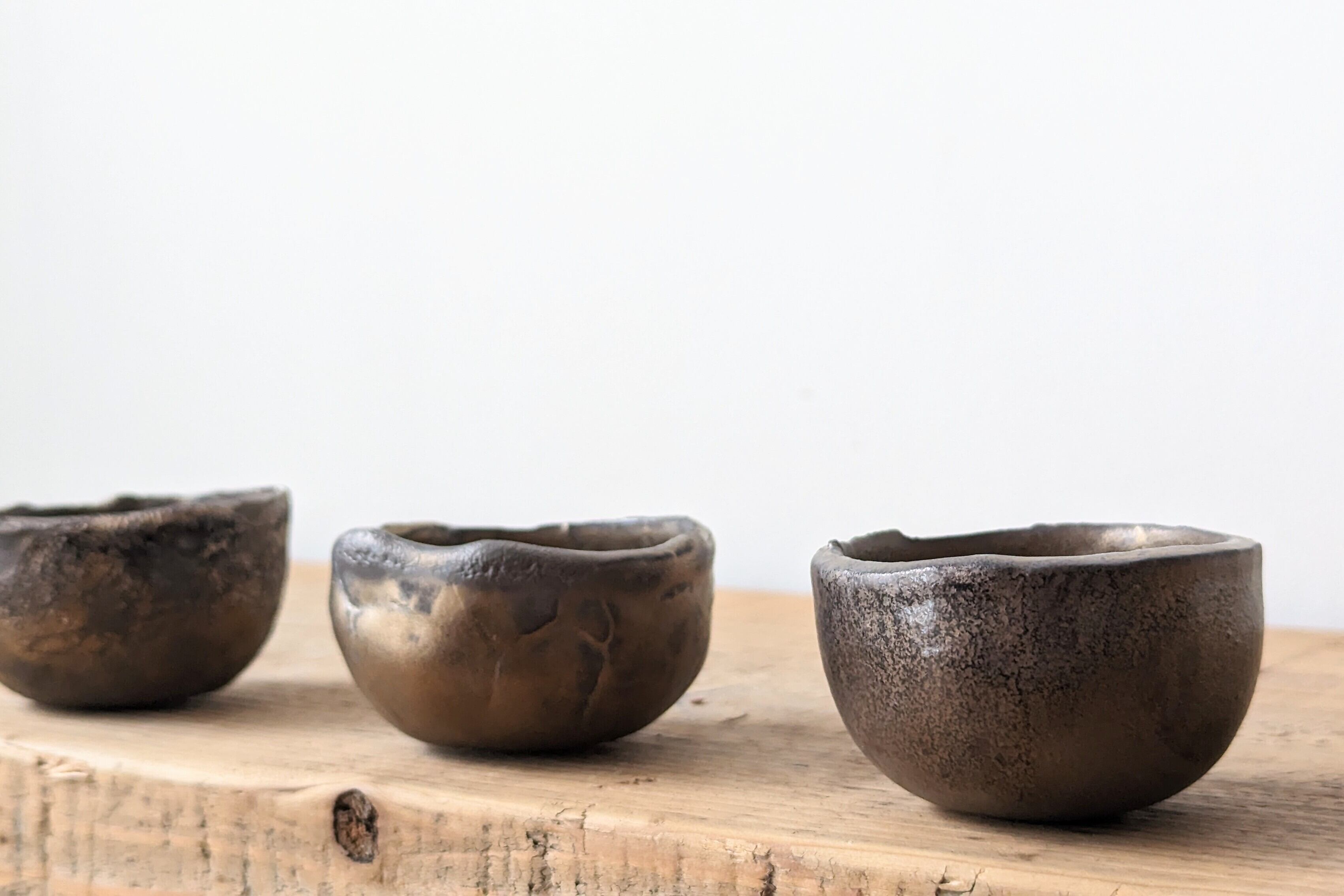 小さなお椀型に成型した陶土に模様を施し、釉薬で仕上げました。クラシックゴールドが渋くも豪華な雰囲気があり、実生や小さな植物を入れると存在感のある仕立てになります。