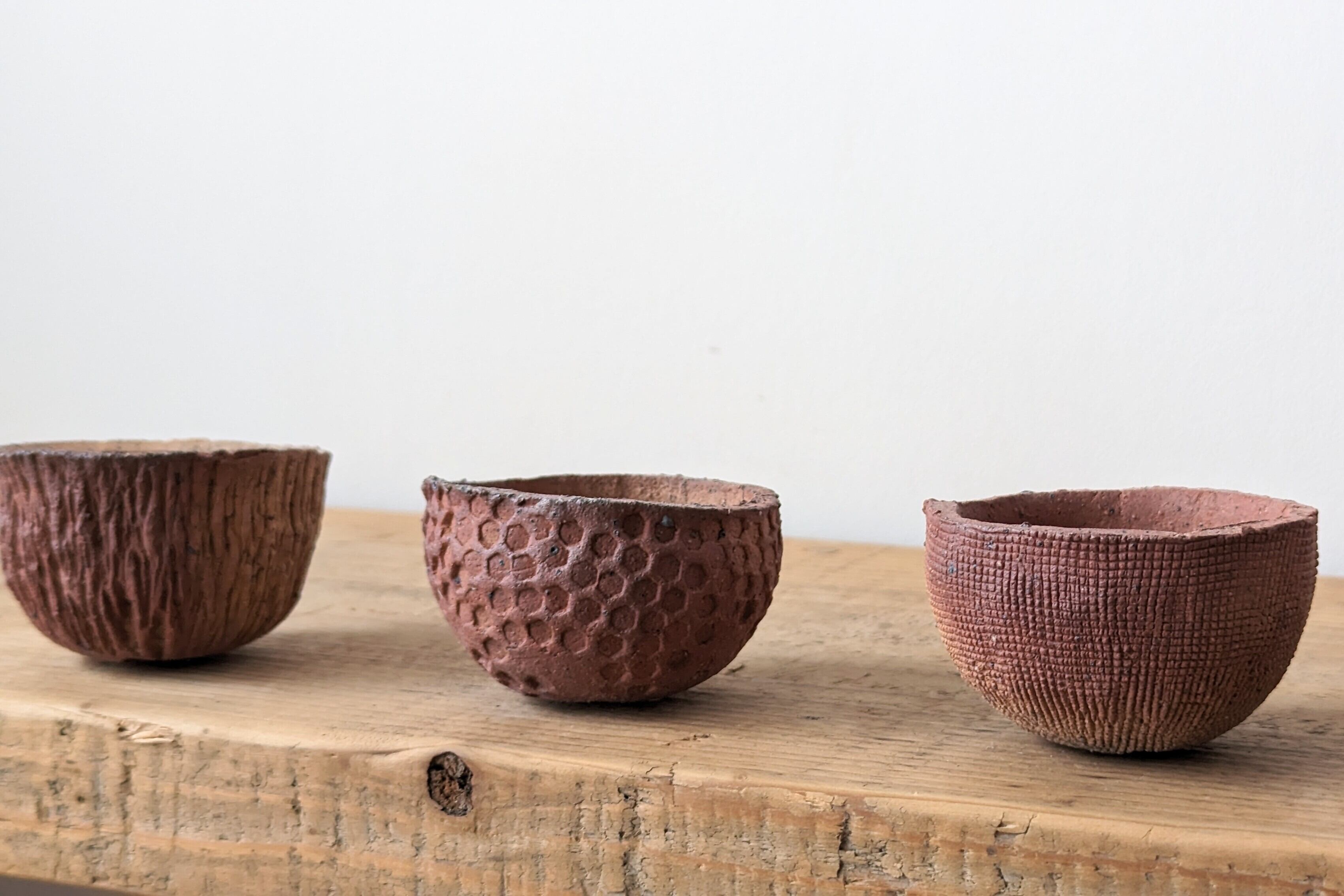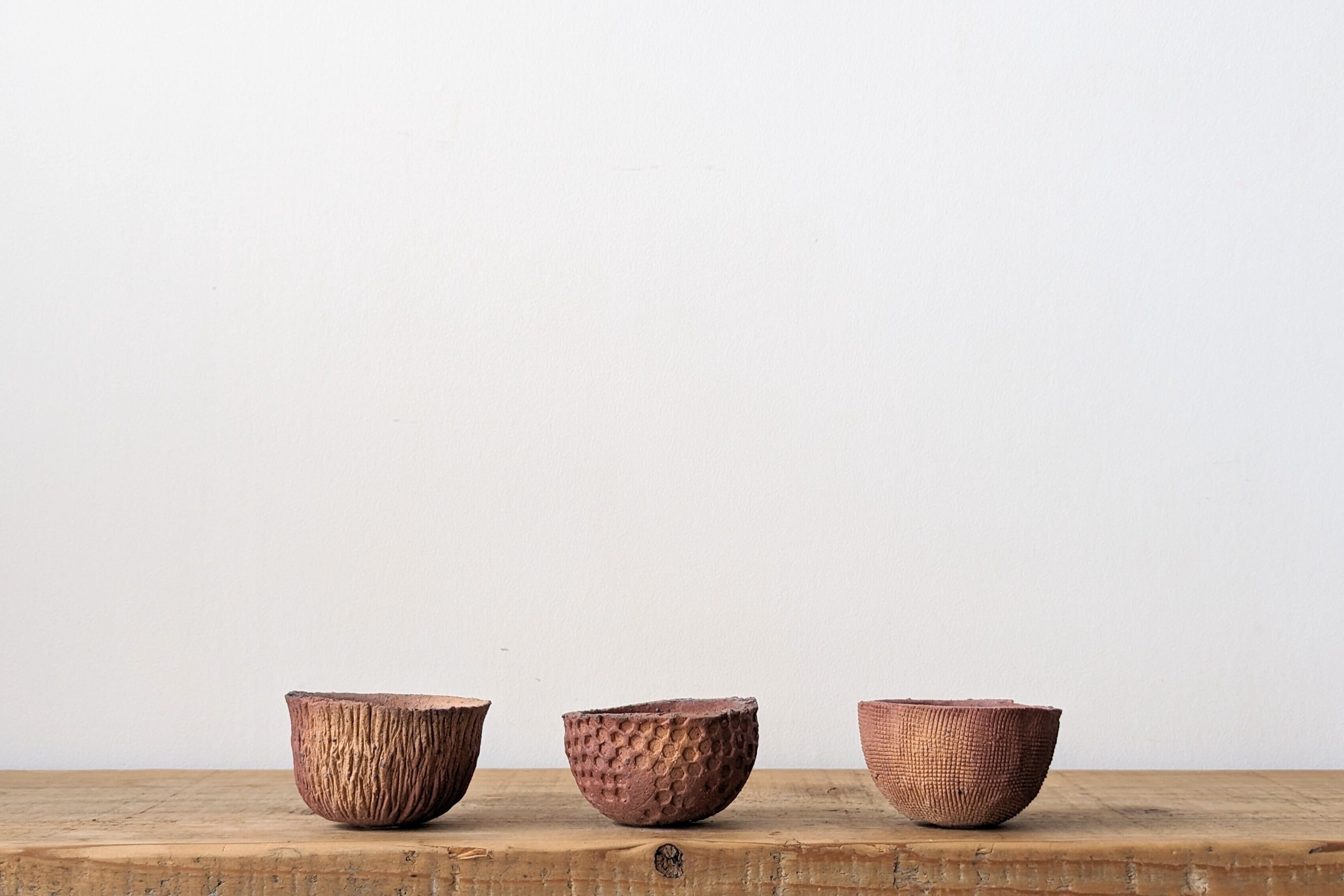 小さなお椀型に成型した陶土に模様を施し、炭で燻し釉仕上げました。炭で燻した際の影響度合いが一つ一つで異なる雰囲気を出しています。土器のような温かみのある器です。実生や小さな植物を入れると存在感のある仕立てになります。