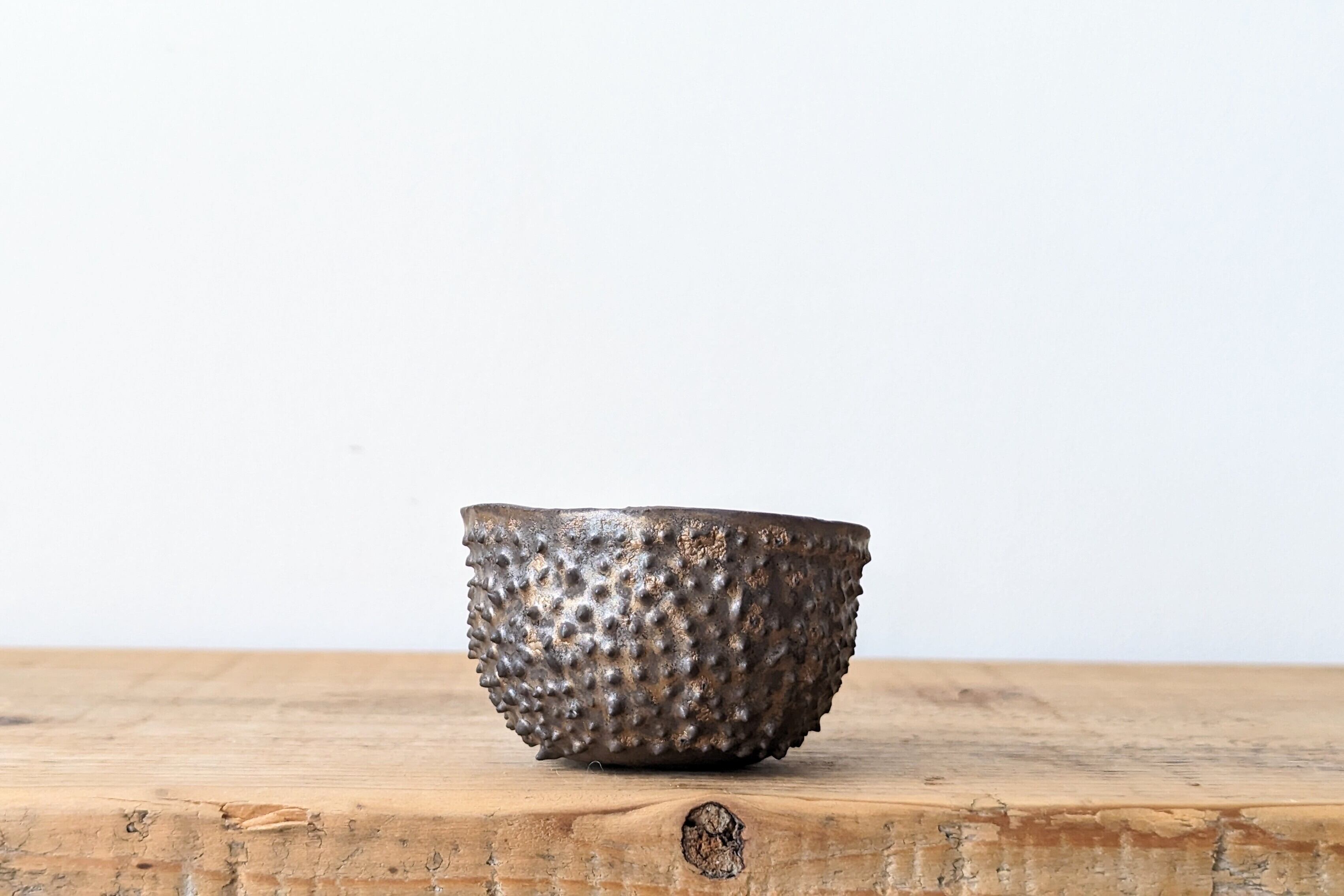 小さなお椀型に成型した陶土に模様を施し、釉薬で仕上げました。クラシックゴールドが渋くも豪華な雰囲気があり、実生や小さな植物を入れると存在感のある仕立てになります。