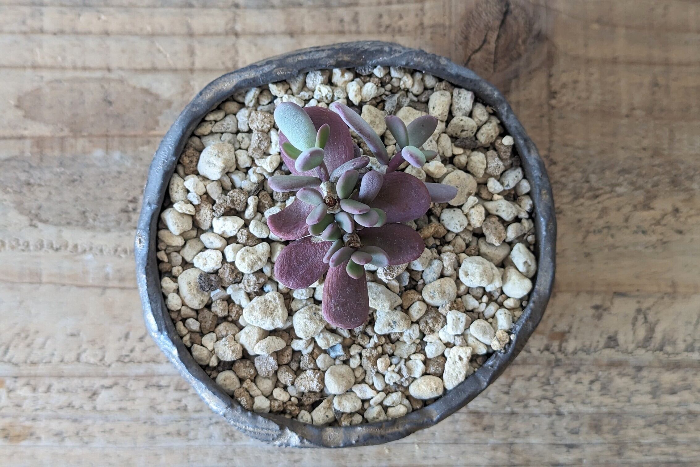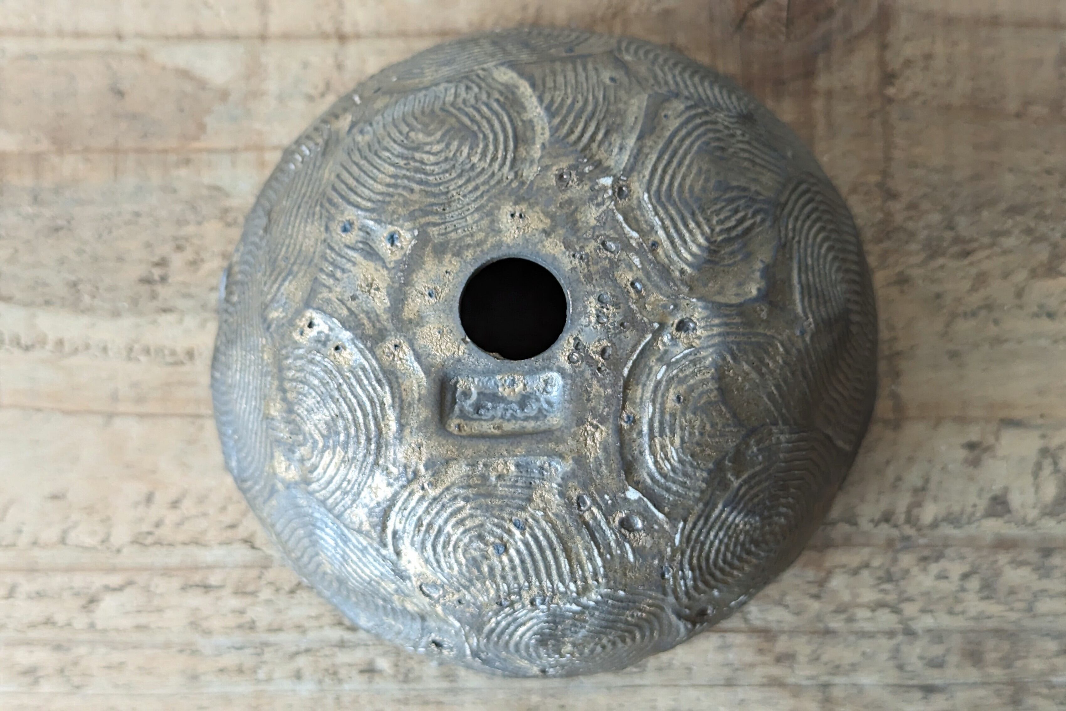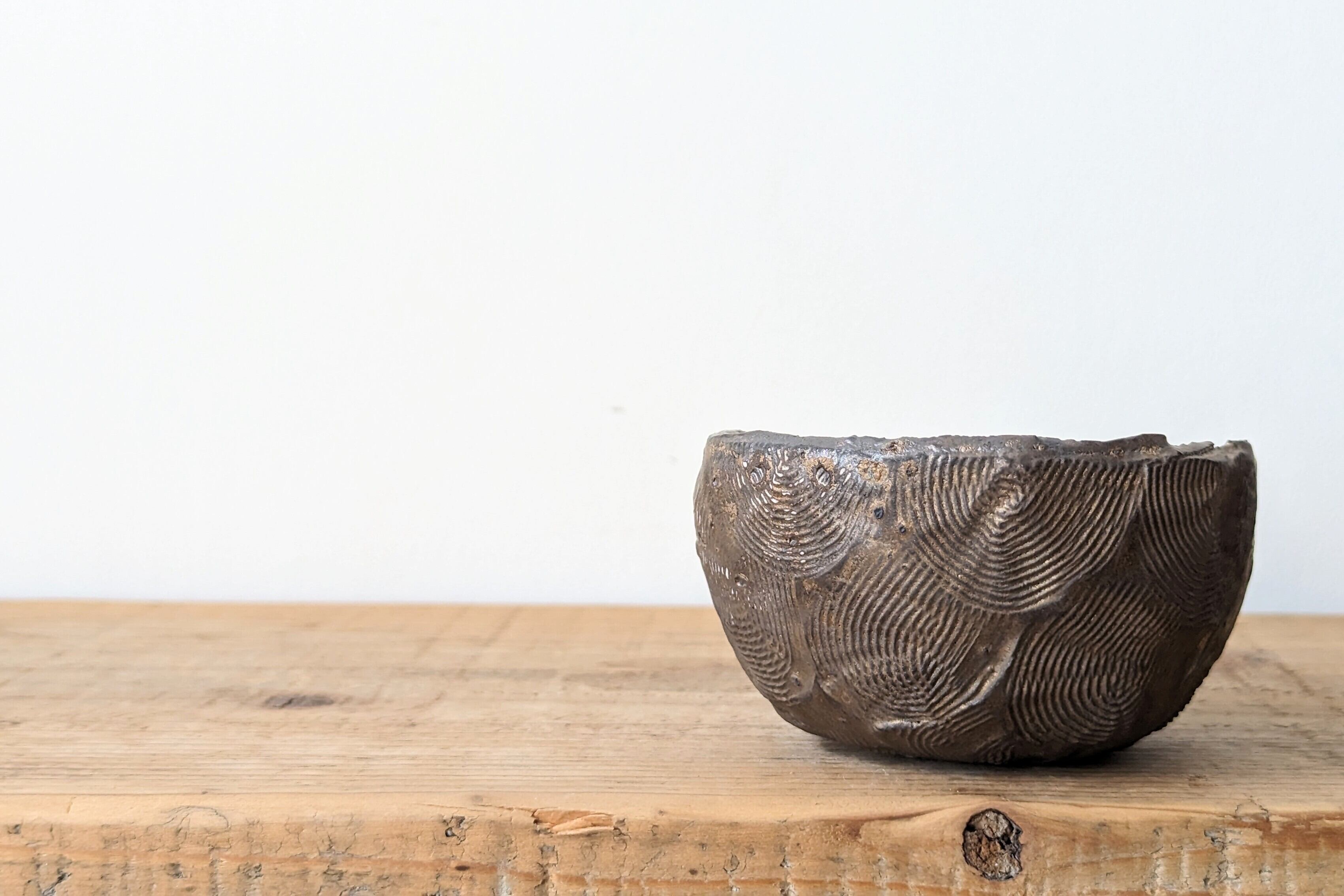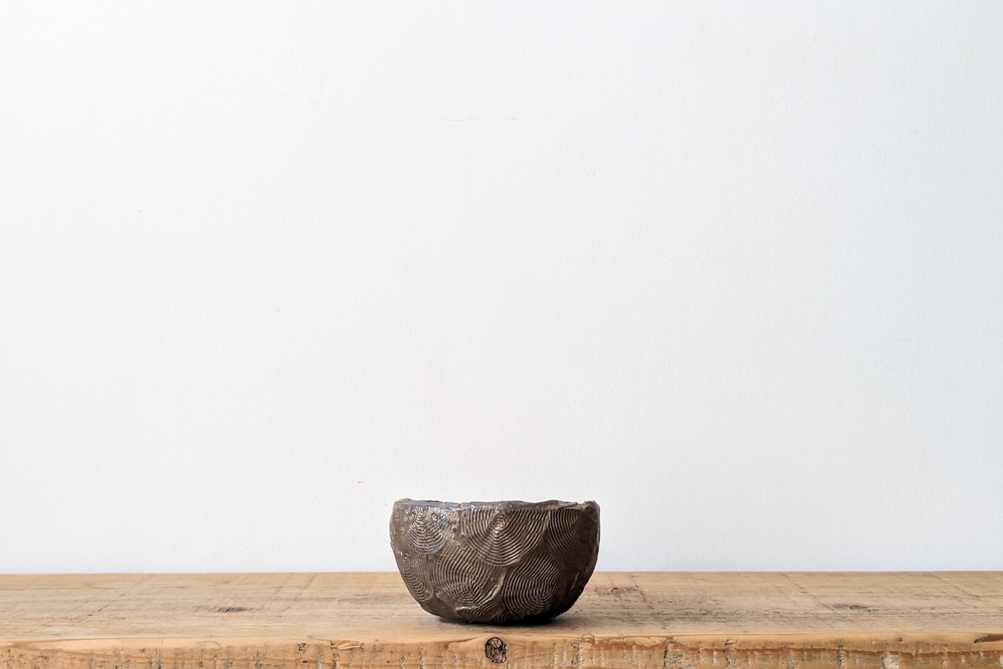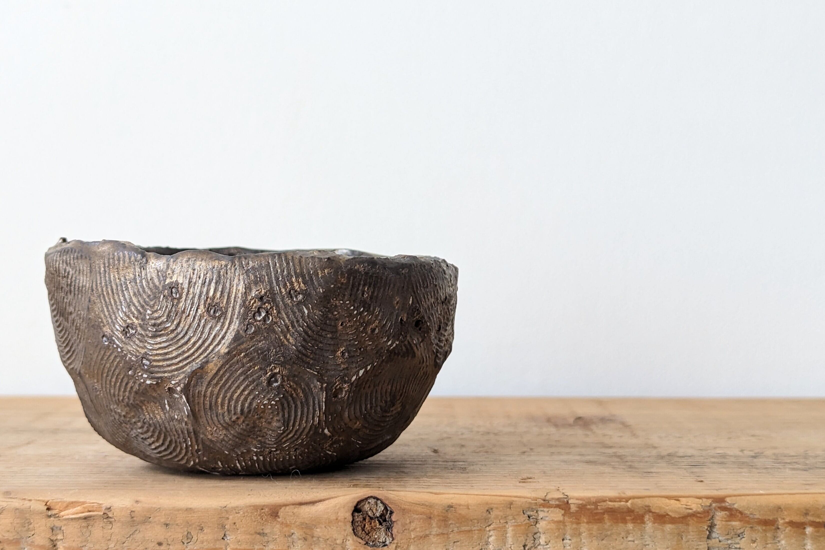 半円型に成型した陶土に模様を施し、釉薬で仕上げました。クラシックゴールドが渋くも豪華な雰囲気があり、実生や小さな植物を入れると存在感のある仕立てになります。