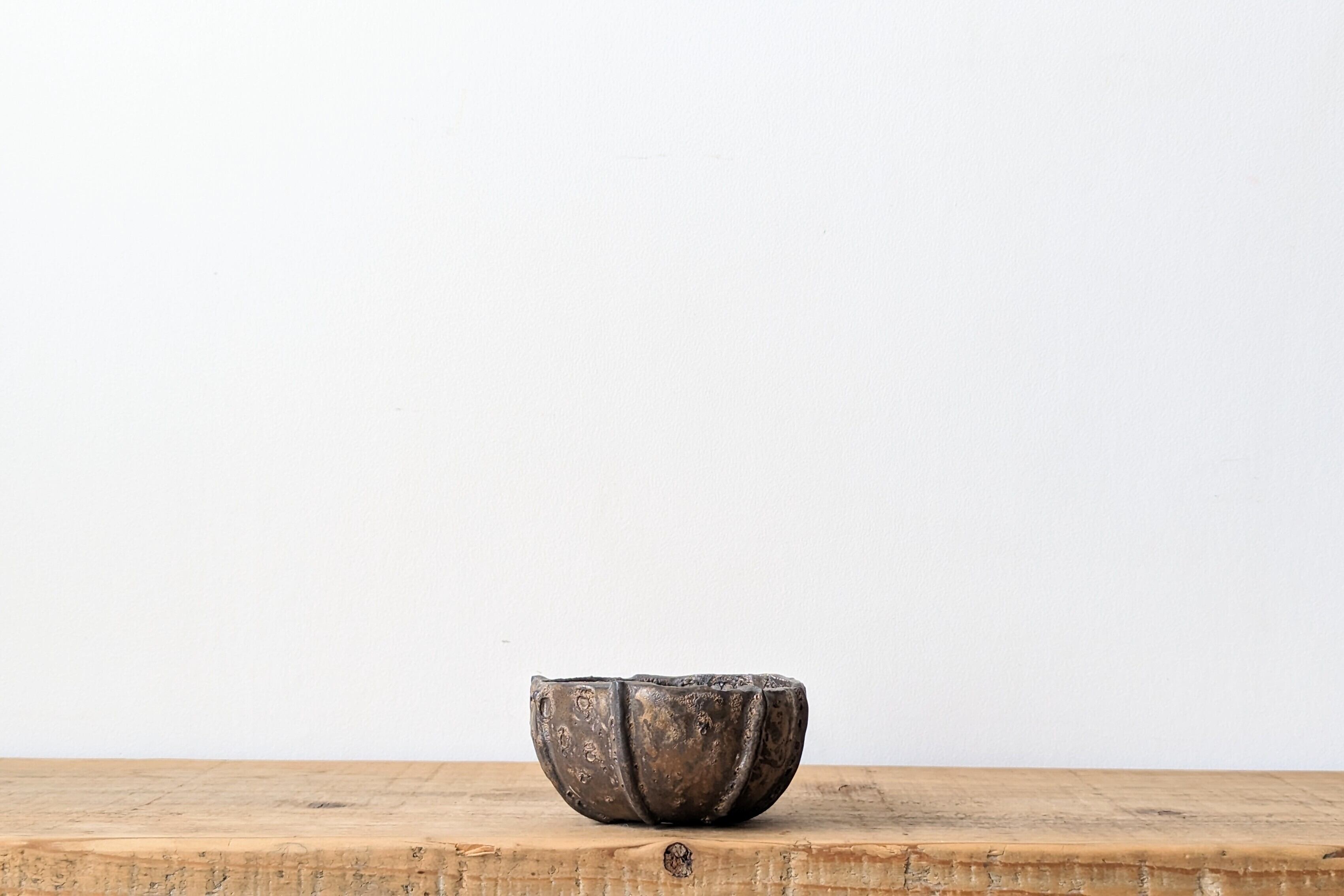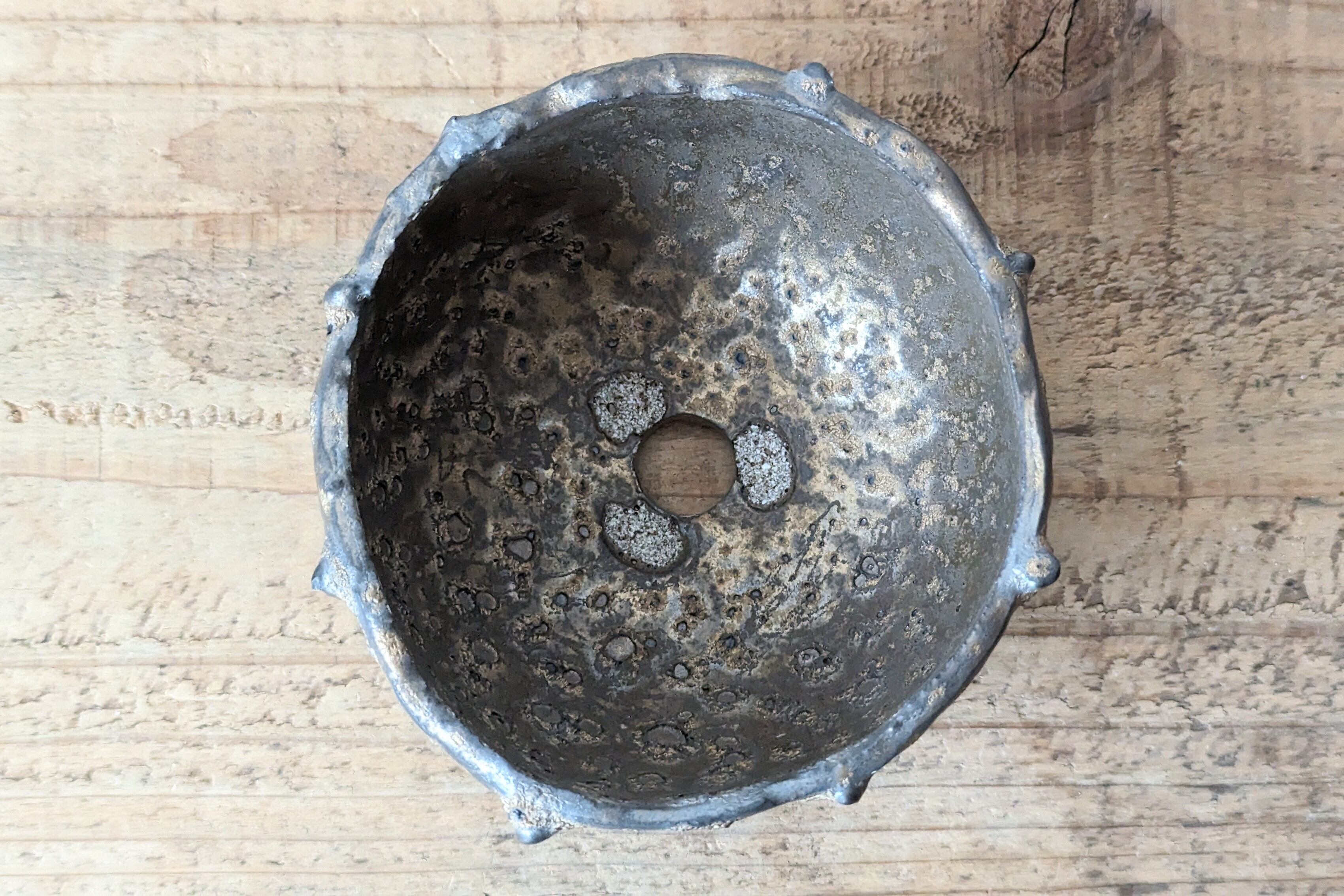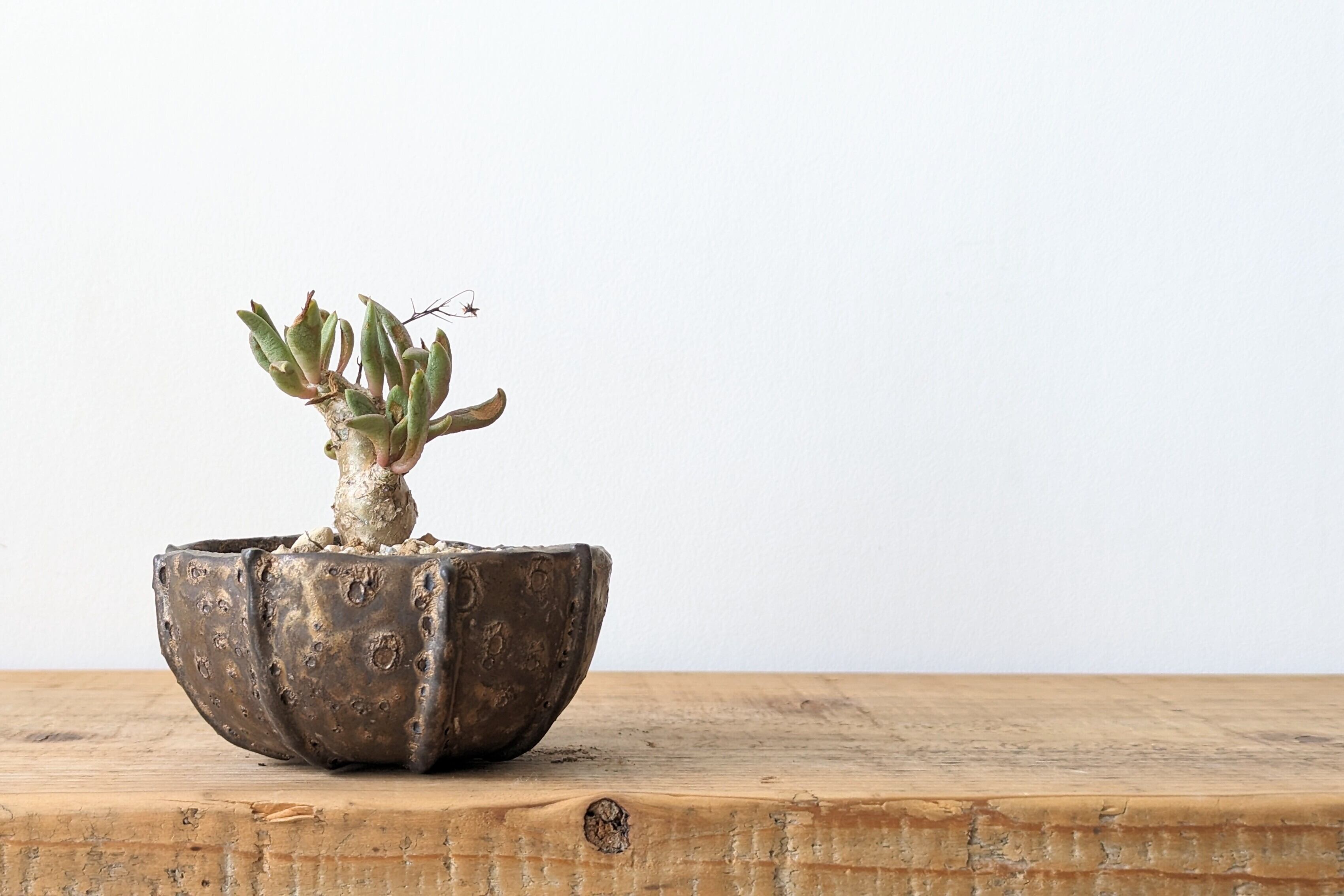 半円型に成型した陶土に模様を施し、釉薬で仕上げました。クラシックゴールドが渋くも豪華な雰囲気があり、実生や小さな植物を入れると存在感のある仕立てになります。