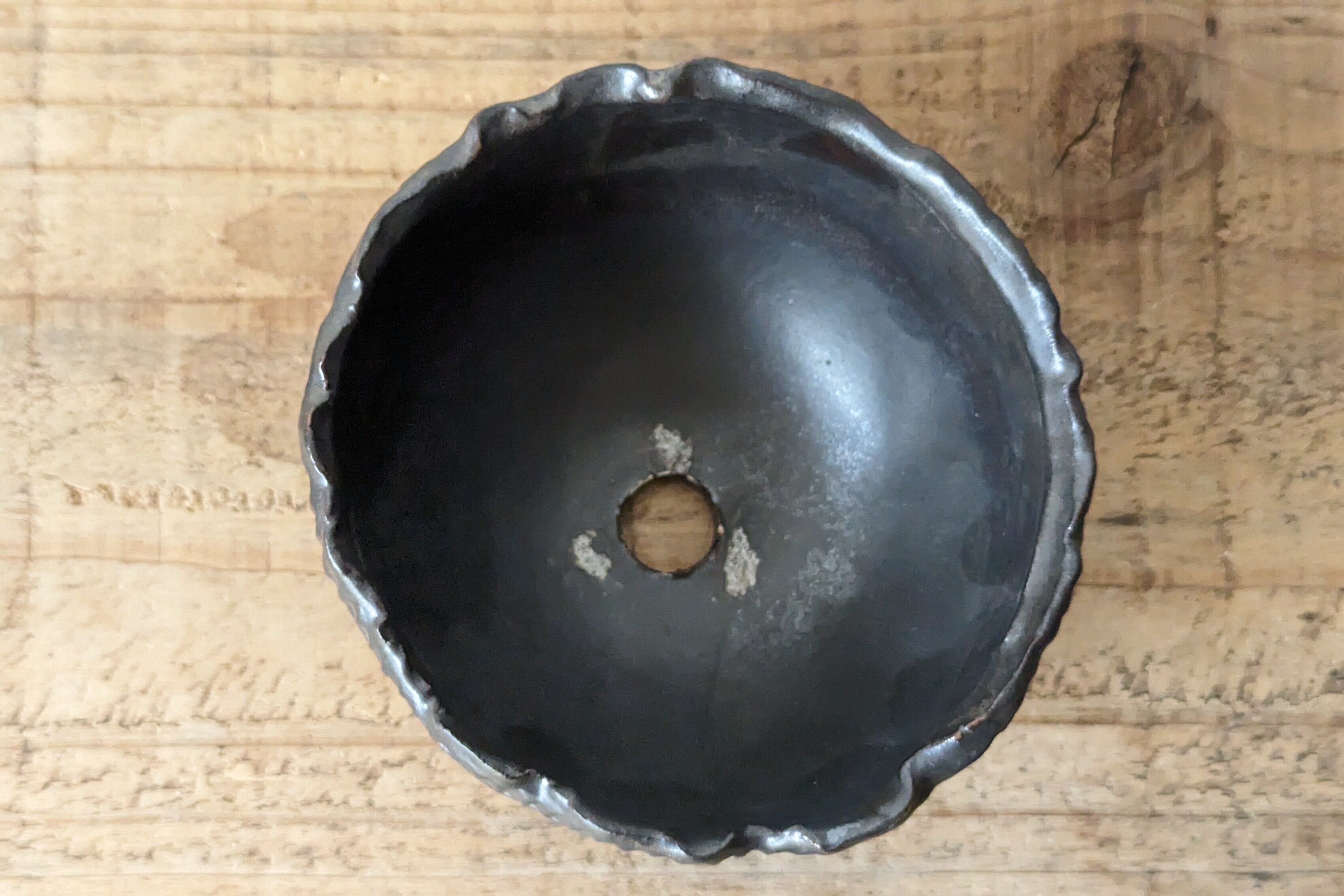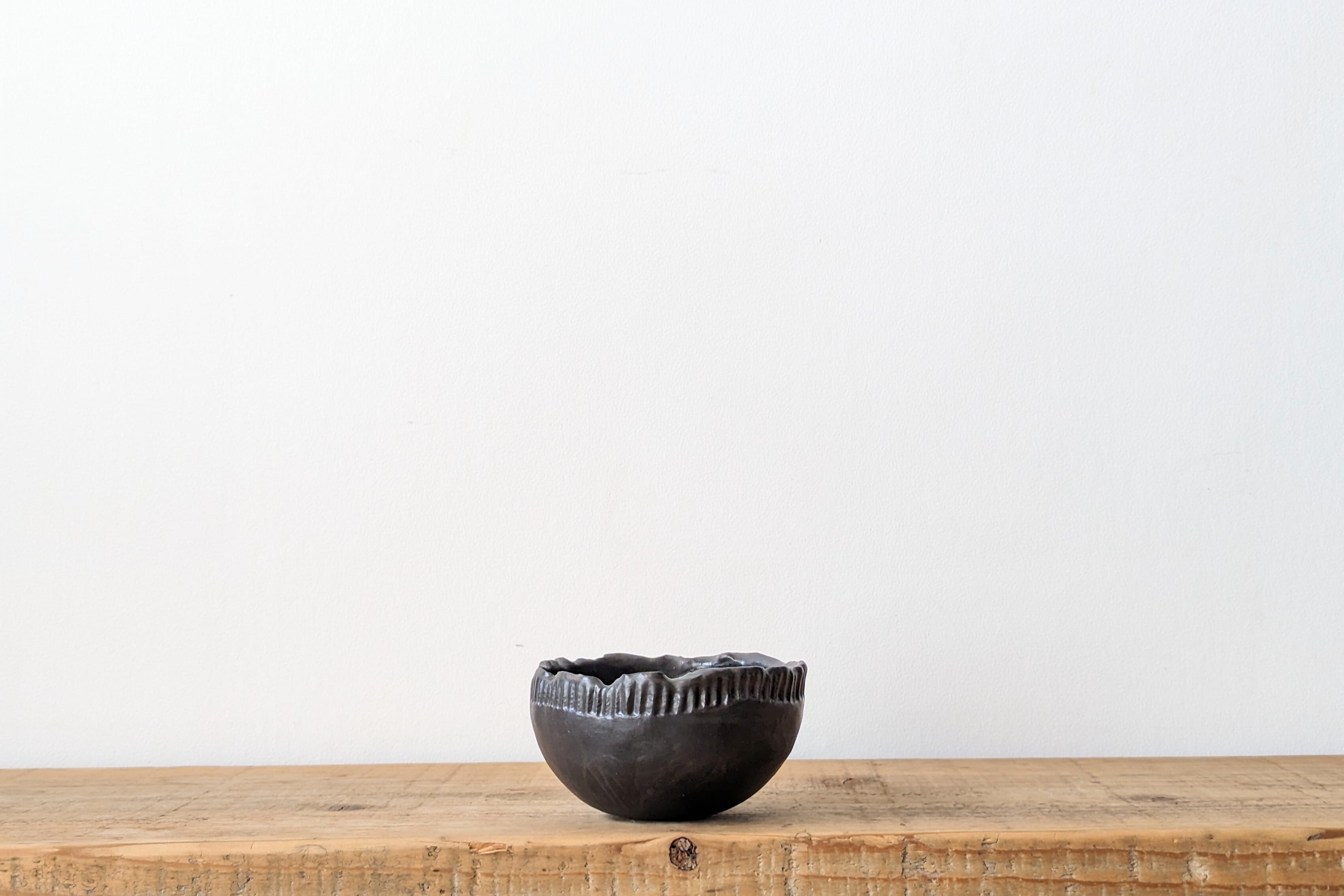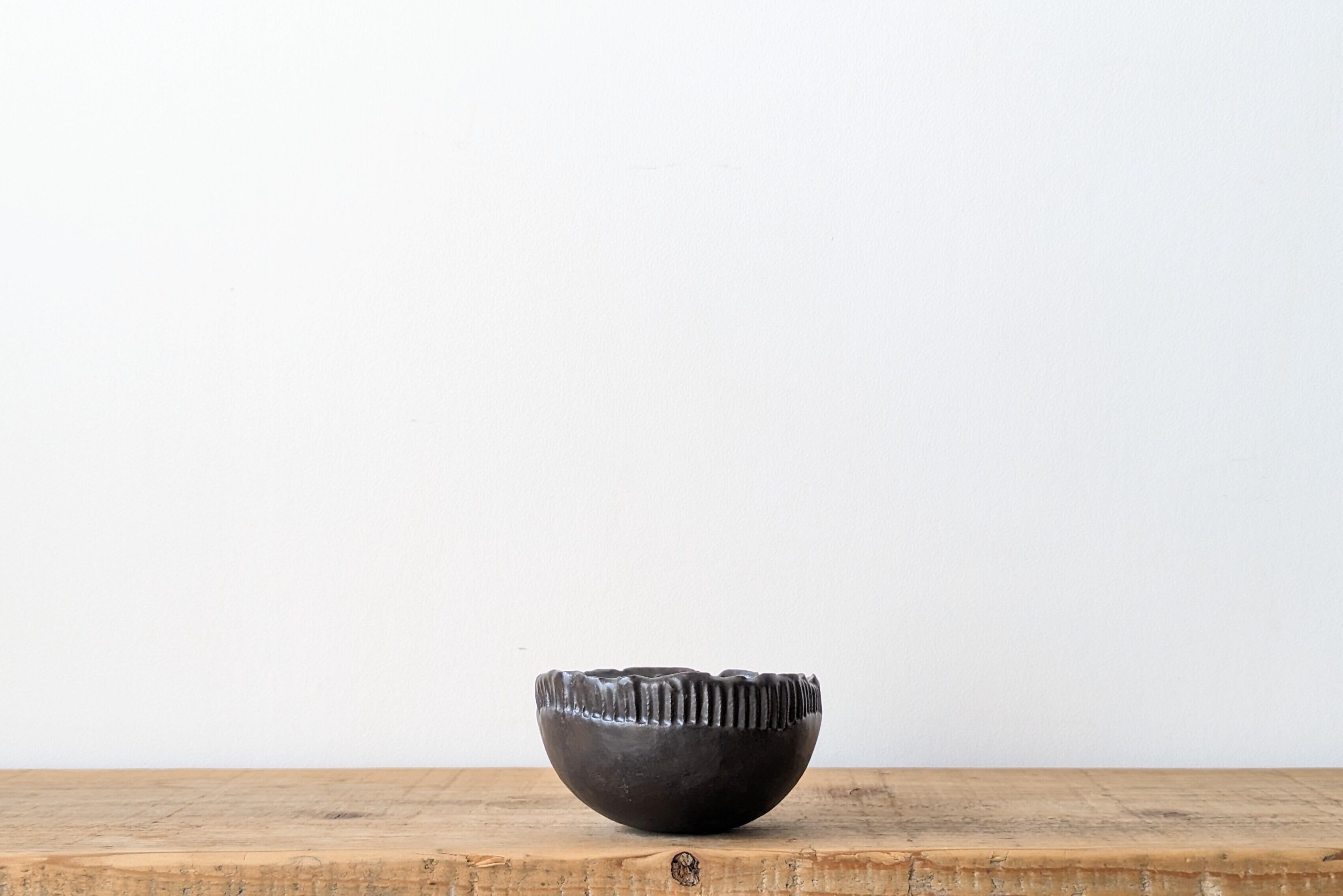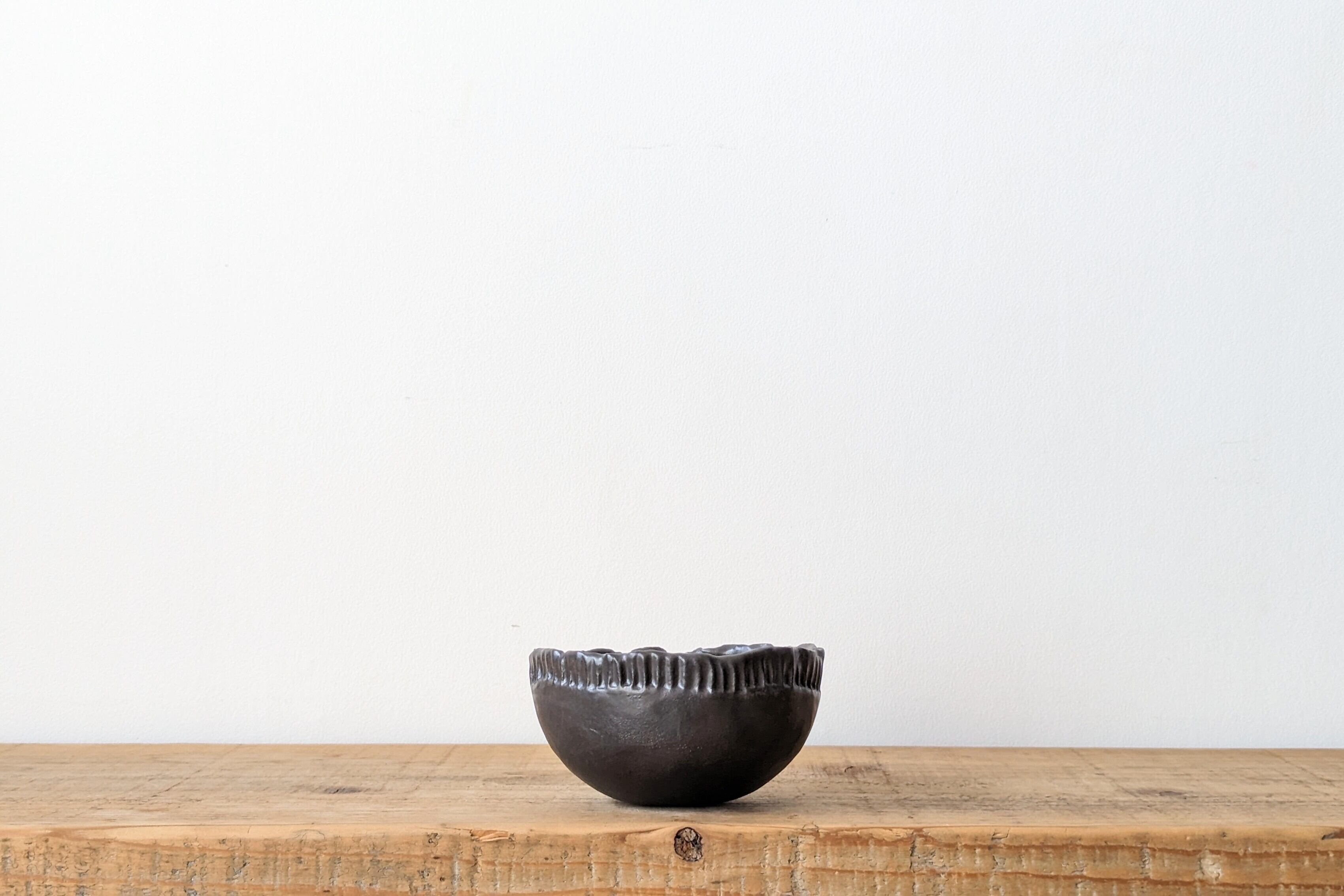 半円型に成型した陶土に模様を施し、釉薬で仕上げました。どんな植物にも合うブラックでシックな仕上がりになっています。実生や小さな植物を入れると存在感のある仕立てになります。