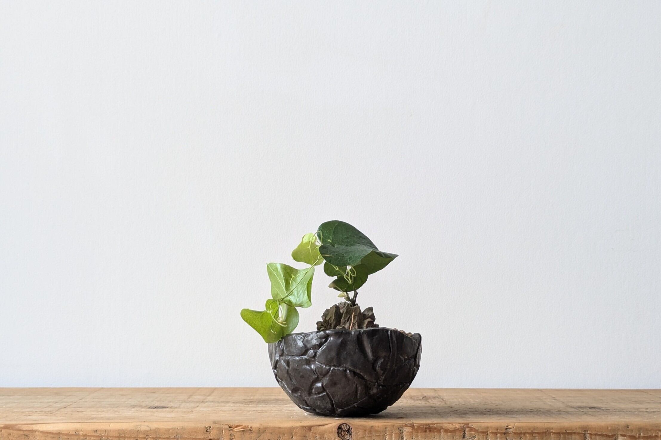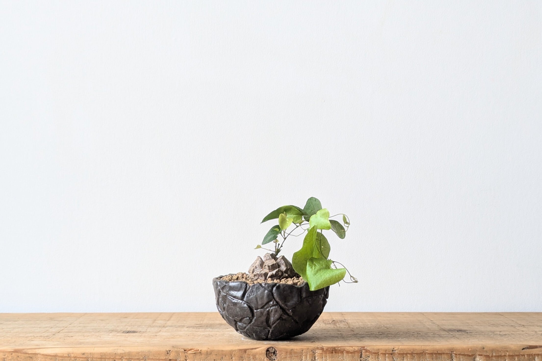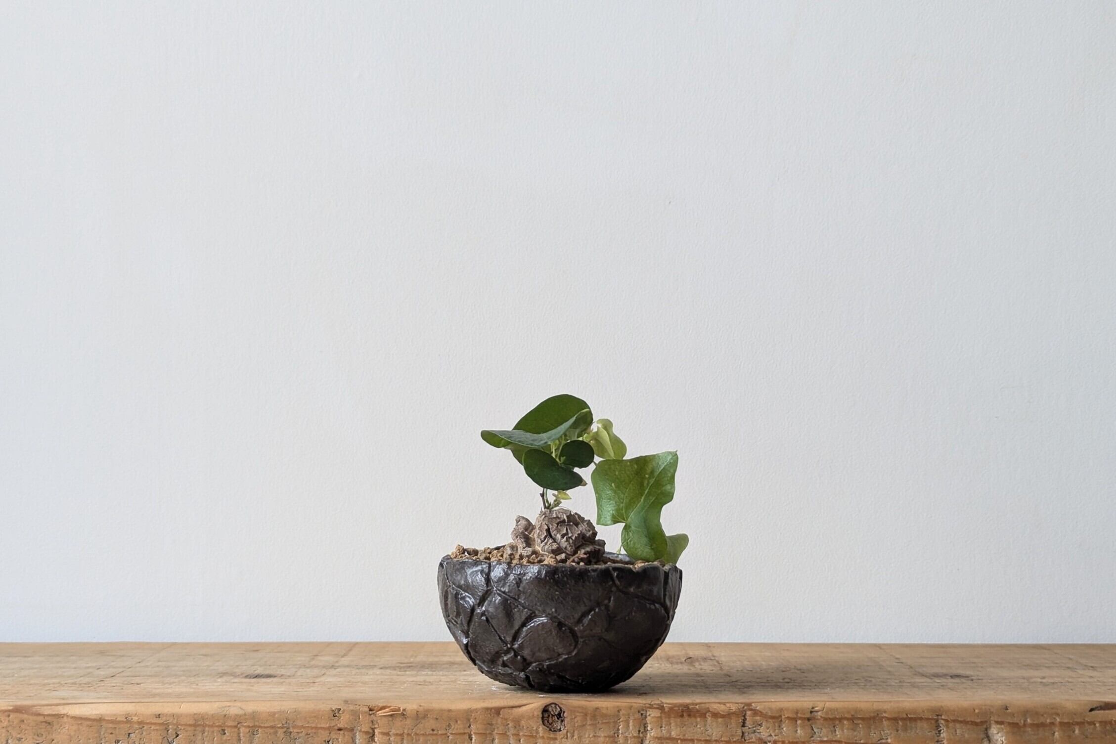 半円型に成型した陶土に模様を施し、釉薬で仕上げました。どんな植物にも合うブラックでシックな仕上がりになっています。実生や小さな植物を入れると存在感のある仕立てになります。