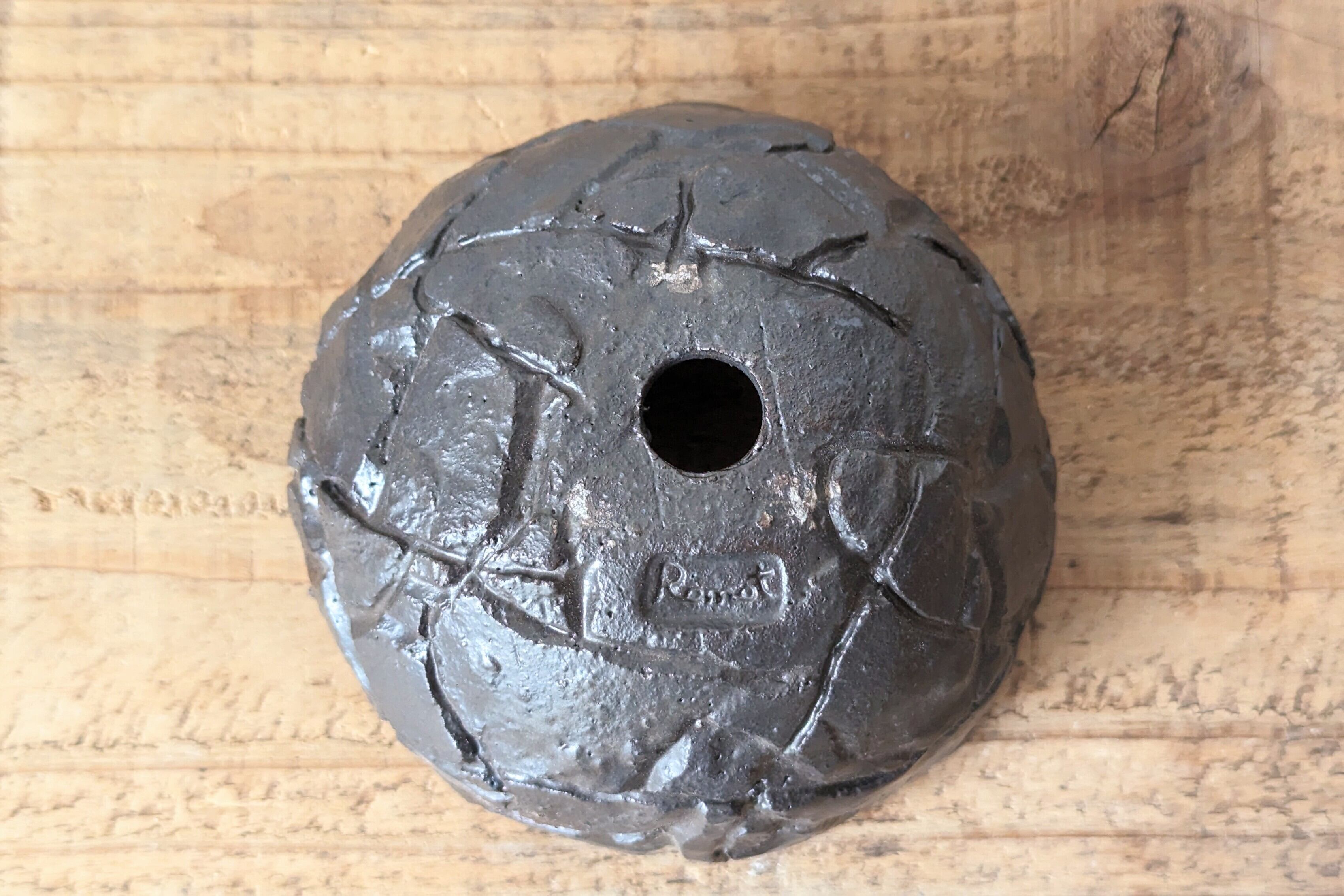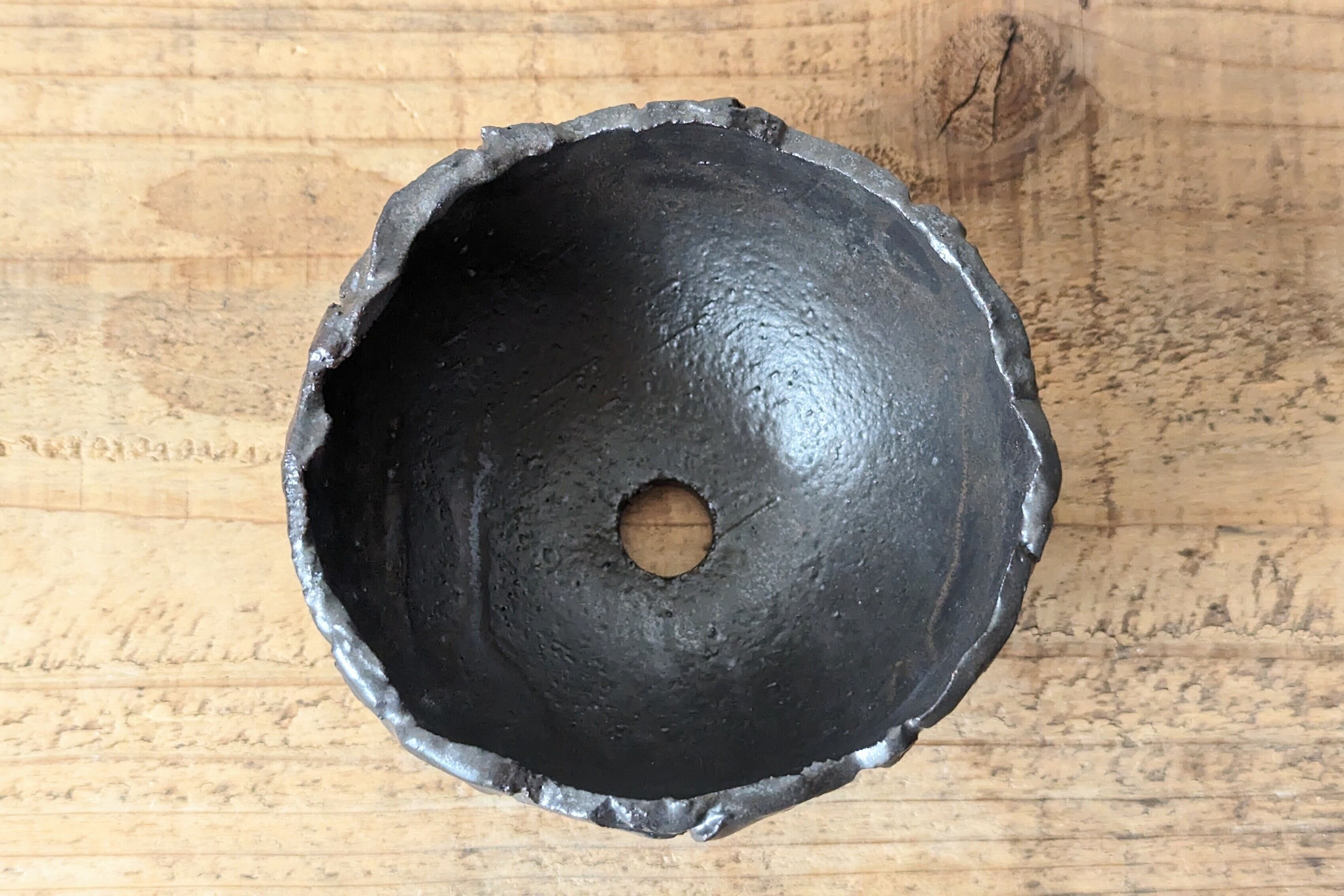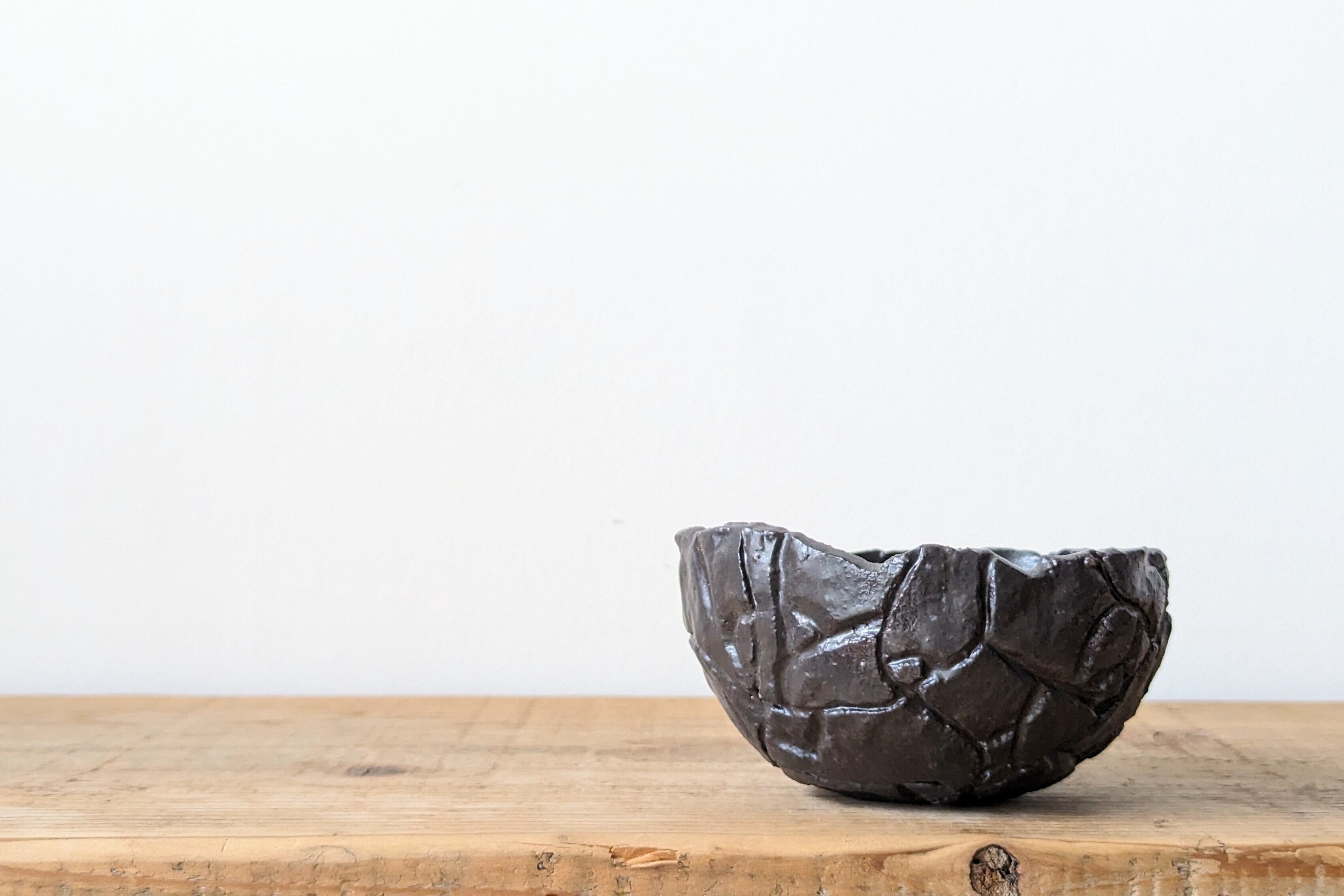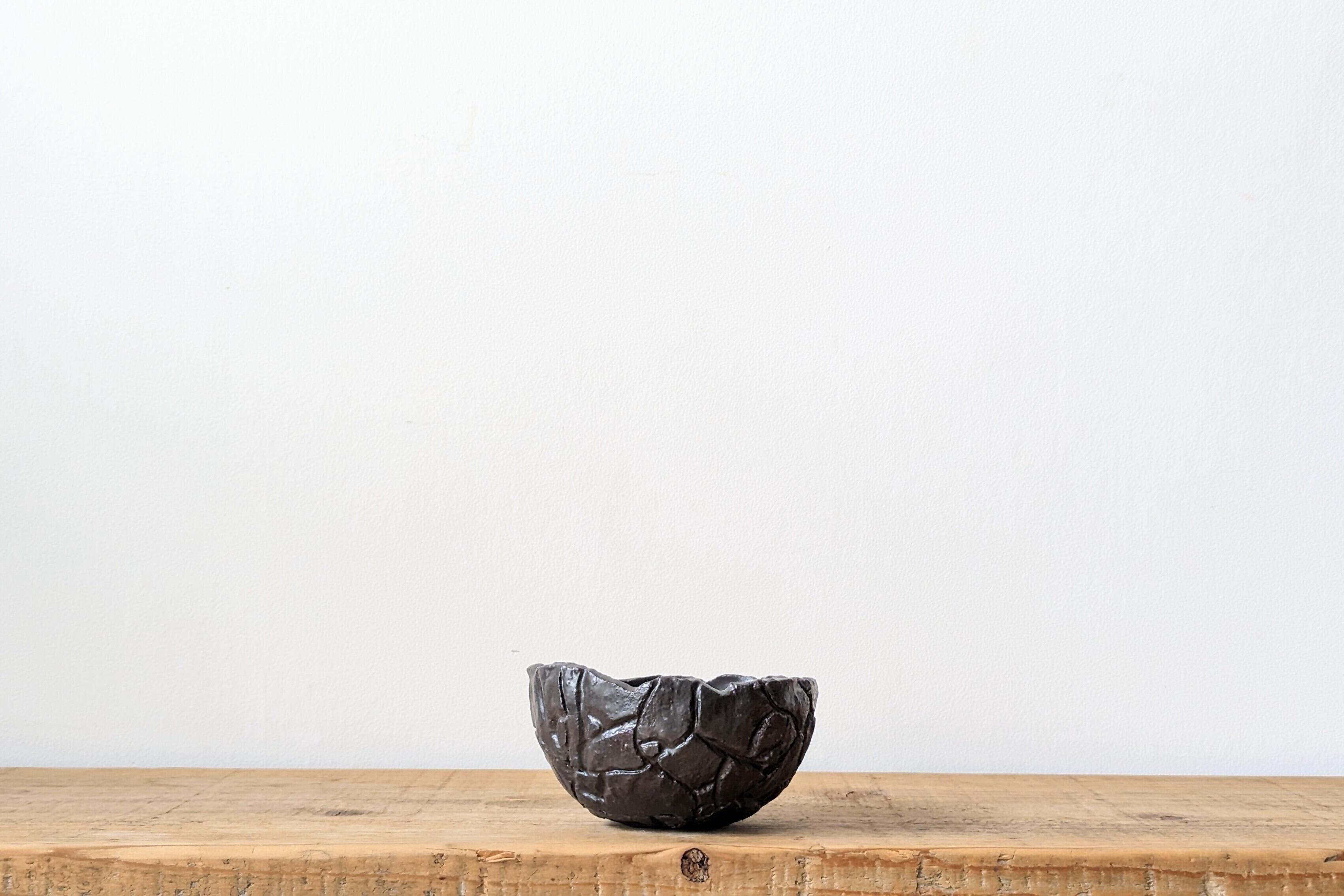 半円型に成型した陶土に模様を施し、釉薬で仕上げました。どんな植物にも合うブラックでシックな仕上がりになっています。実生や小さな植物を入れると存在感のある仕立てになります。