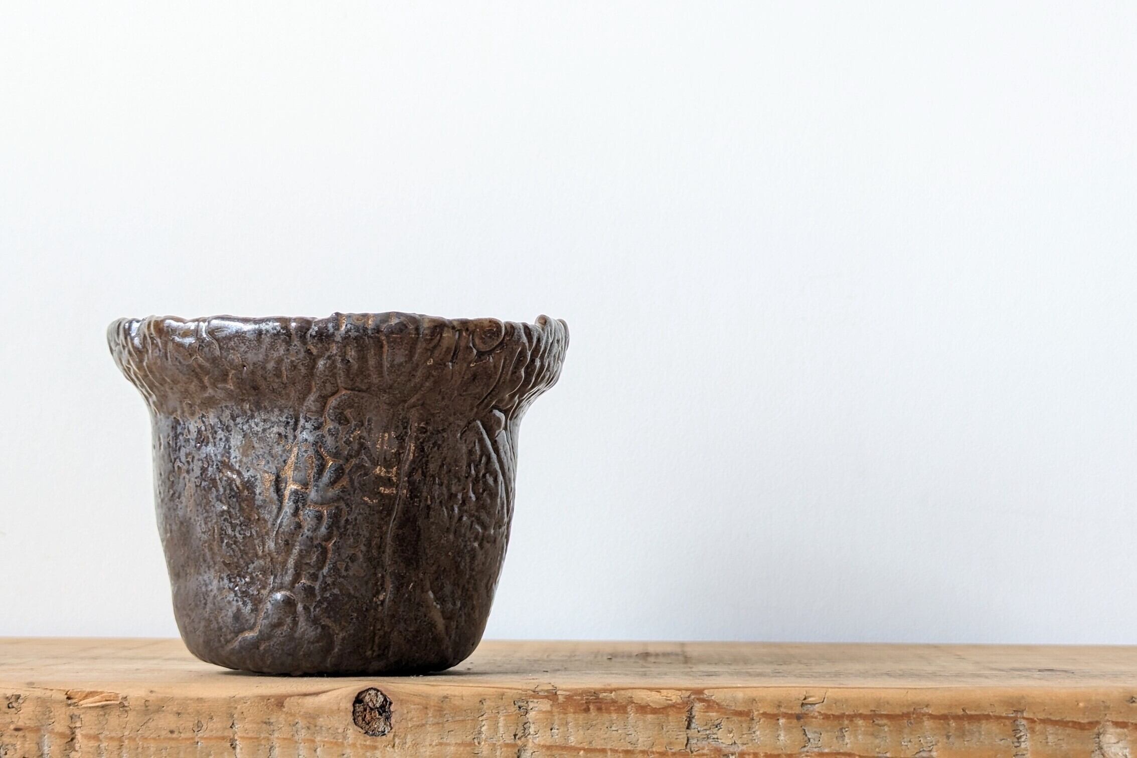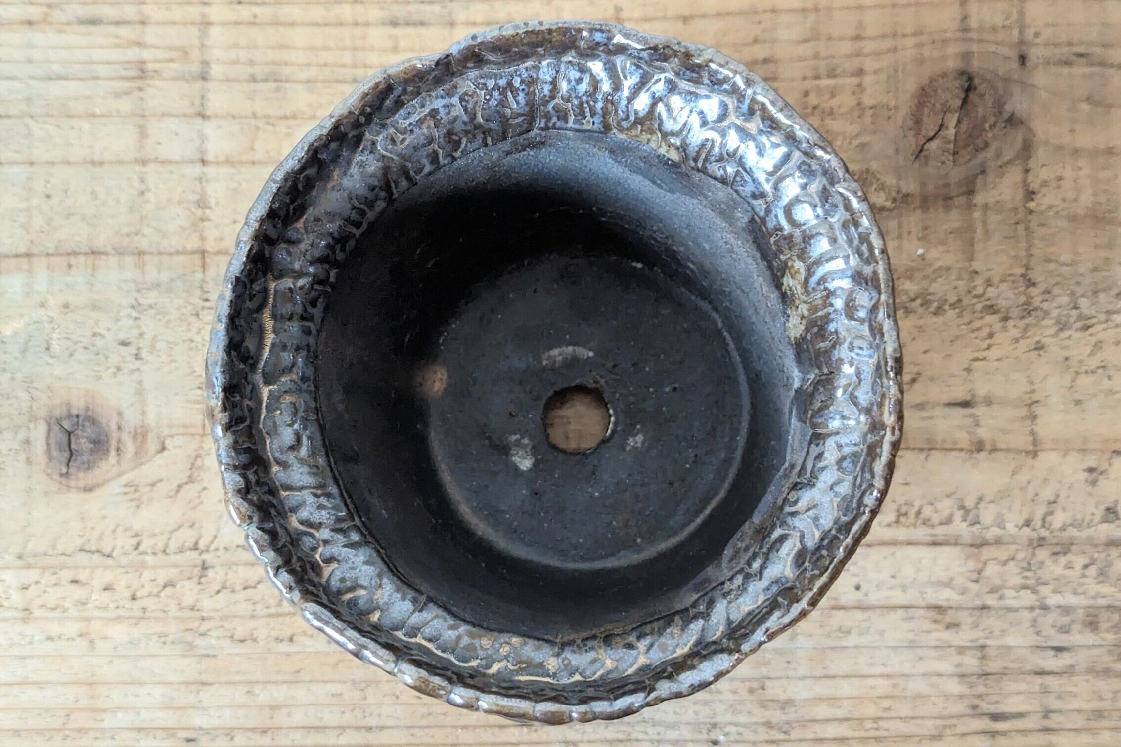 球型に成型した陶土に特殊な釉薬を施し、デコボコの質感にしたあと、釉薬で仕上げました。不思議な手触りと向きによって現れる金色の筋が神秘的な器です。