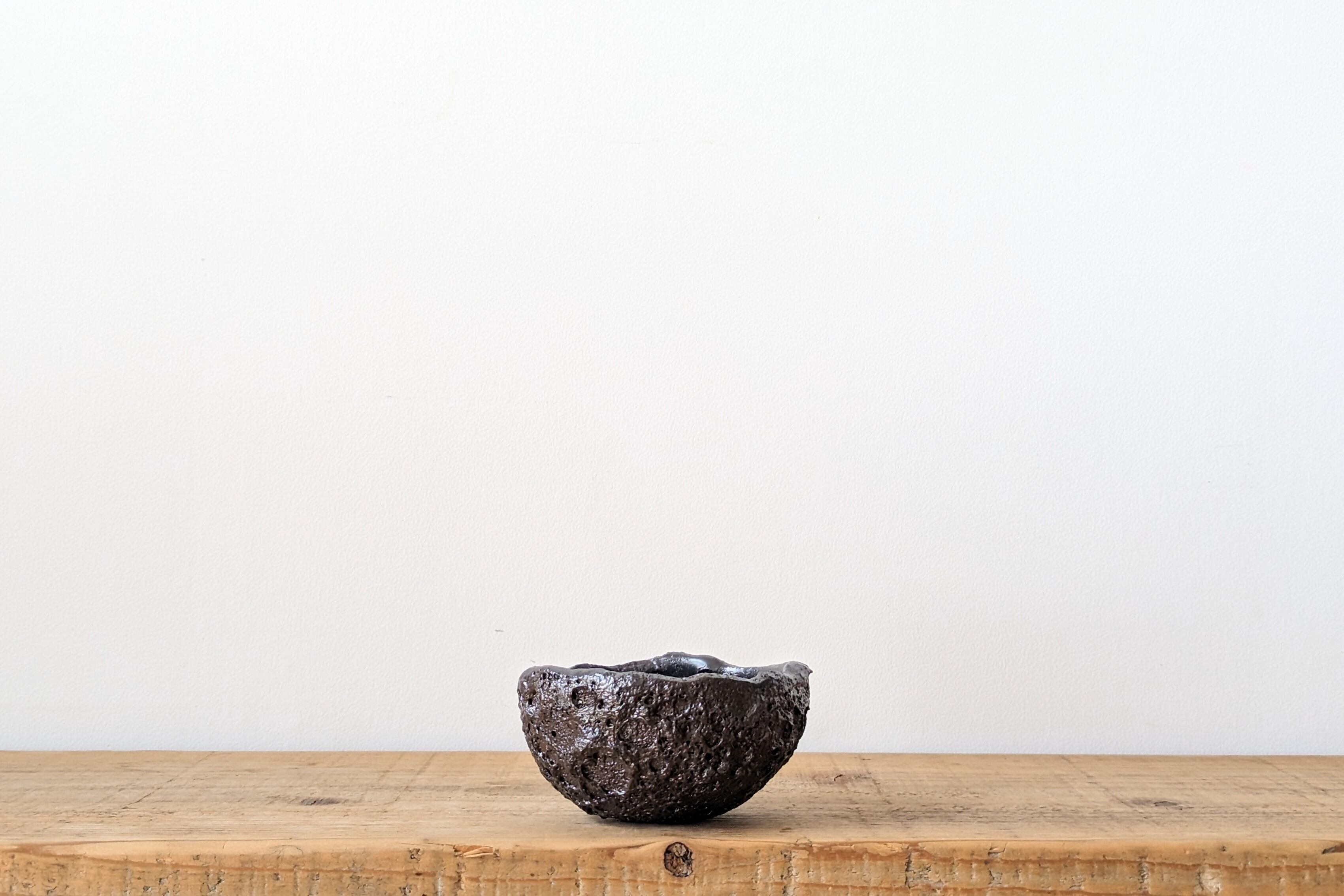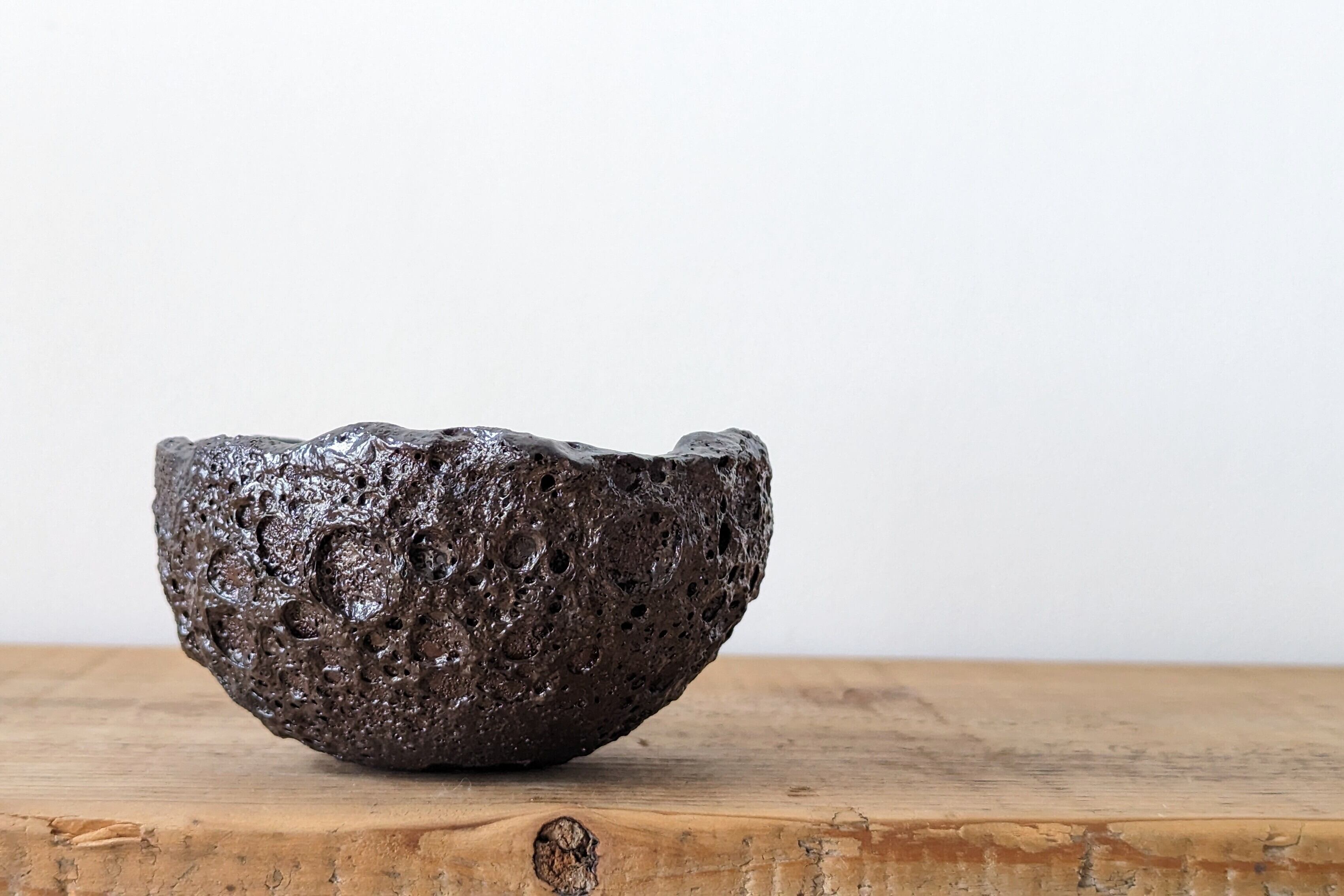 半円に成型した陶土に特殊な釉薬を施し焼き上げました。溶岩の様な隕石のようなクレーターがあちこちに発生していて角度で全く異なる表情を見せてくれます