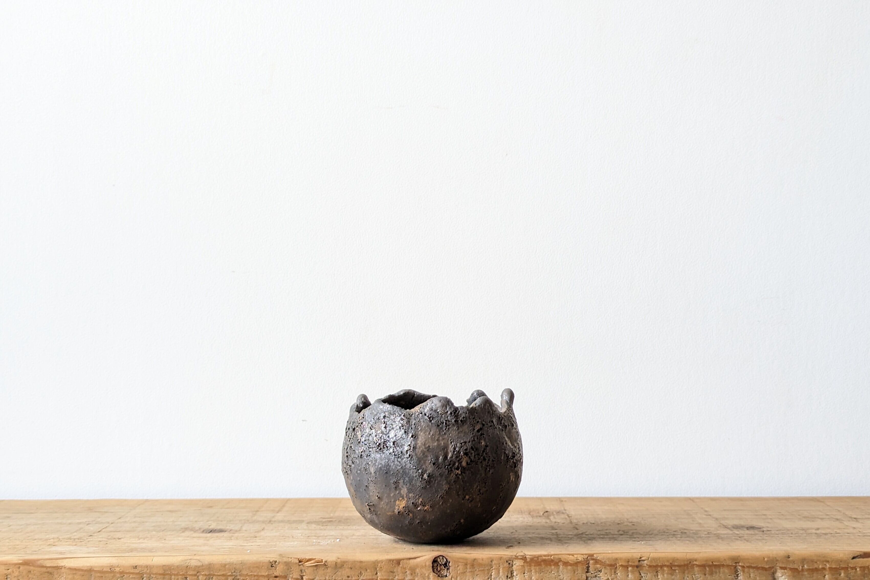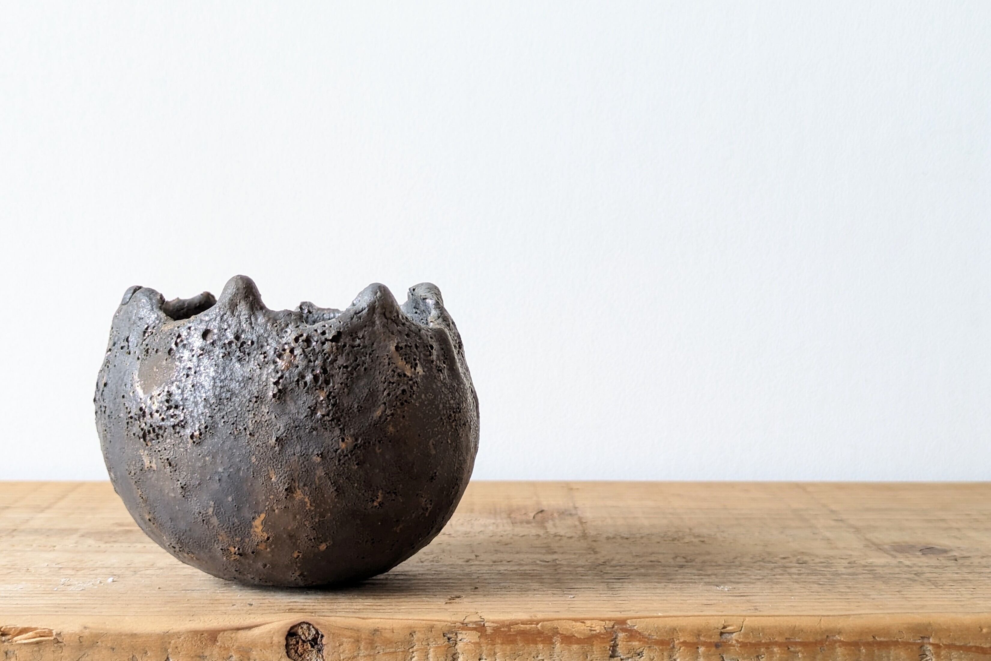 球型に成型した陶土に特殊な釉薬を施し焼き上げました。溶岩の様な隕石のようなクレーターがあちこちに発生していて角度で全く異なる表情を見せてくれます