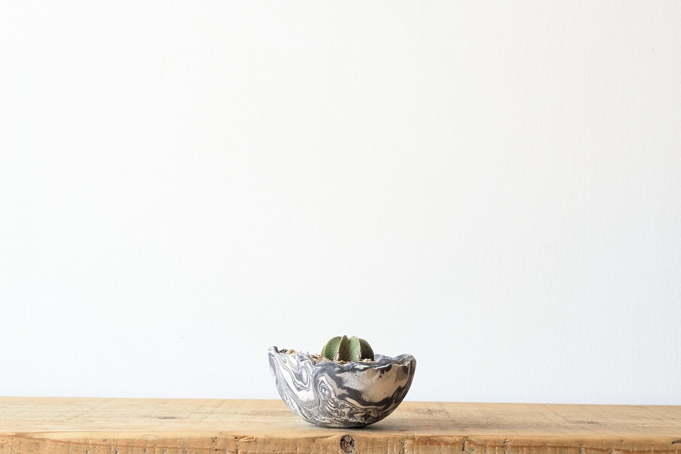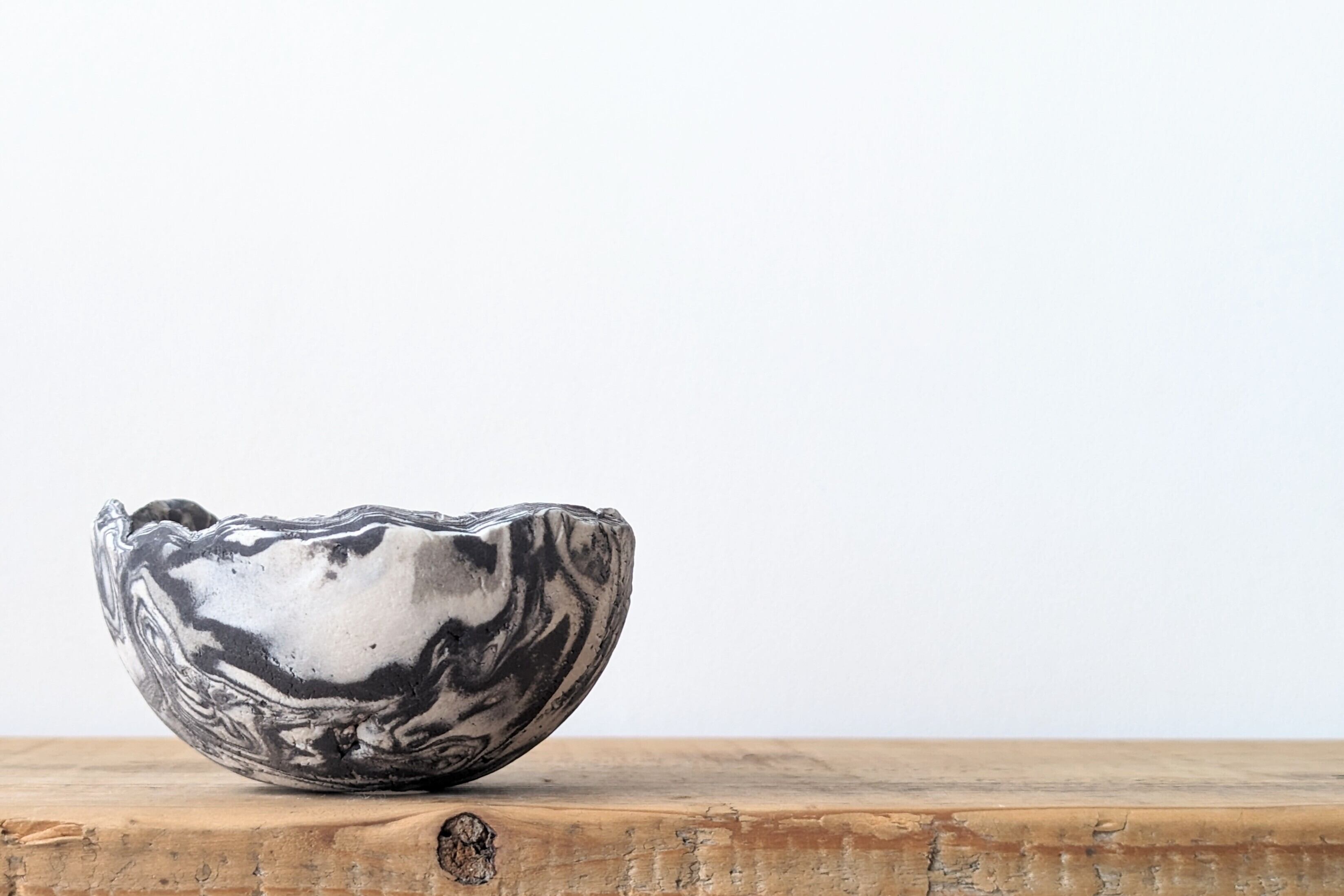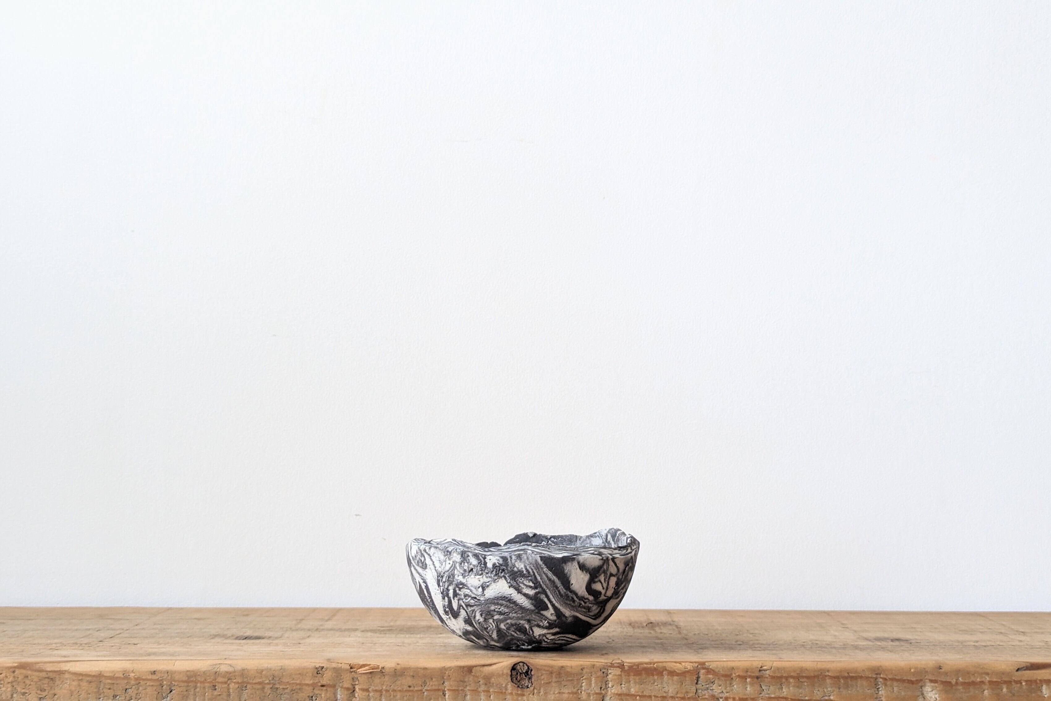 磁器土に黒い顔料を練り込みマーブル模様にした粘土を半円型に成型し仕上げました。年輪のような幾つもの線が見る角度で全く違った表情となり長い間楽しめる器です。