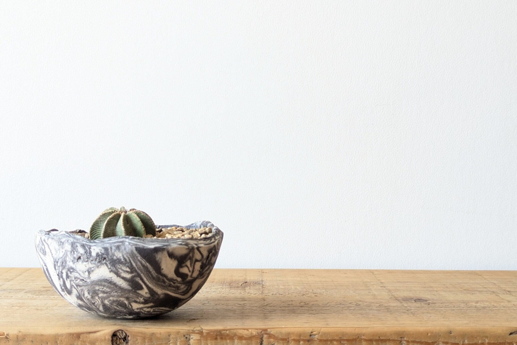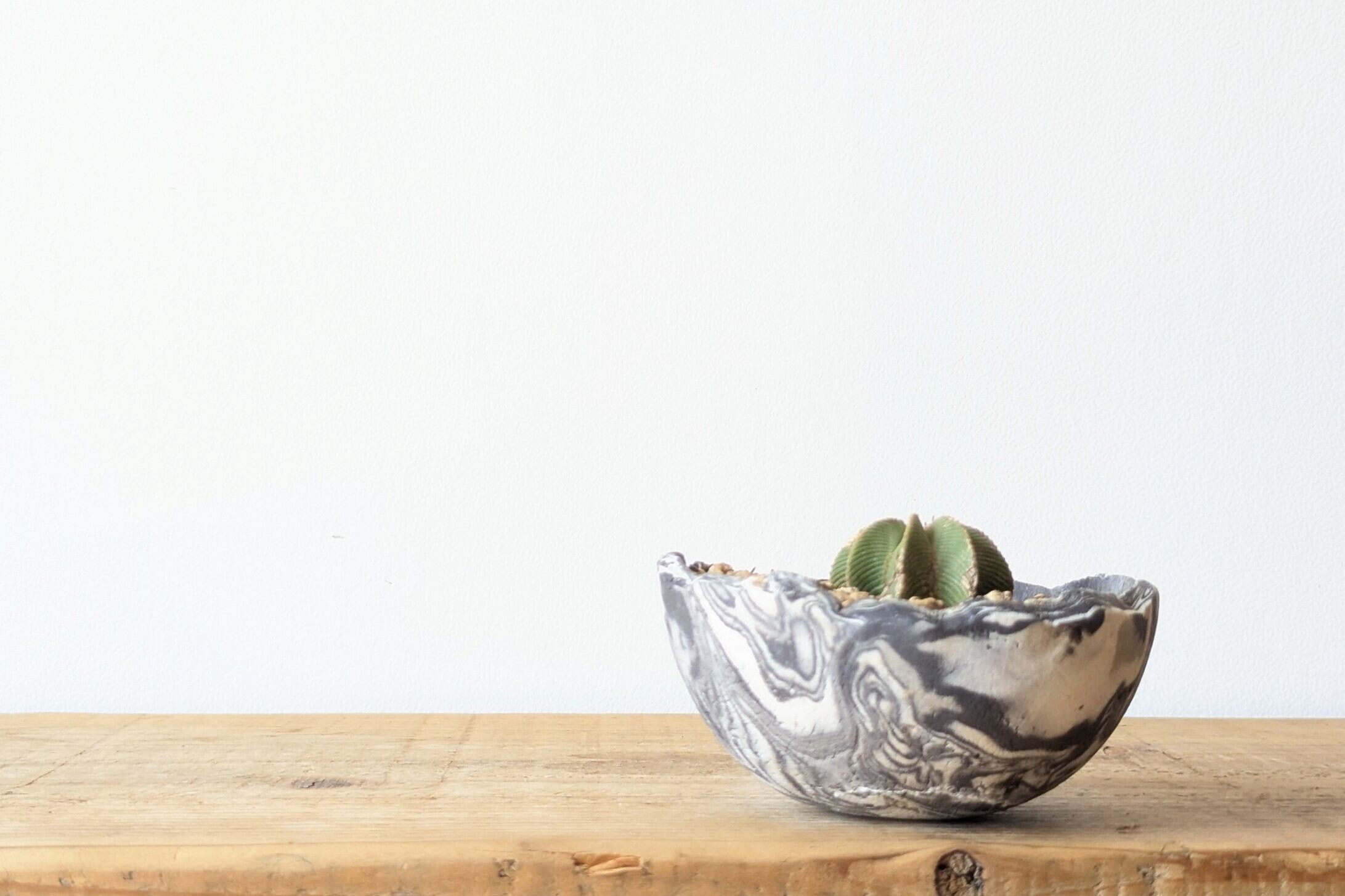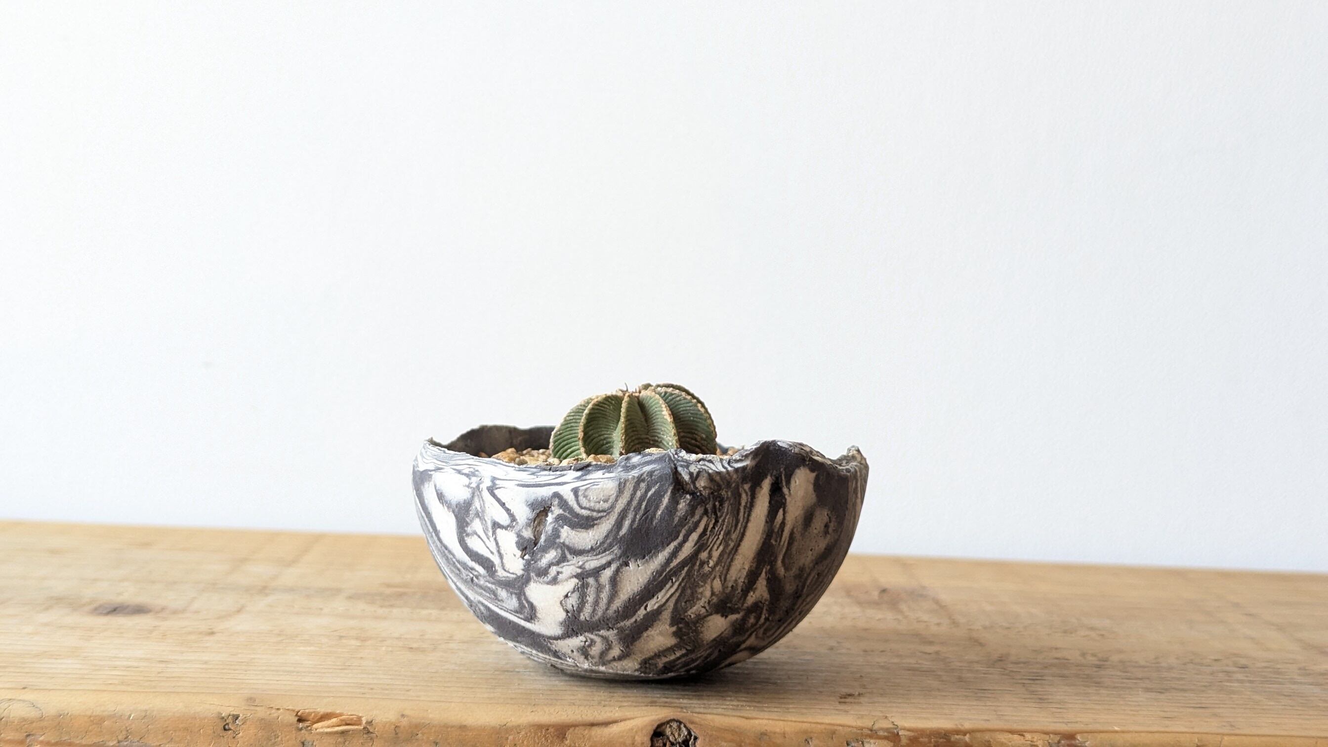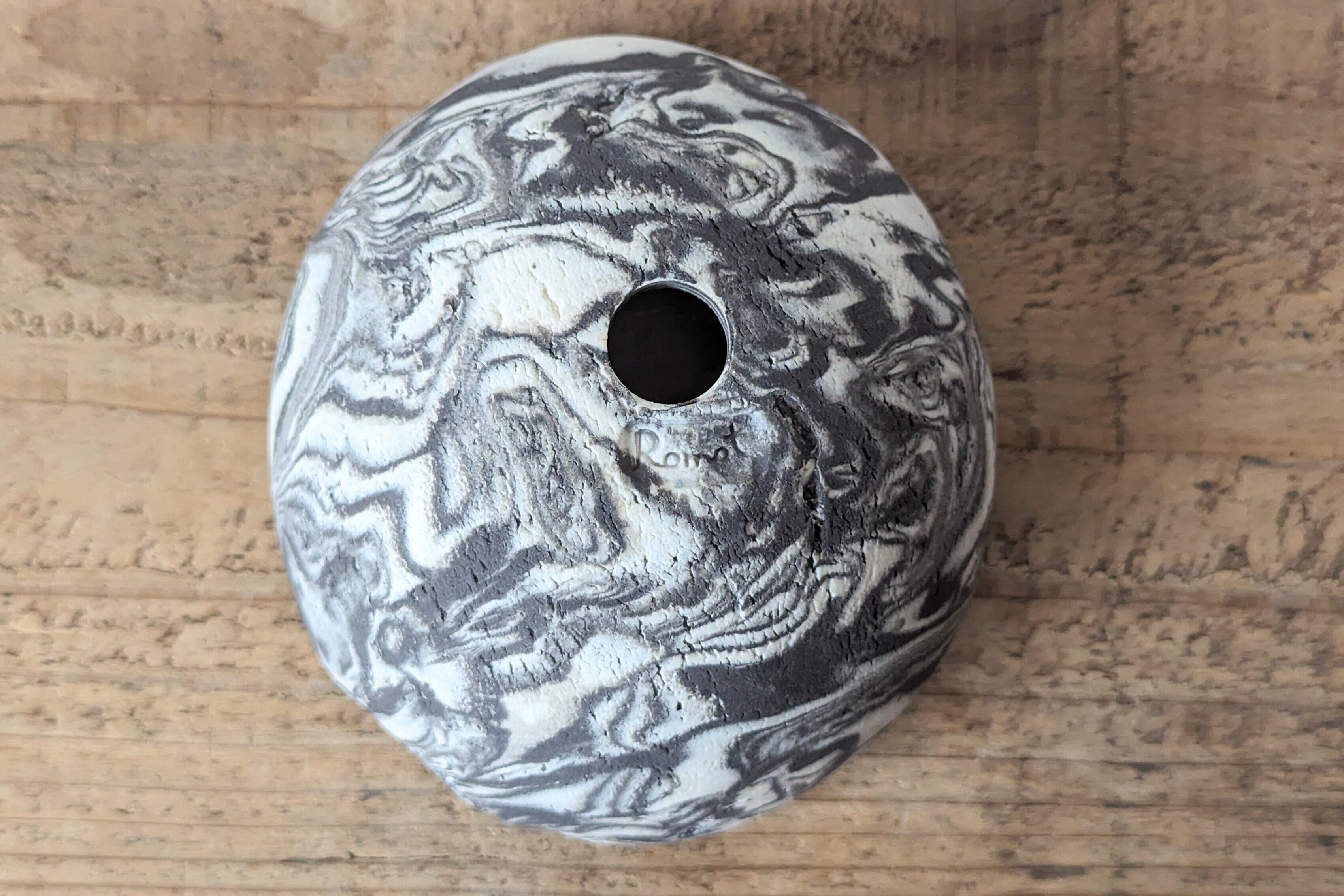 磁器土に黒い顔料を練り込みマーブル模様にした粘土を半円型に成型し仕上げました。年輪のような幾つもの線が見る角度で全く違った表情となり長い間楽しめる器です。