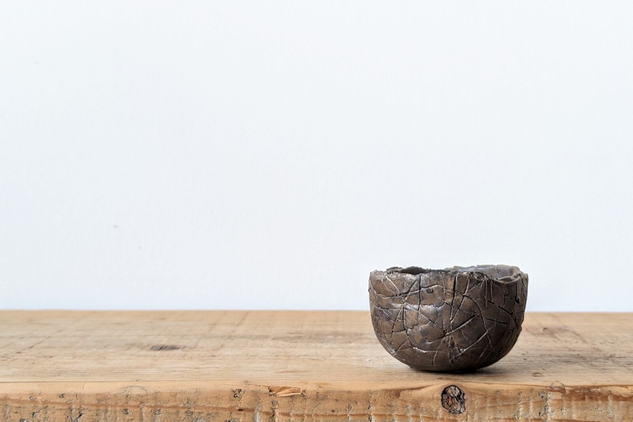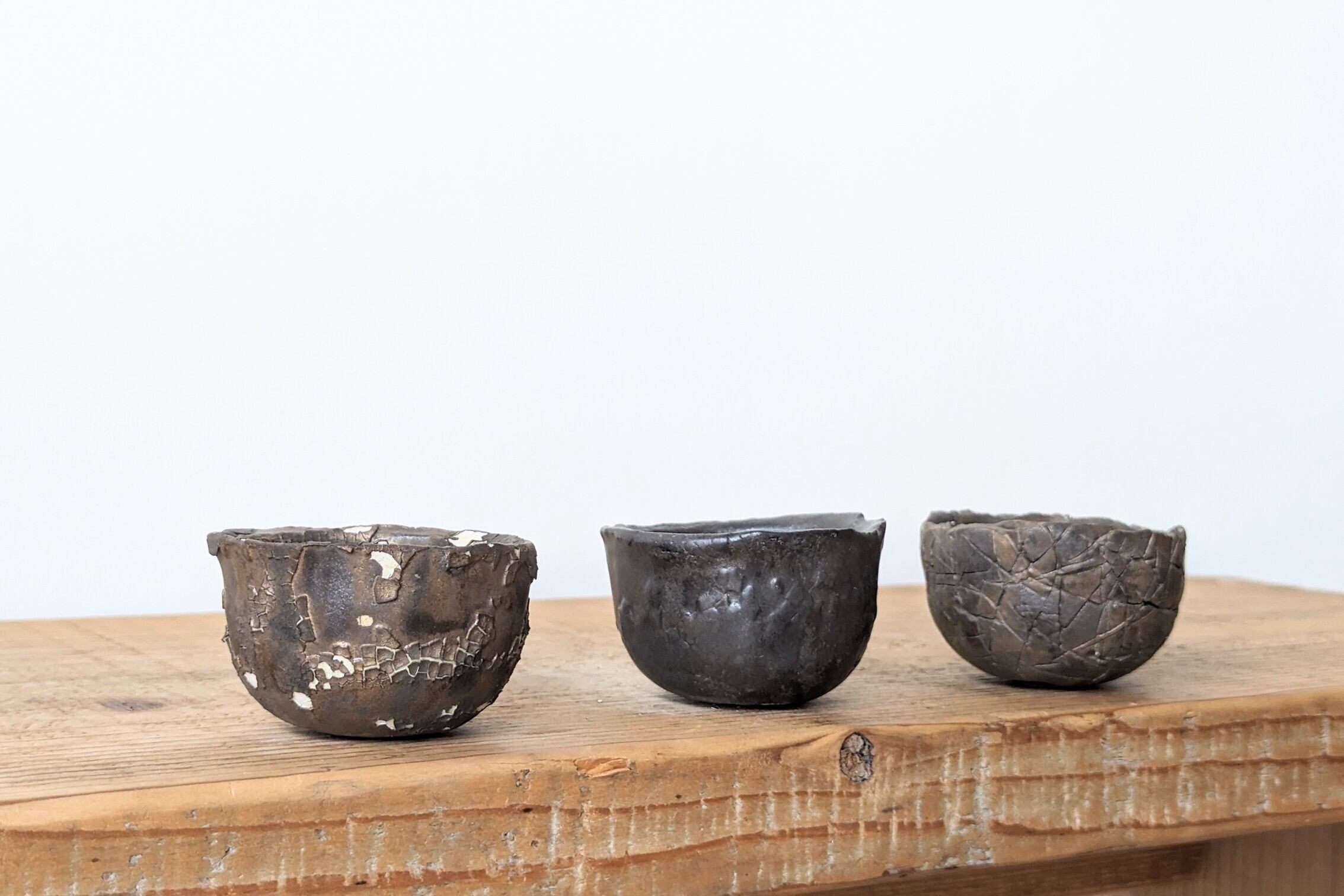 小さなお椀型に成型した陶土に模様を施し、釉薬で仕上げました。どんな植物にも合うブラックが1つ、主張しすぎないクラシックゴールドが2種類でシックな仕上がりになっています。実生や小さな植物を入れると存在感のある仕立てになります。