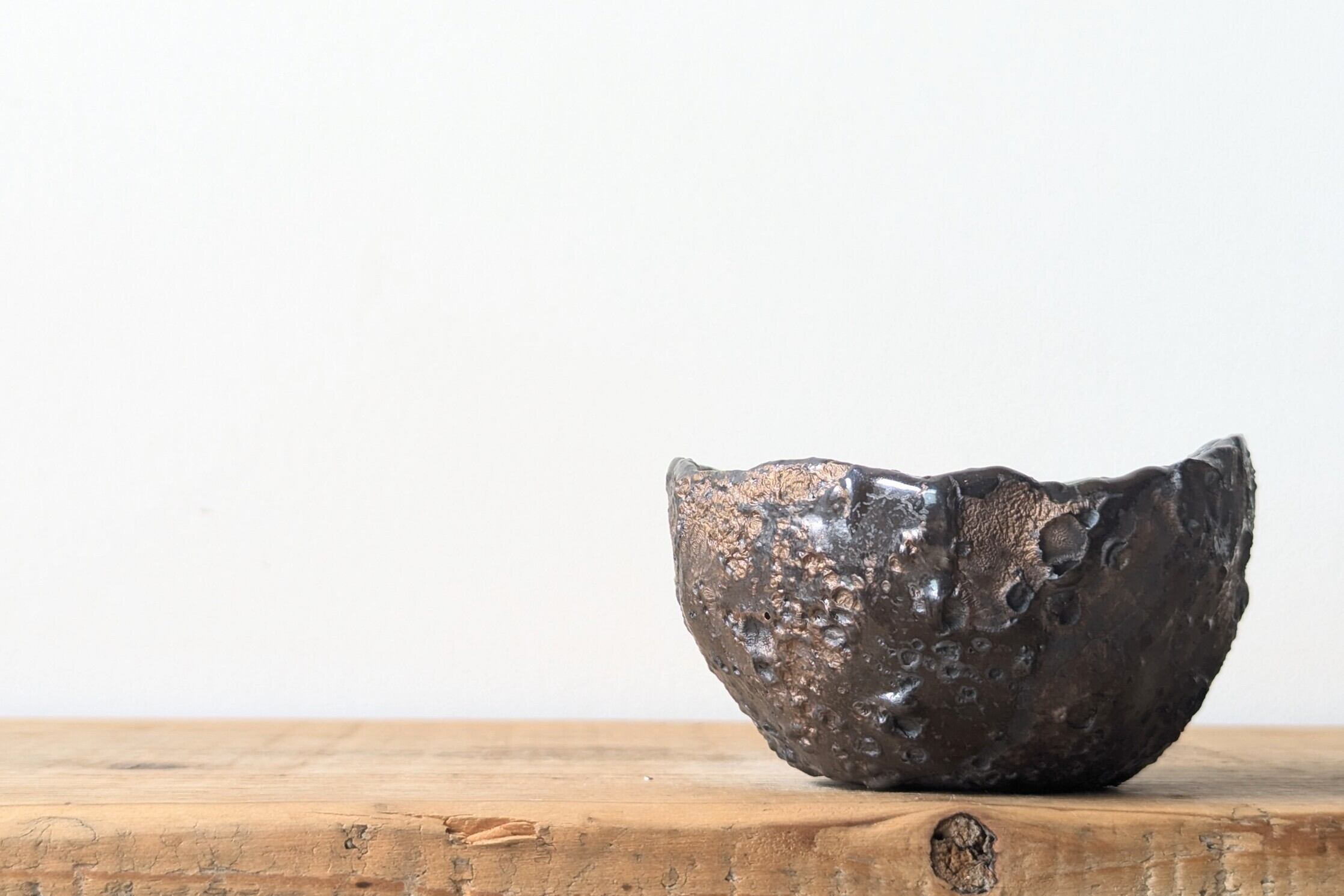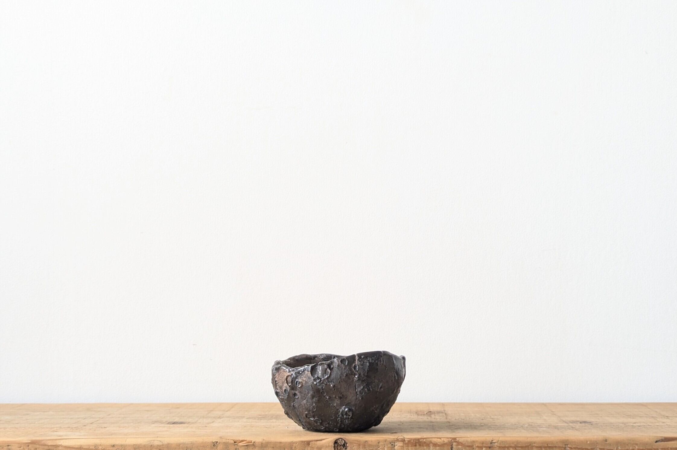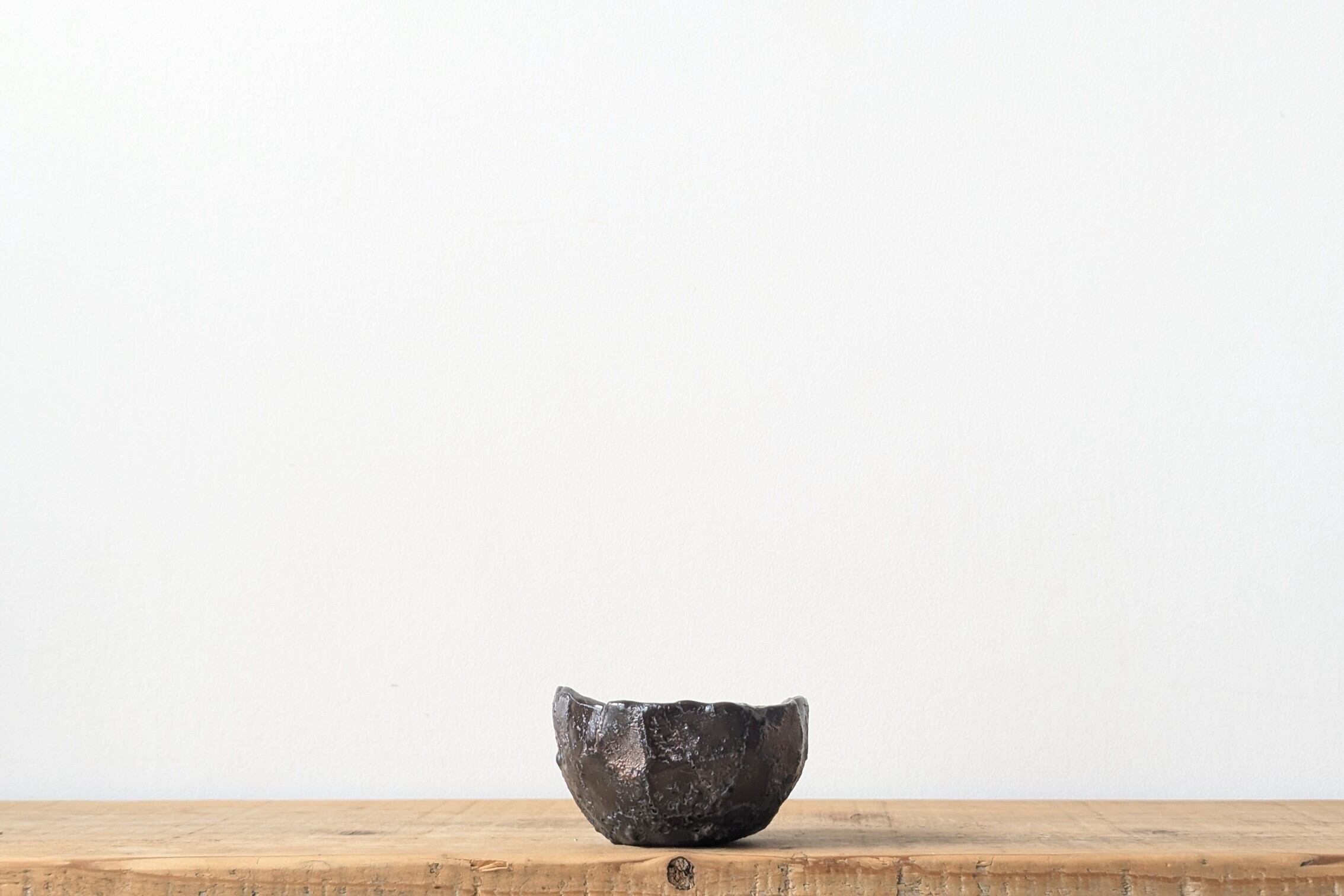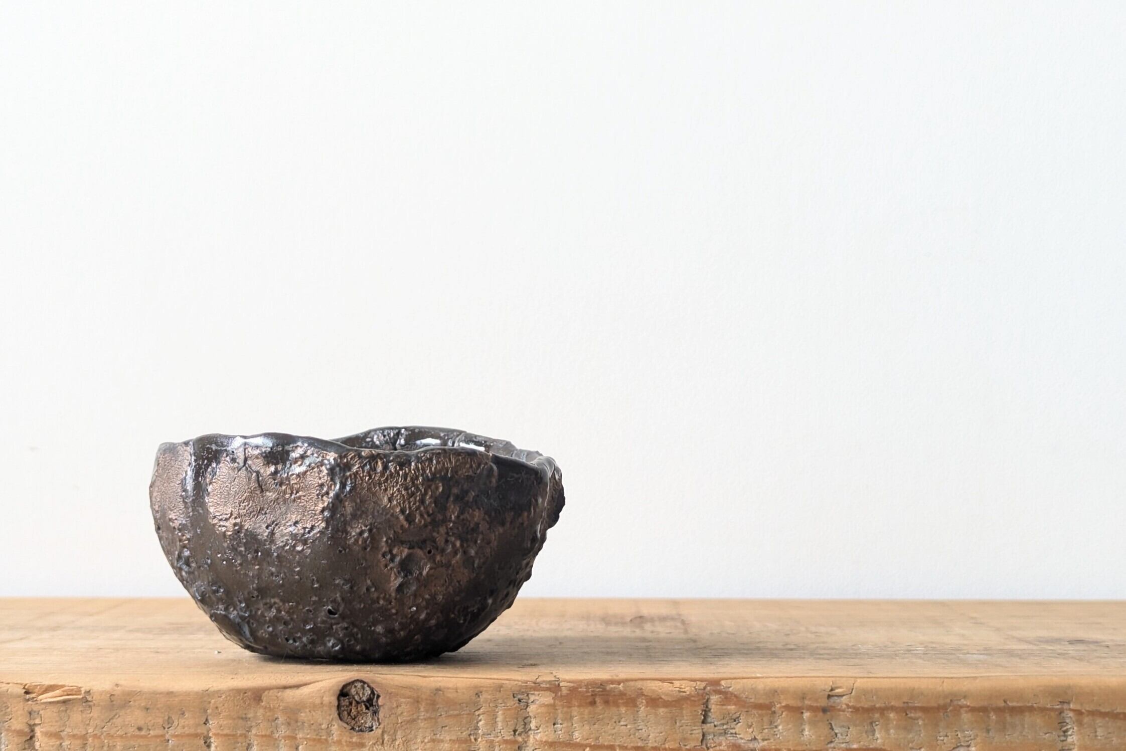 球型に成型した陶土に釉薬を塗り、更に特殊な釉薬を施し、デコボコの質感に仕上げました。不思議な手触りと向きによって現れる金色が神秘的な器です。