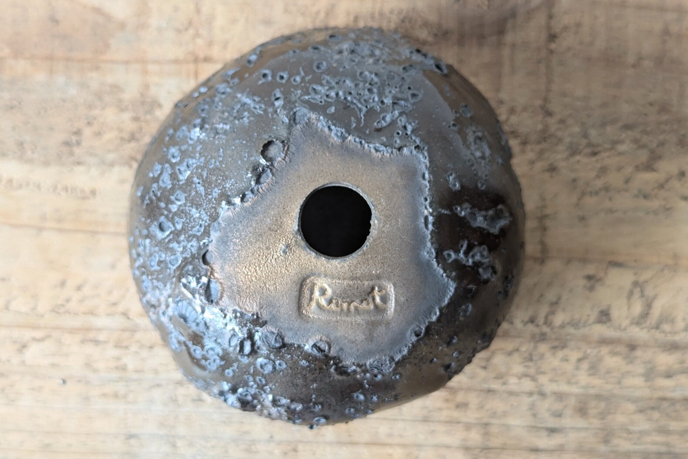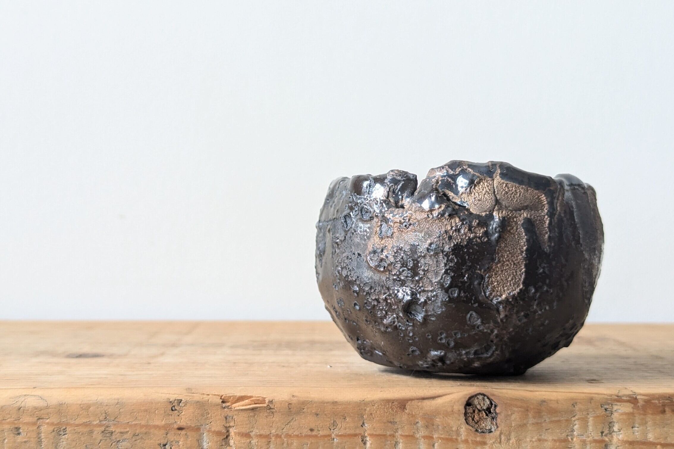 球型に成型した陶土に特殊な釉薬を施し、デコボコの質感にしたあと、釉薬で仕上げました。不思議な手触りと向きによって現れる金色の筋が神秘的な器です。