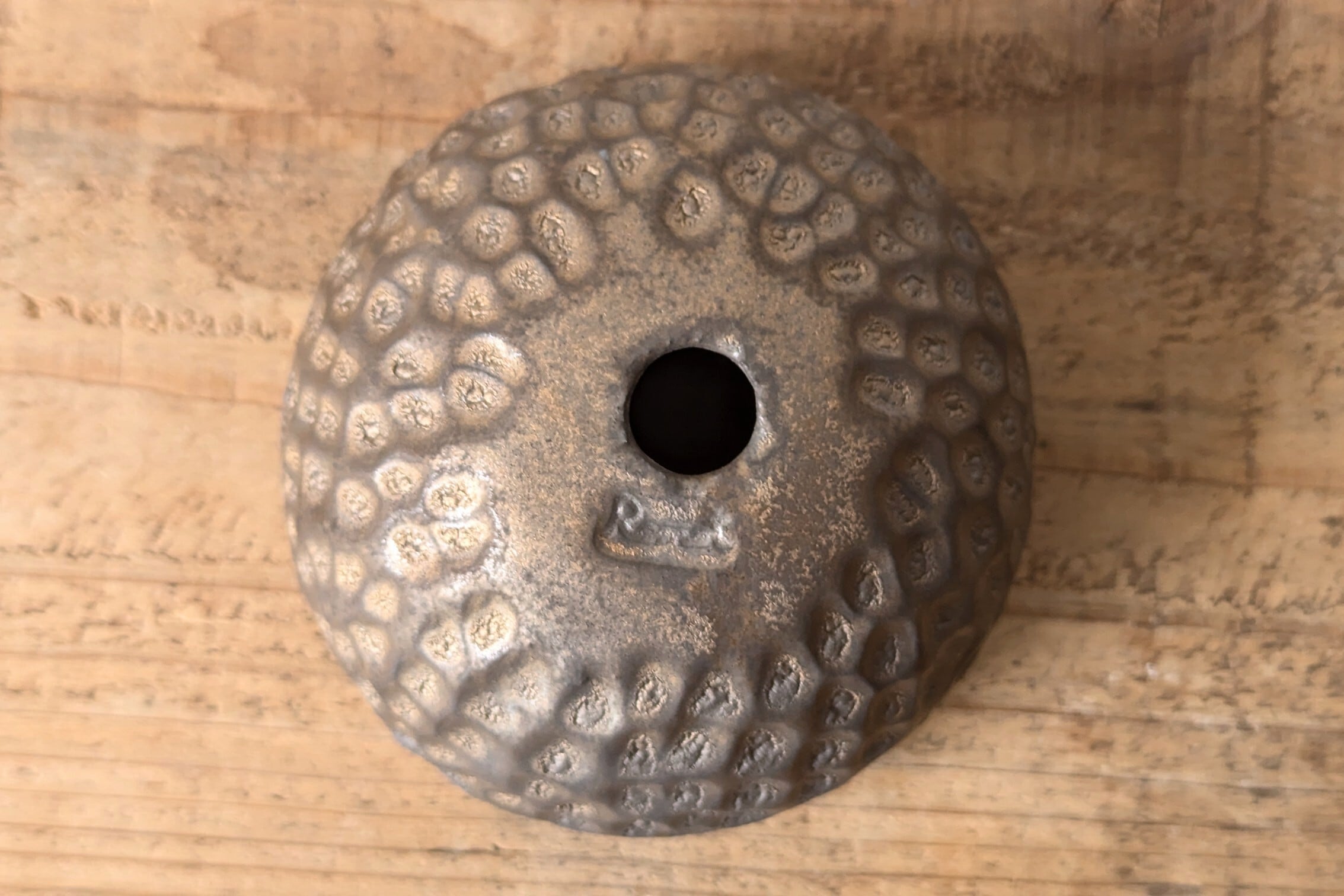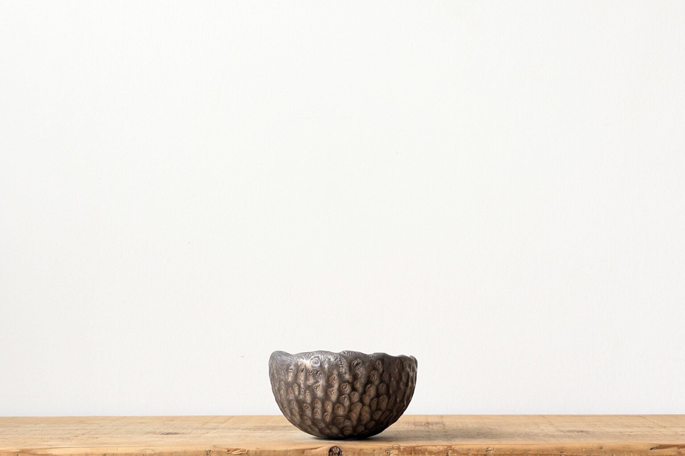 半円型に成型した陶土に模様を施し、釉薬で仕上げました。クラシックゴールドが渋くも豪華な雰囲気があり、実生や小さな植物を入れると存在感のある仕立てになります。