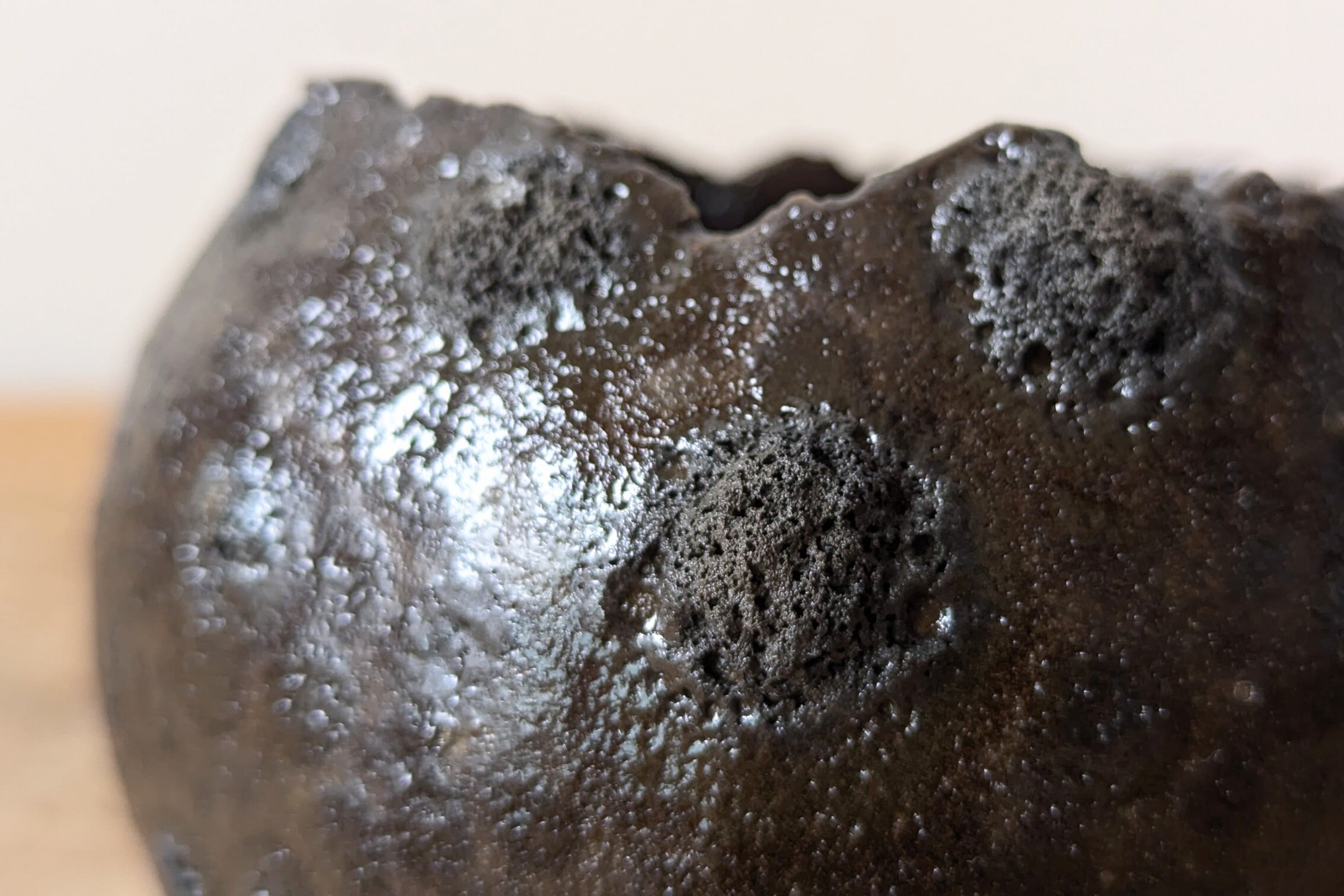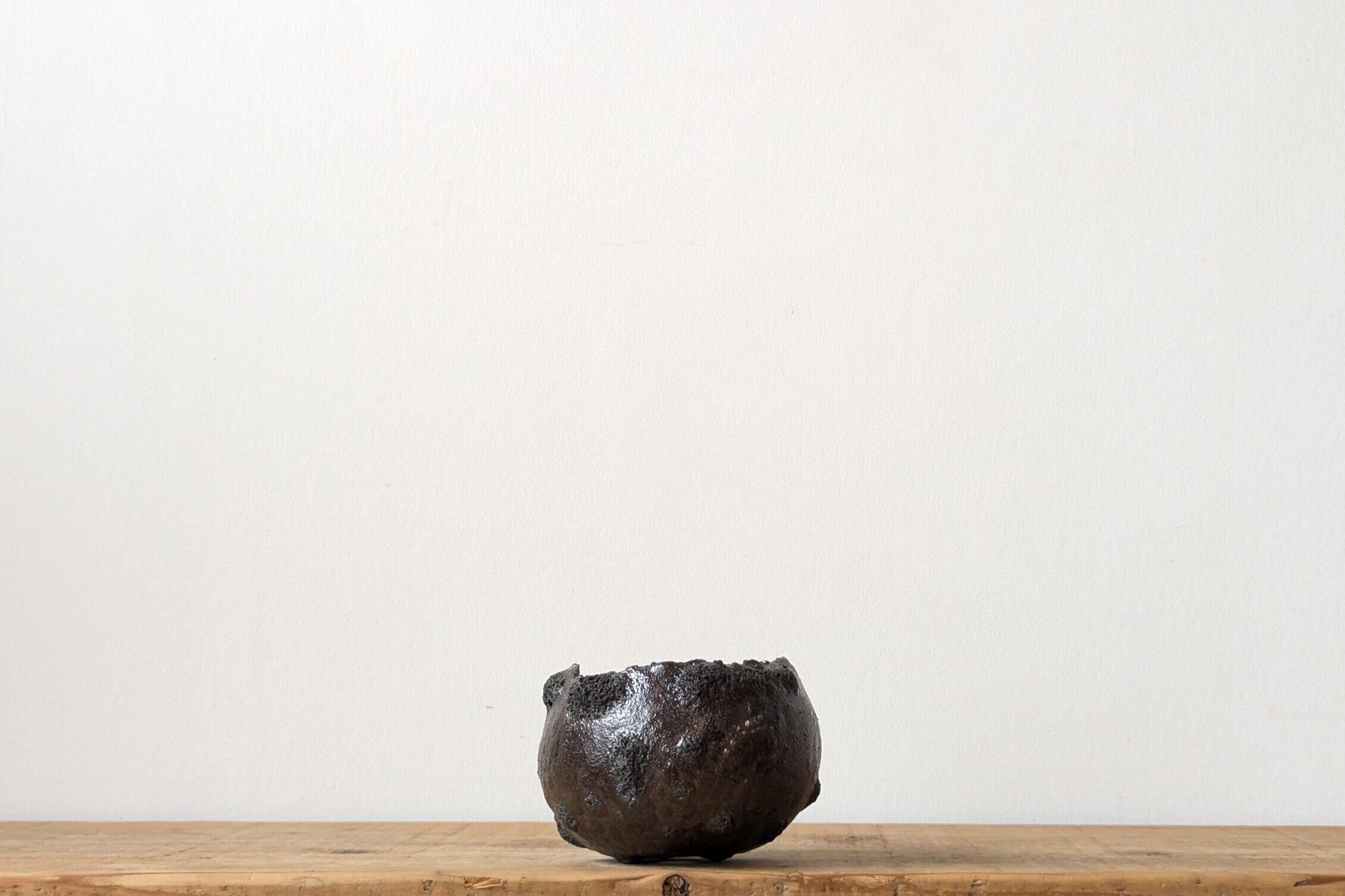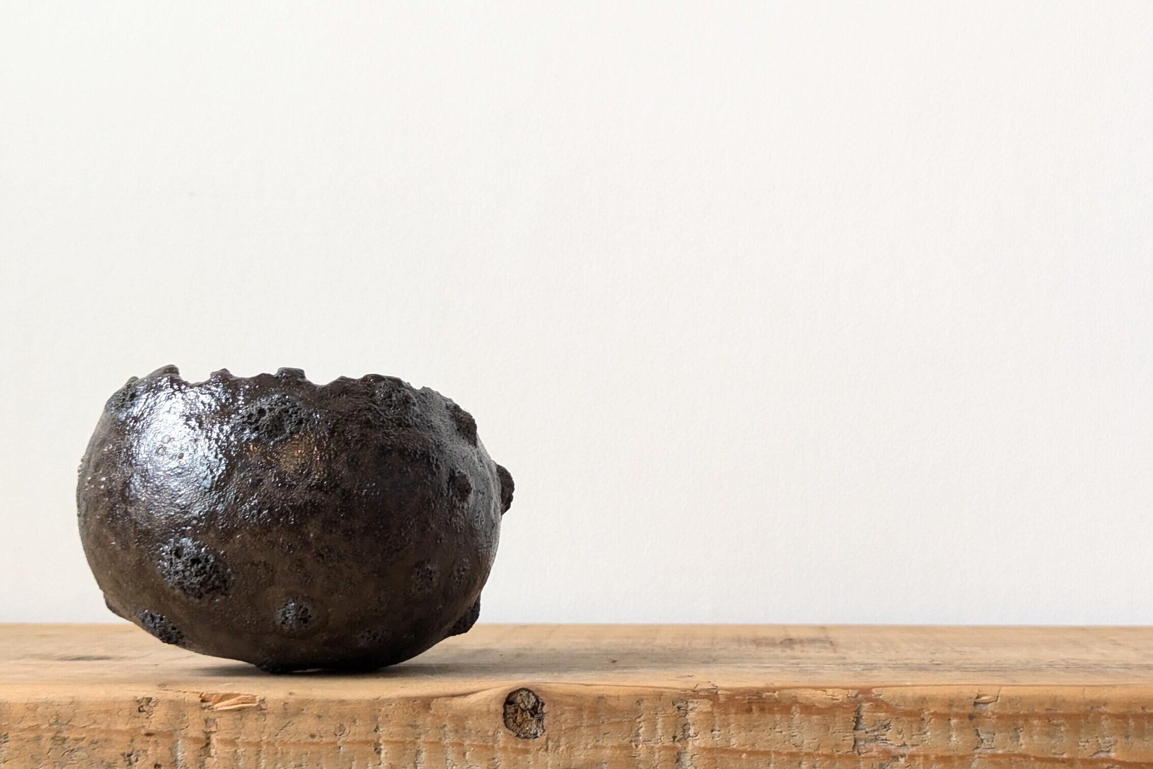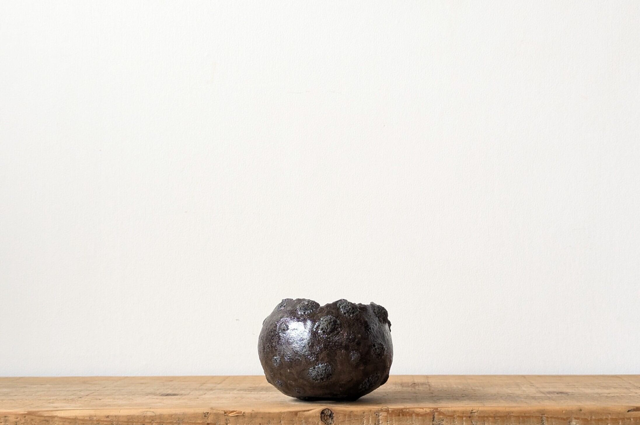 球型に成型した陶土に特殊な釉薬を施し焼き上げました。溶岩の様な隕石のようなクレーターがあちこちに発生していて角度で全く異なる表情を見せてくれます