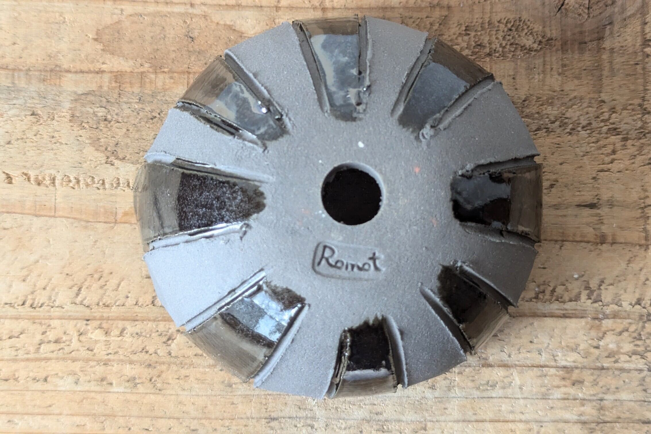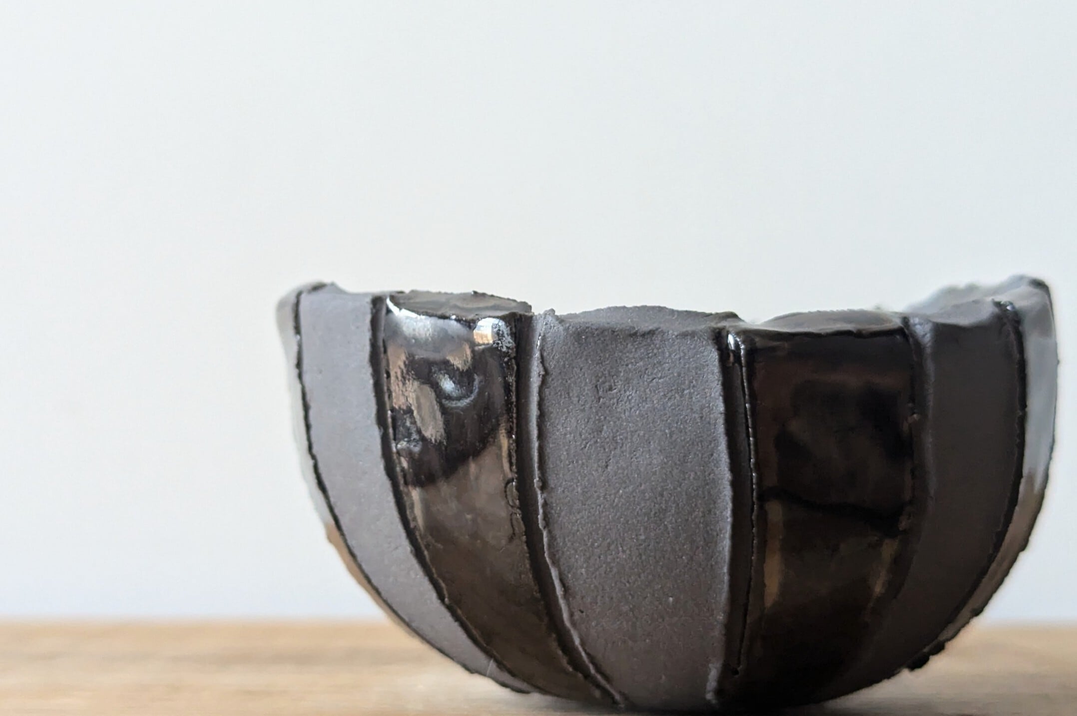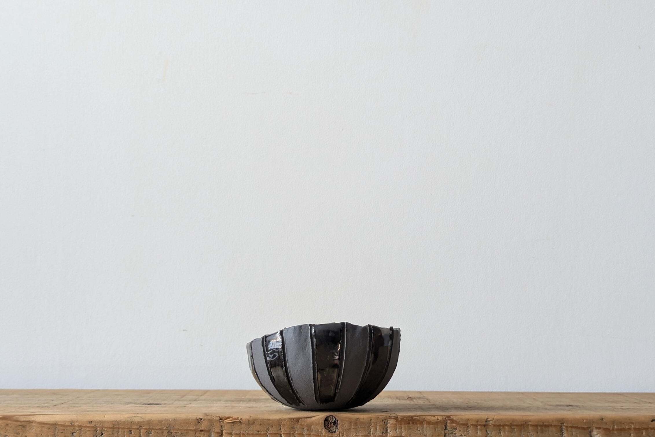 半円に成型したグレーの陶土に規則的に線を入れ、更にメタリックブラックの釉薬も交互になるようにコントラストに施しました。マットとツヤの異質感が独特の雰囲気をつくっています。