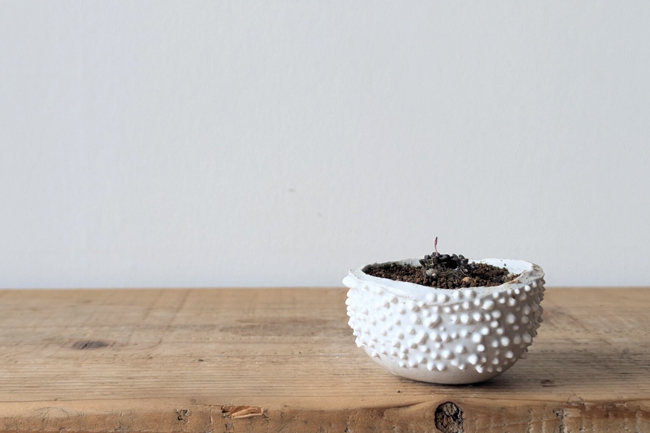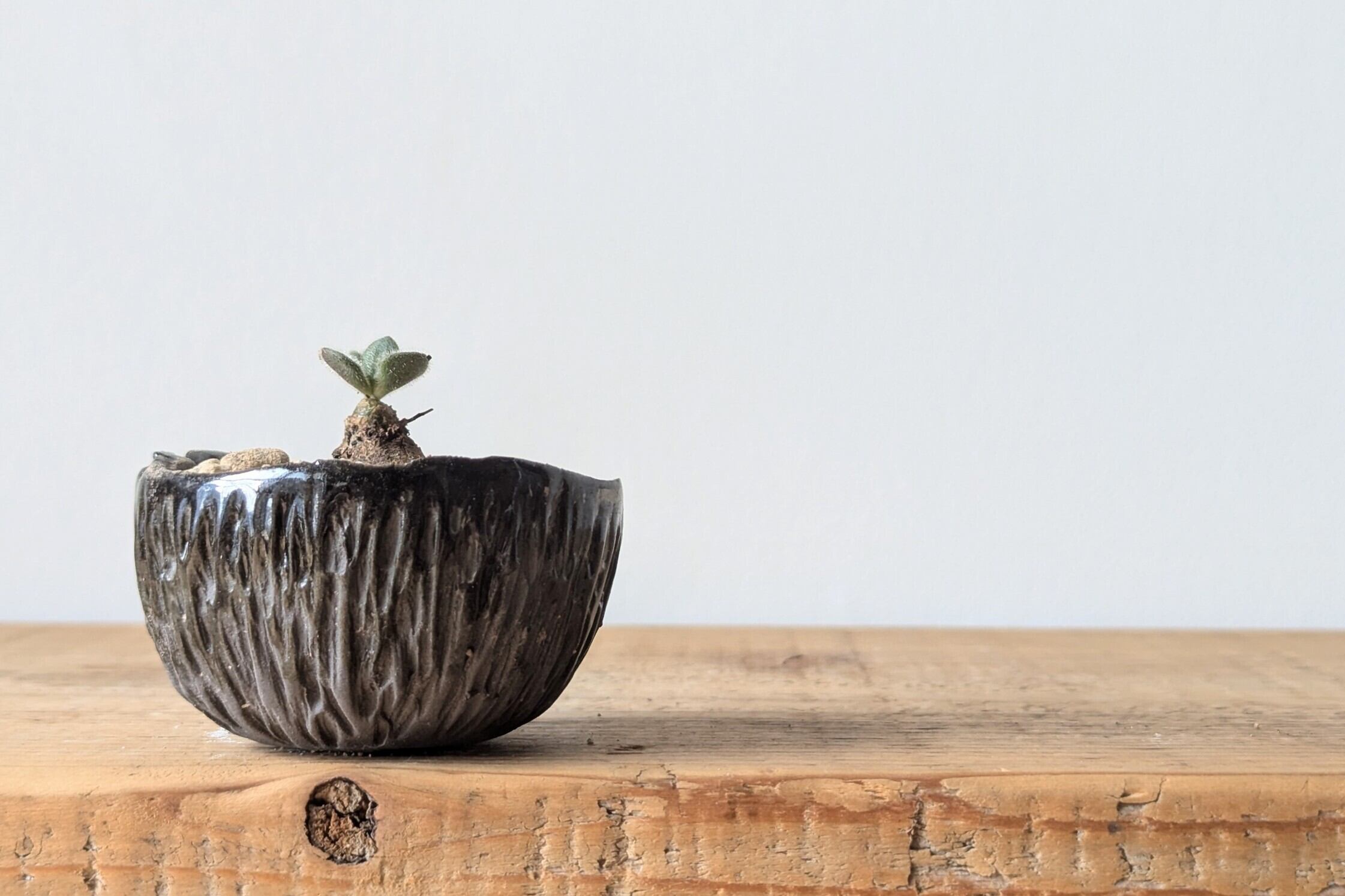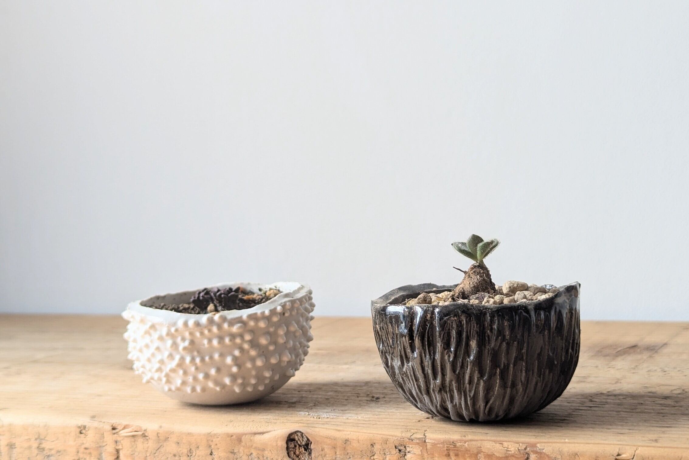 小さなお椀型に成型した成型した陶土に細かい細工を施し、まるで木の表皮の様な雰囲気に仕上げました。実生や小さな植物を入れると存在感のある仕立てになります。