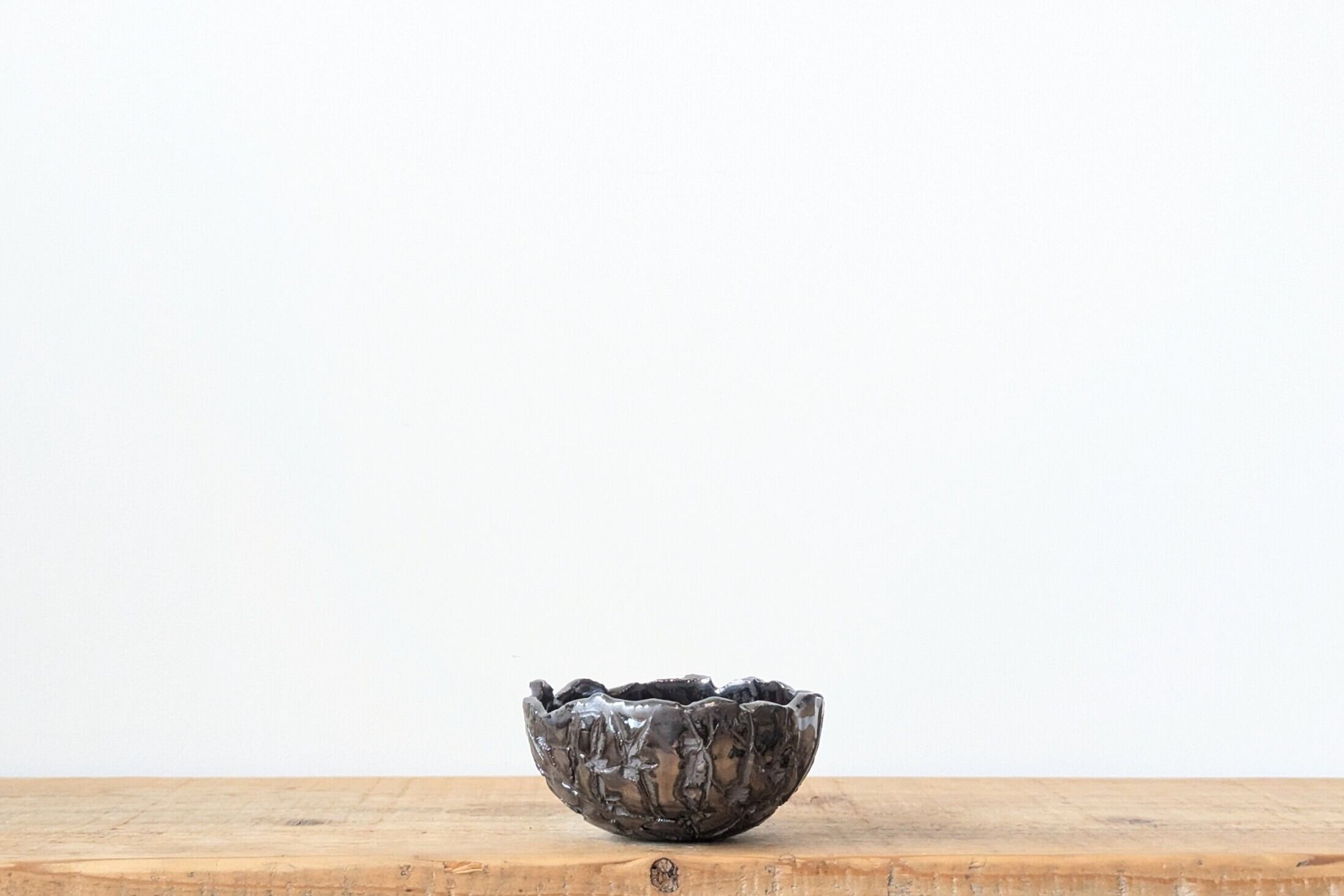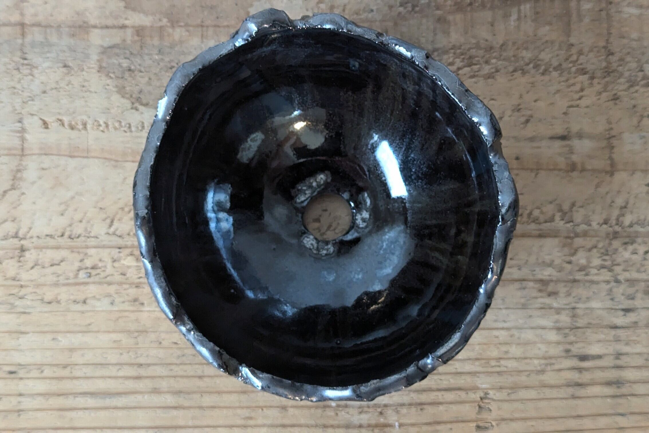 半円に成型した陶土にひび割れ風の傷をつくり、特殊な技法でひび割れ部分は地色を残し、表面はブラックシルバーの釉薬を施しました。まるで鉱物を砕いたようなひび割れ部との色合いの違いが美しい器になっています。