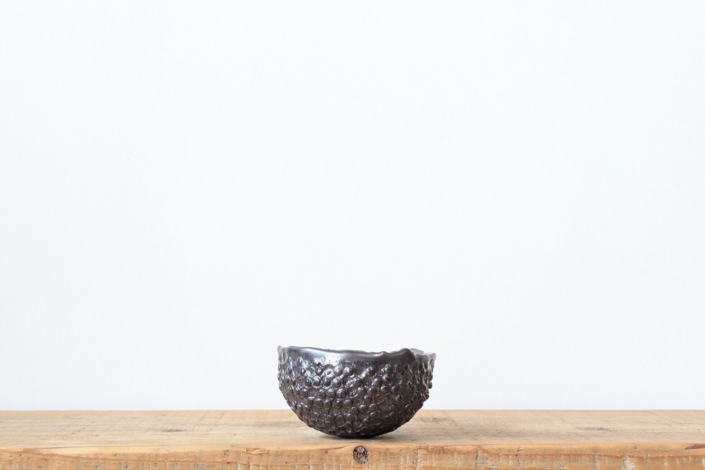 半円に成型した陶土に丸い突起をつくりあえて一部を崩し、ブラックシルバーの釉薬を施しました。凸凹した質感が見る角度で違った表情を楽しめる器です。