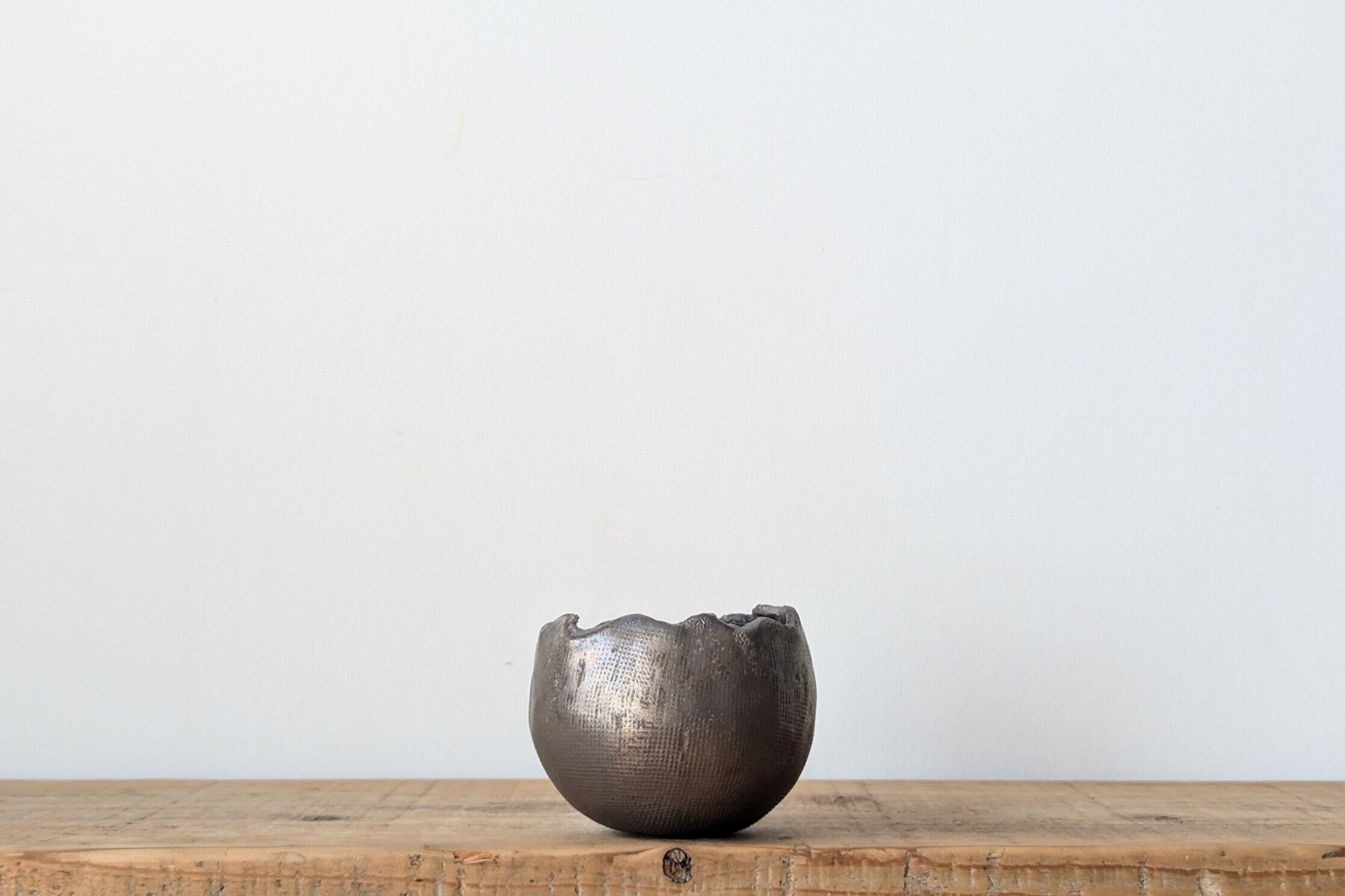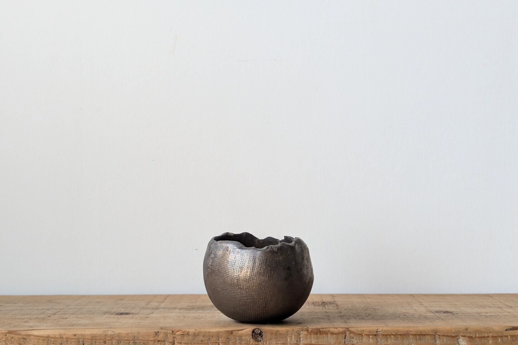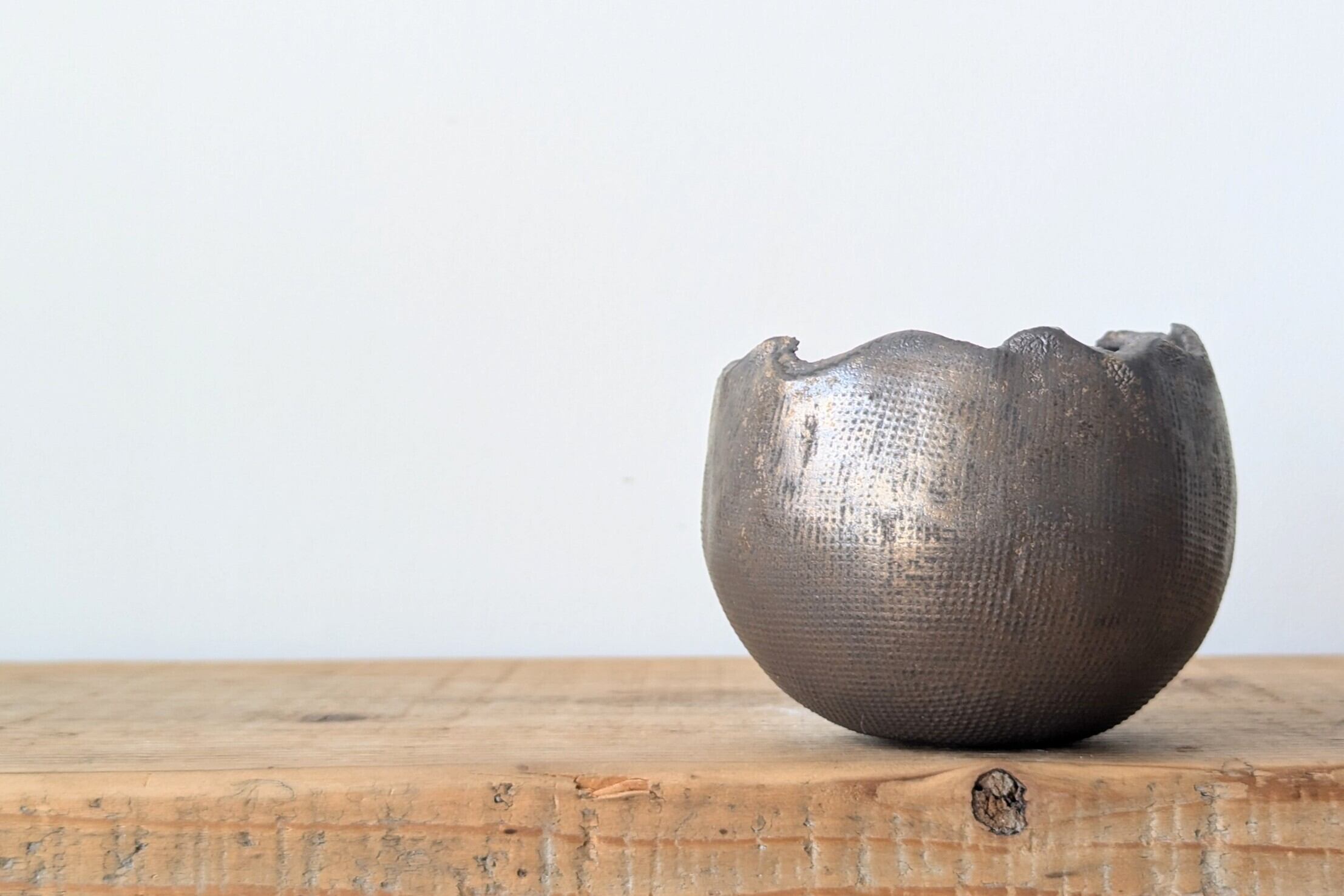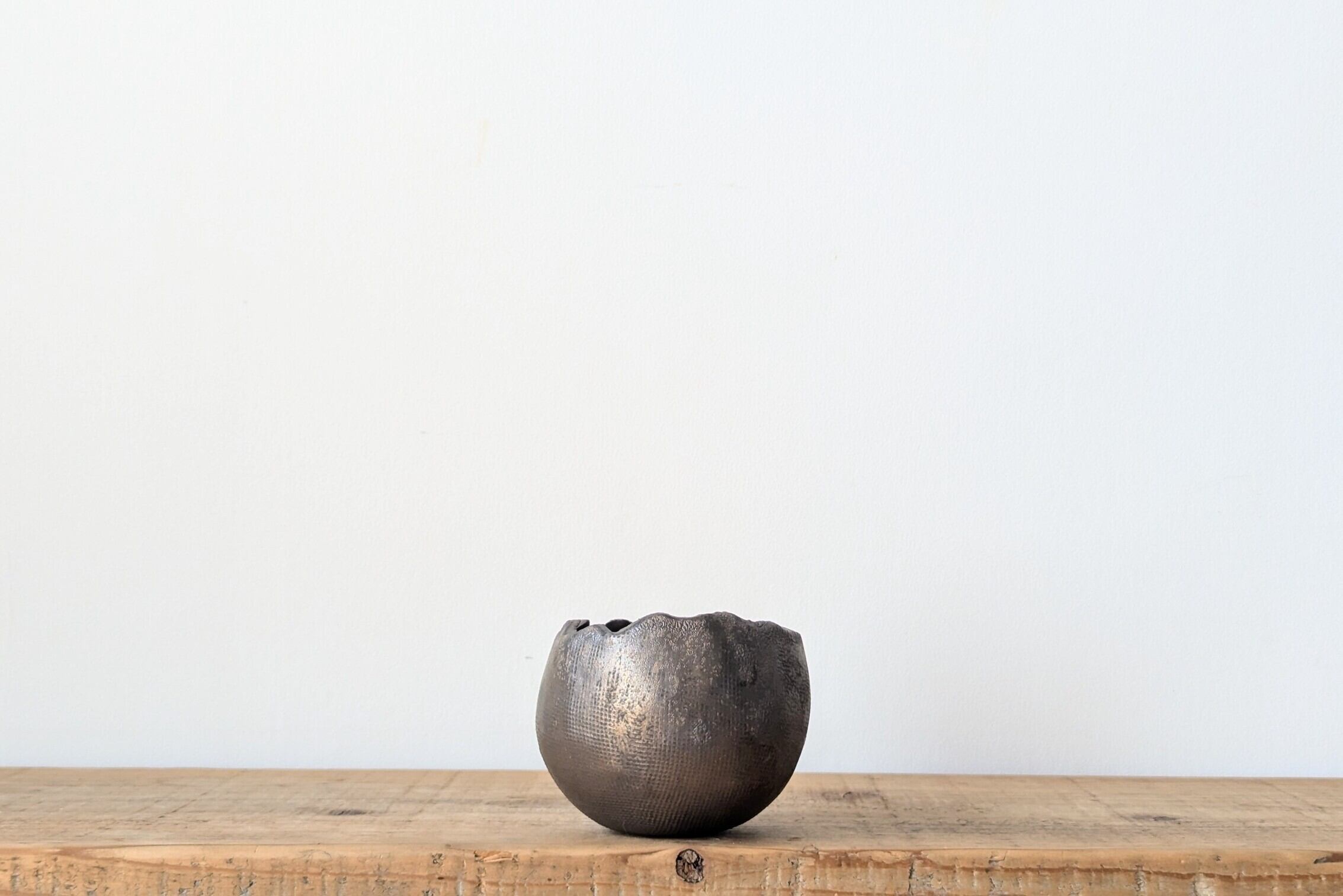 球型に成型した陶土に模様を作り金色の釉薬で仕上げました。まるで金属の様な仕上がりになっています。