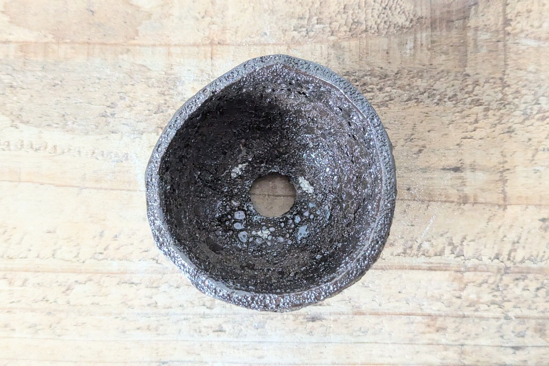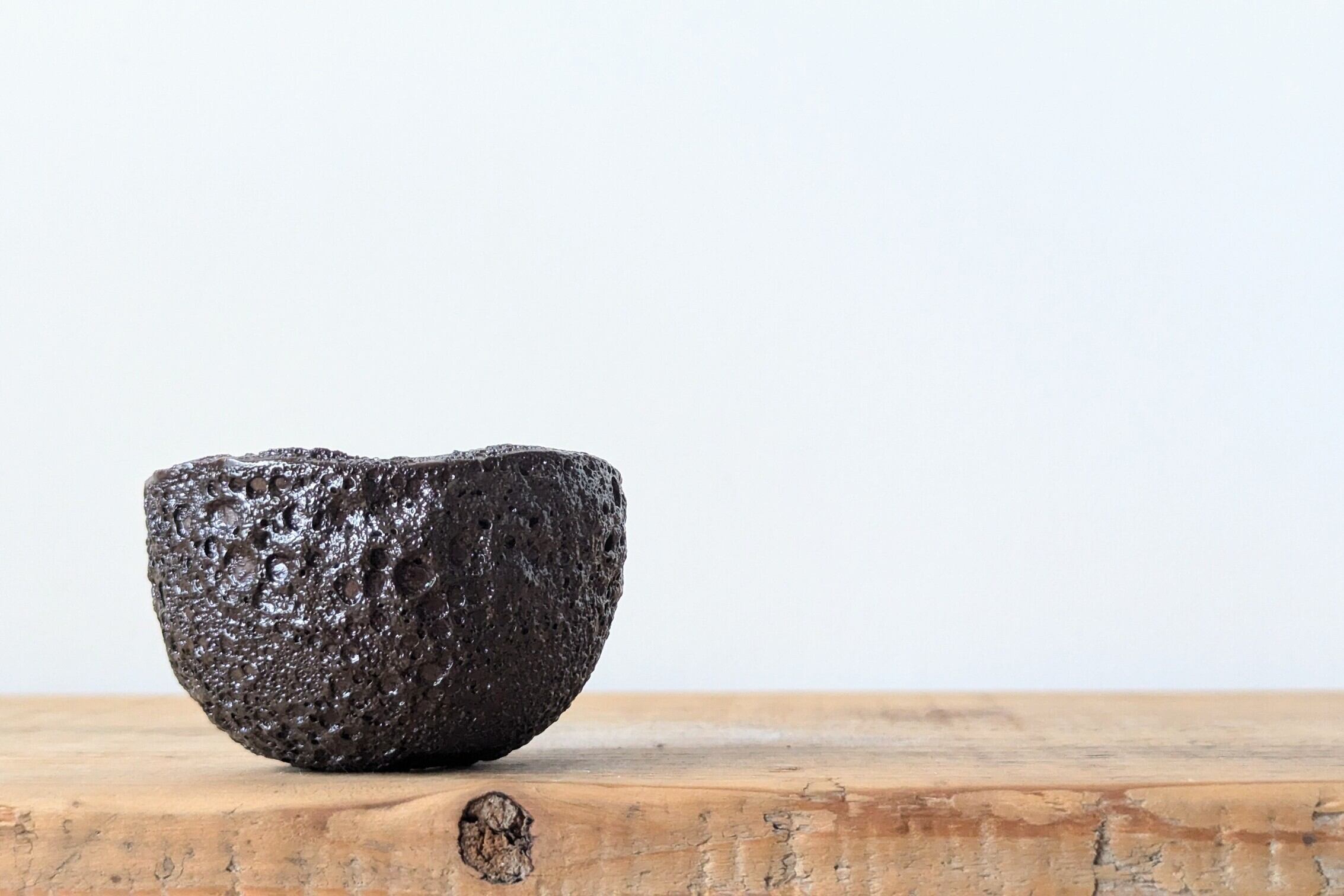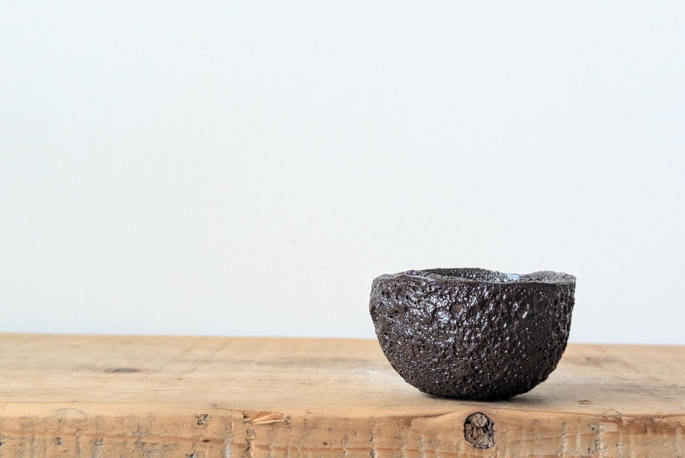 小さなお椀型に成型した成型した陶土に特殊な釉薬を特殊な方法で塗り表面を複数のクレーター状に仕上げました。隕石の様な溶岩の様な器です。実生や小さな植物を入れると存在感のある仕立てになります。