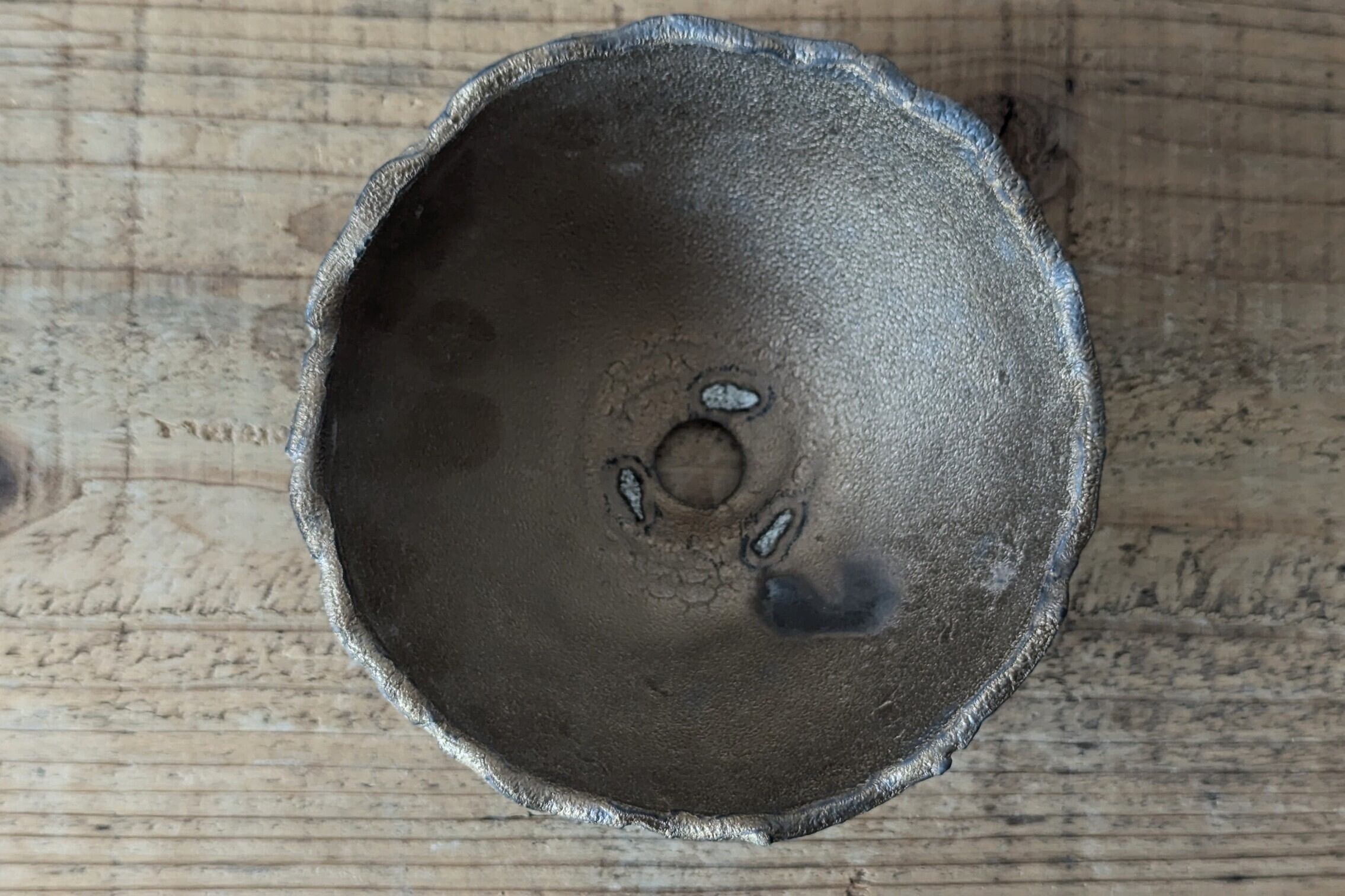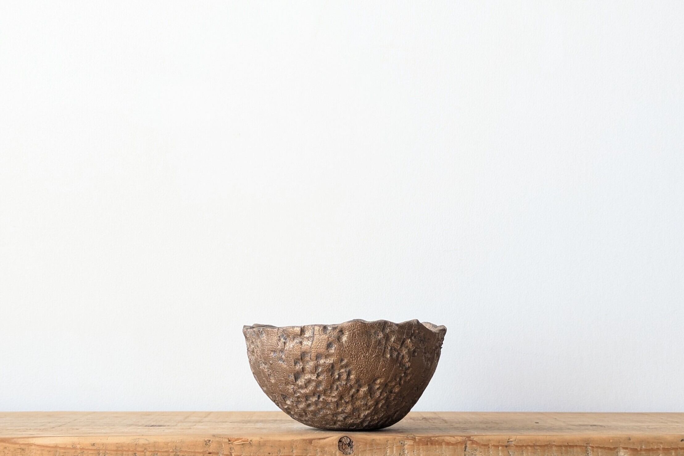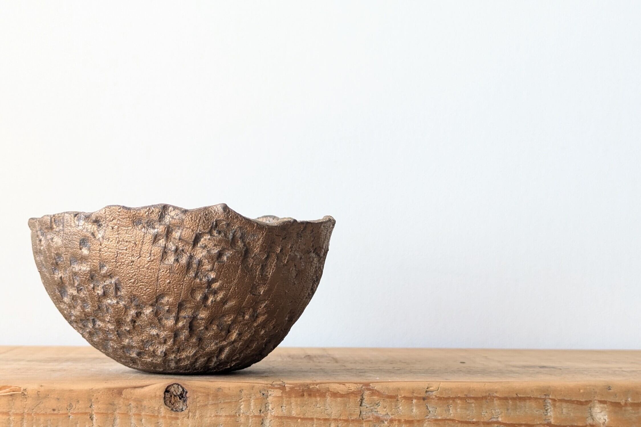 御椀大サイズに成型した陶土に模様を施しあえて崩し朽ちていく雰囲気を出しました。生えては枯れる植物の葉が美しいように朽ちていく瞬間の美しさを閉じ込めたデザインがコンセプトです。