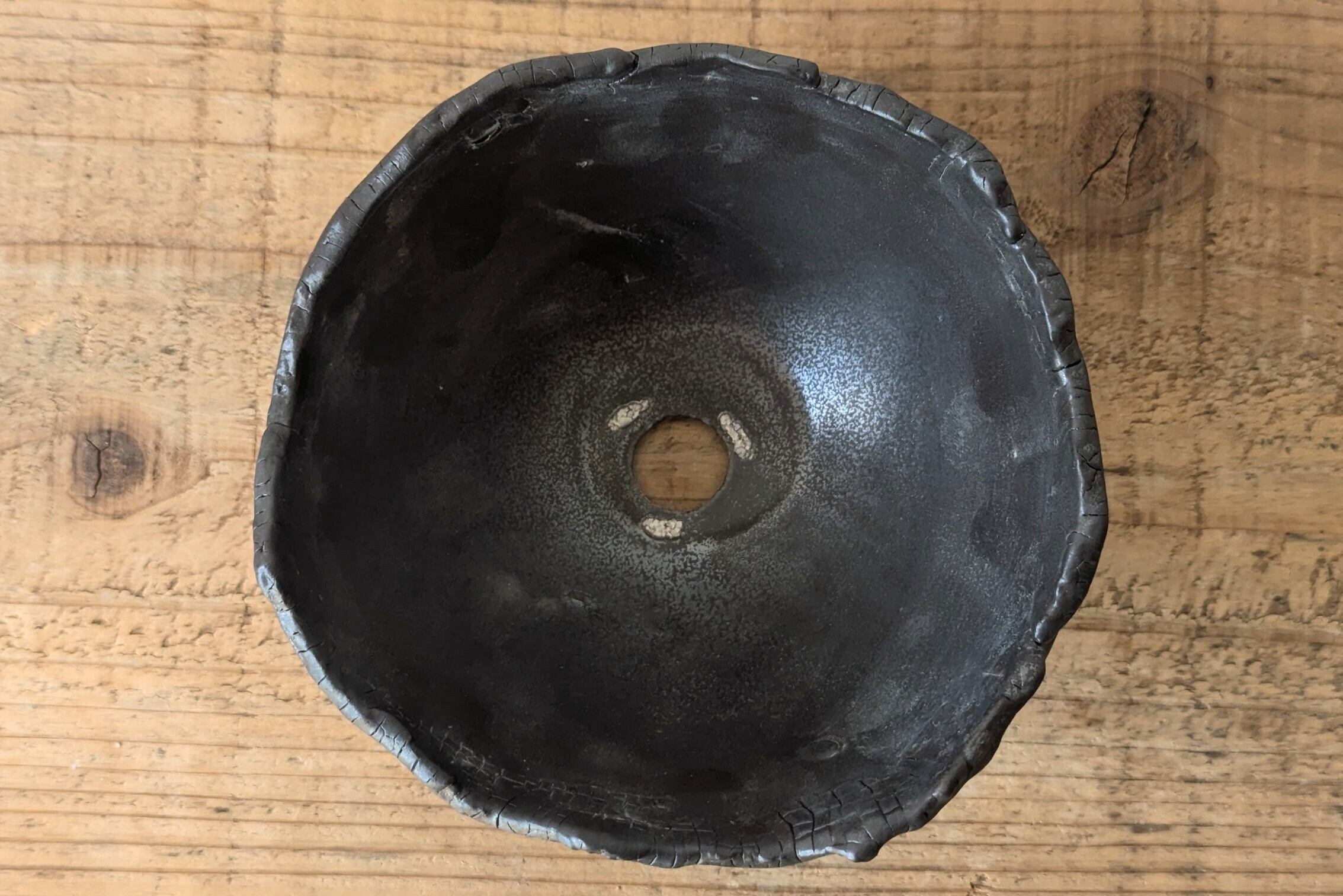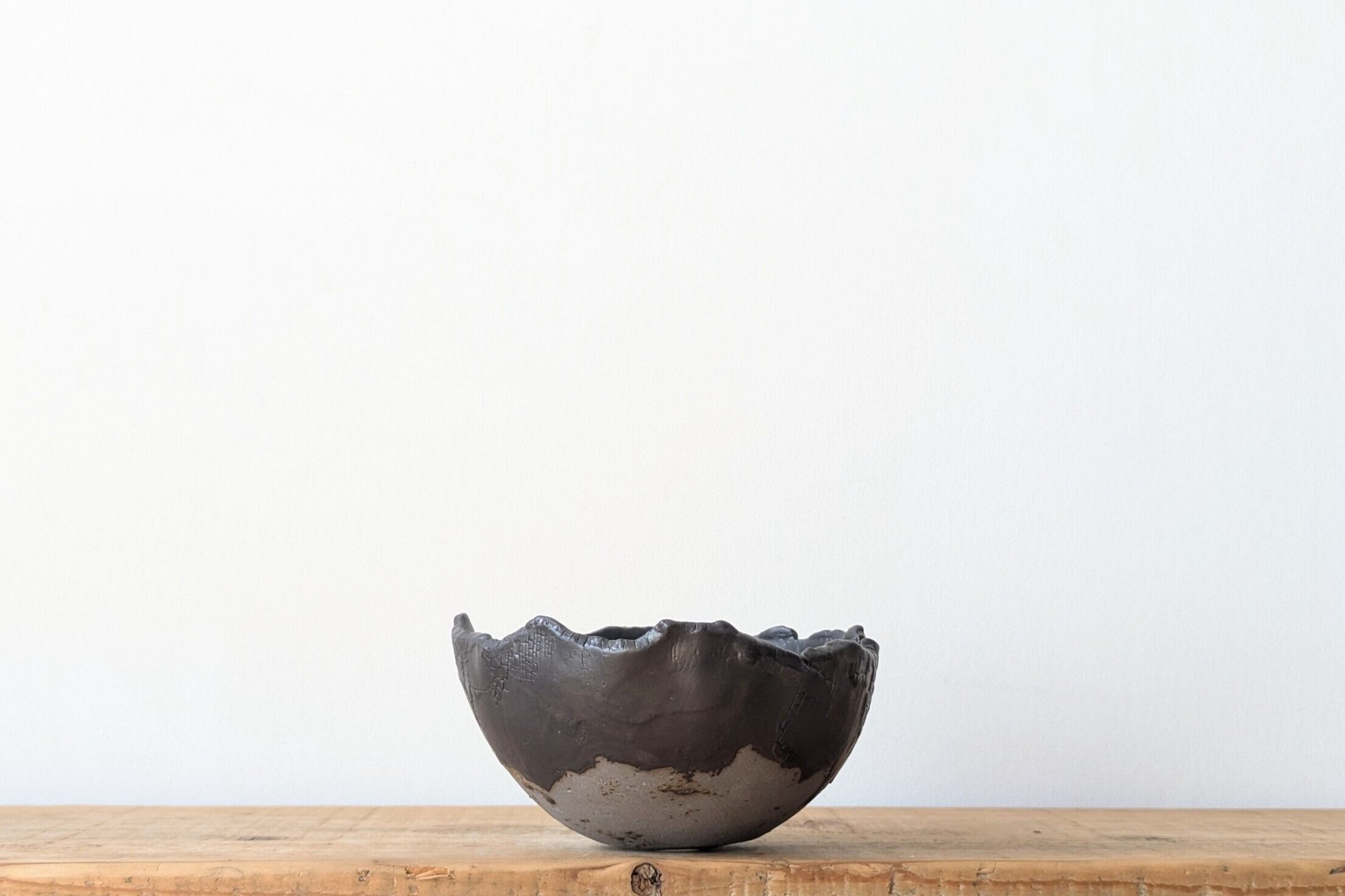 御椀大サイズに成型した陶土にひび割れを施し釉薬で仕上げました。コンクリートの様なマットグレーの地肌と、マットブラックのひび割れが独特な雰囲気を出しています。