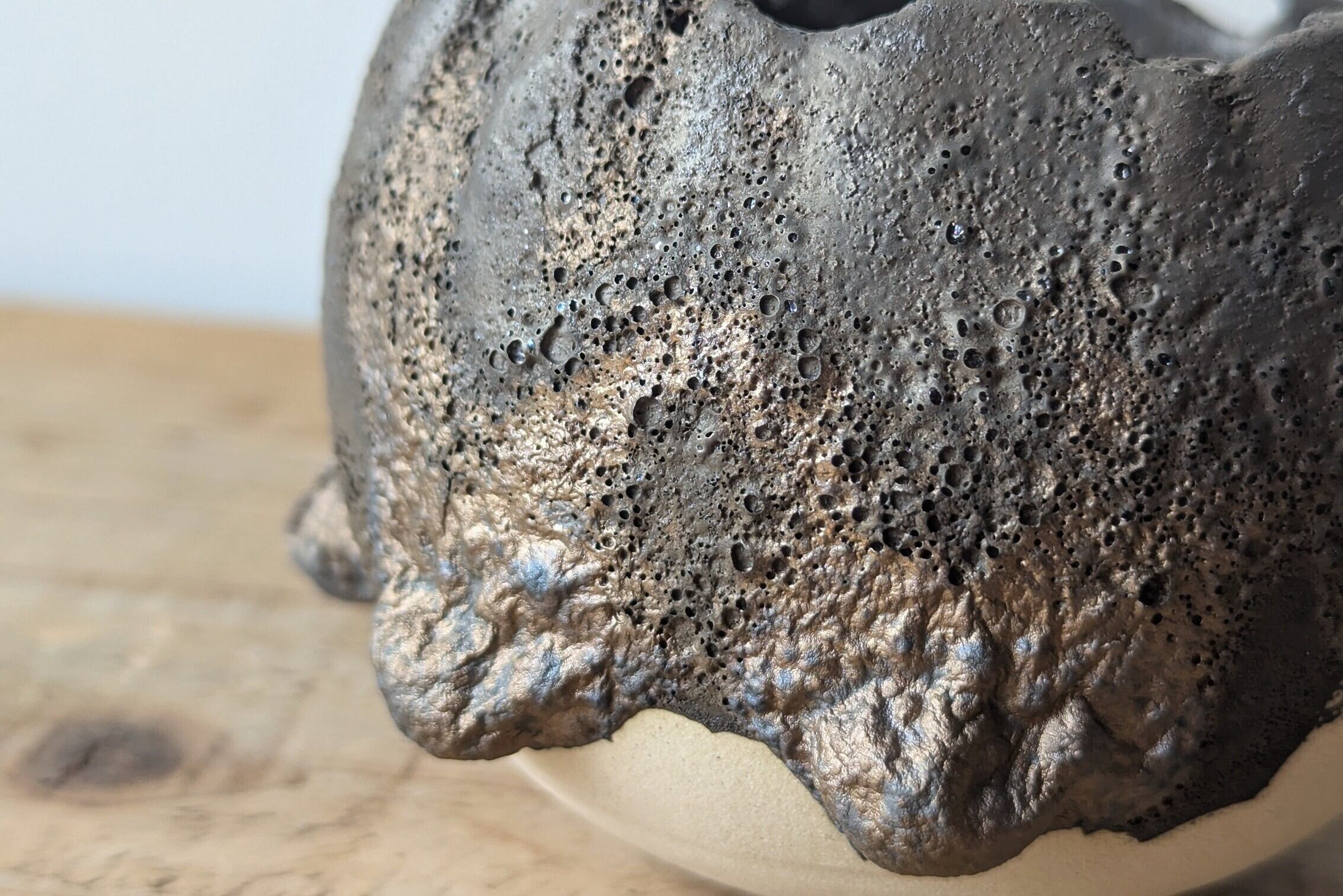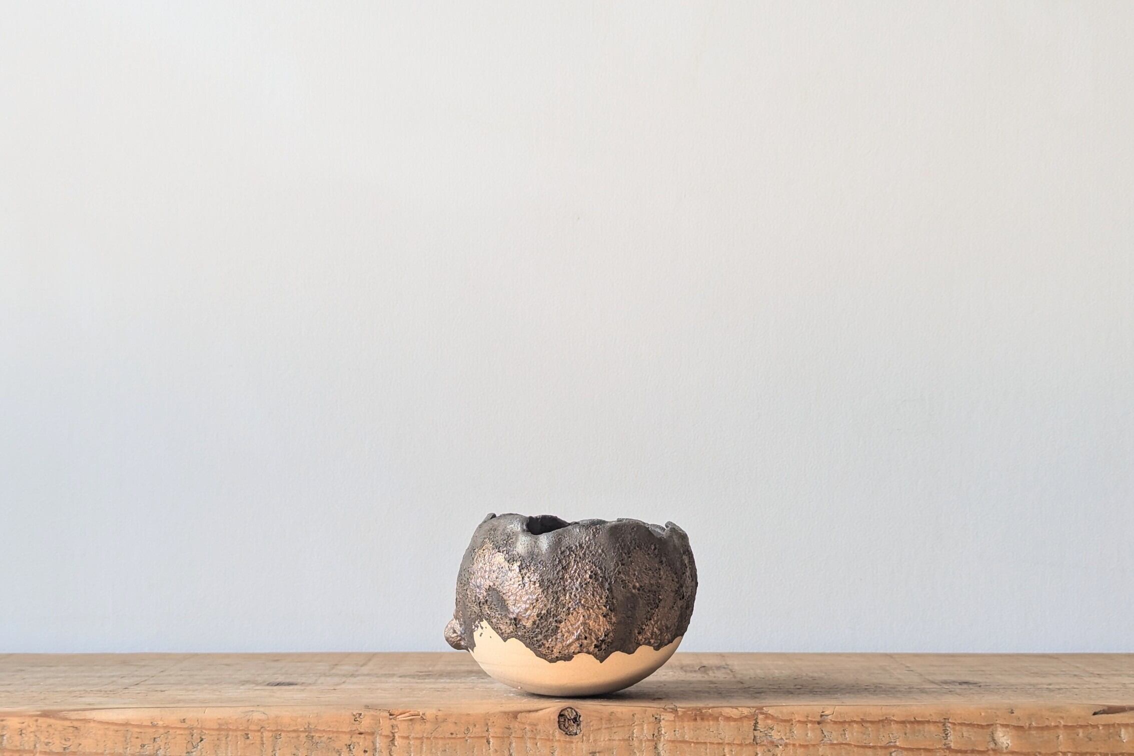 球型に成型した陶土に特殊な釉薬を特殊な塗り方で塗り、細かい複数のクレーター状の表面に仕上げました。