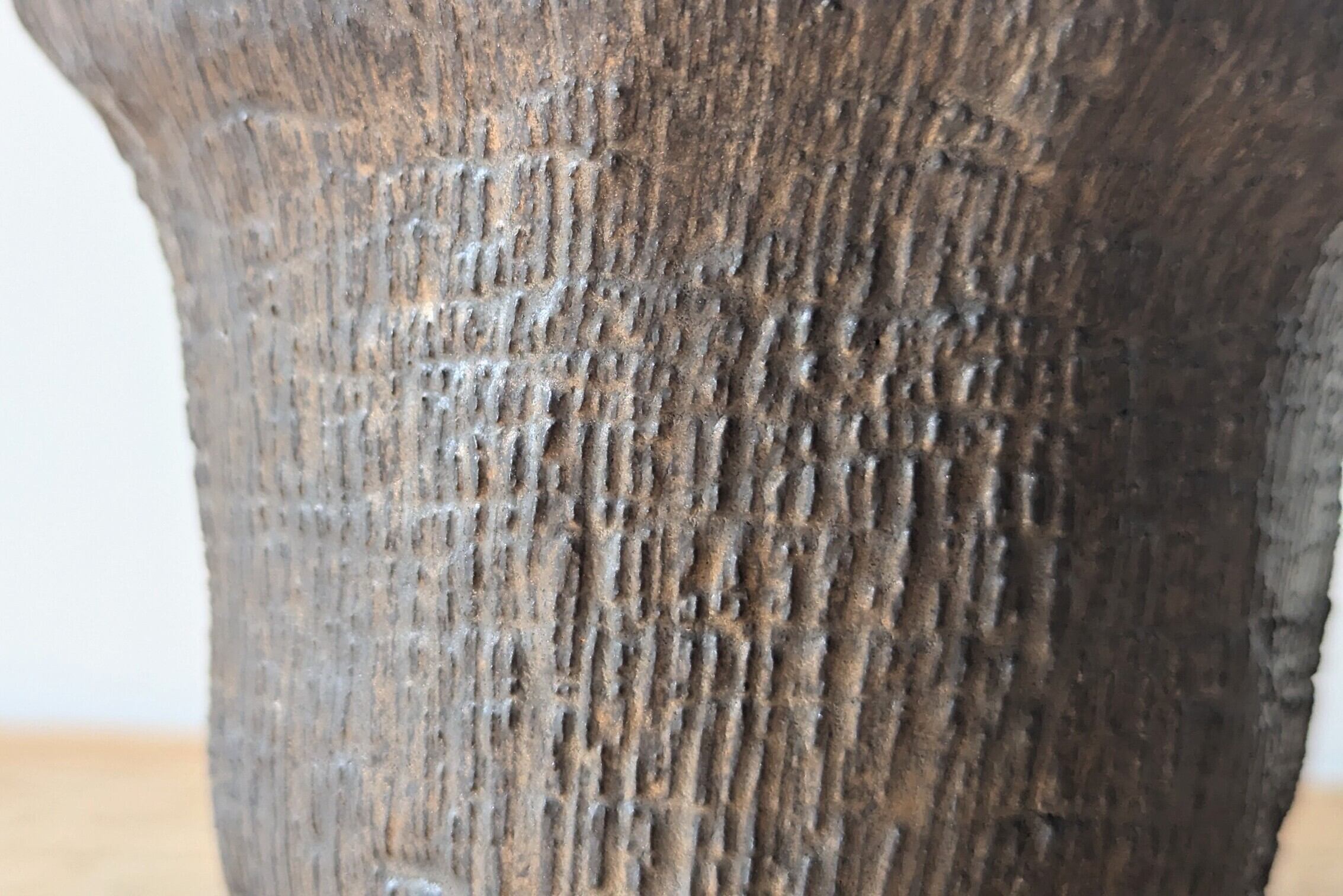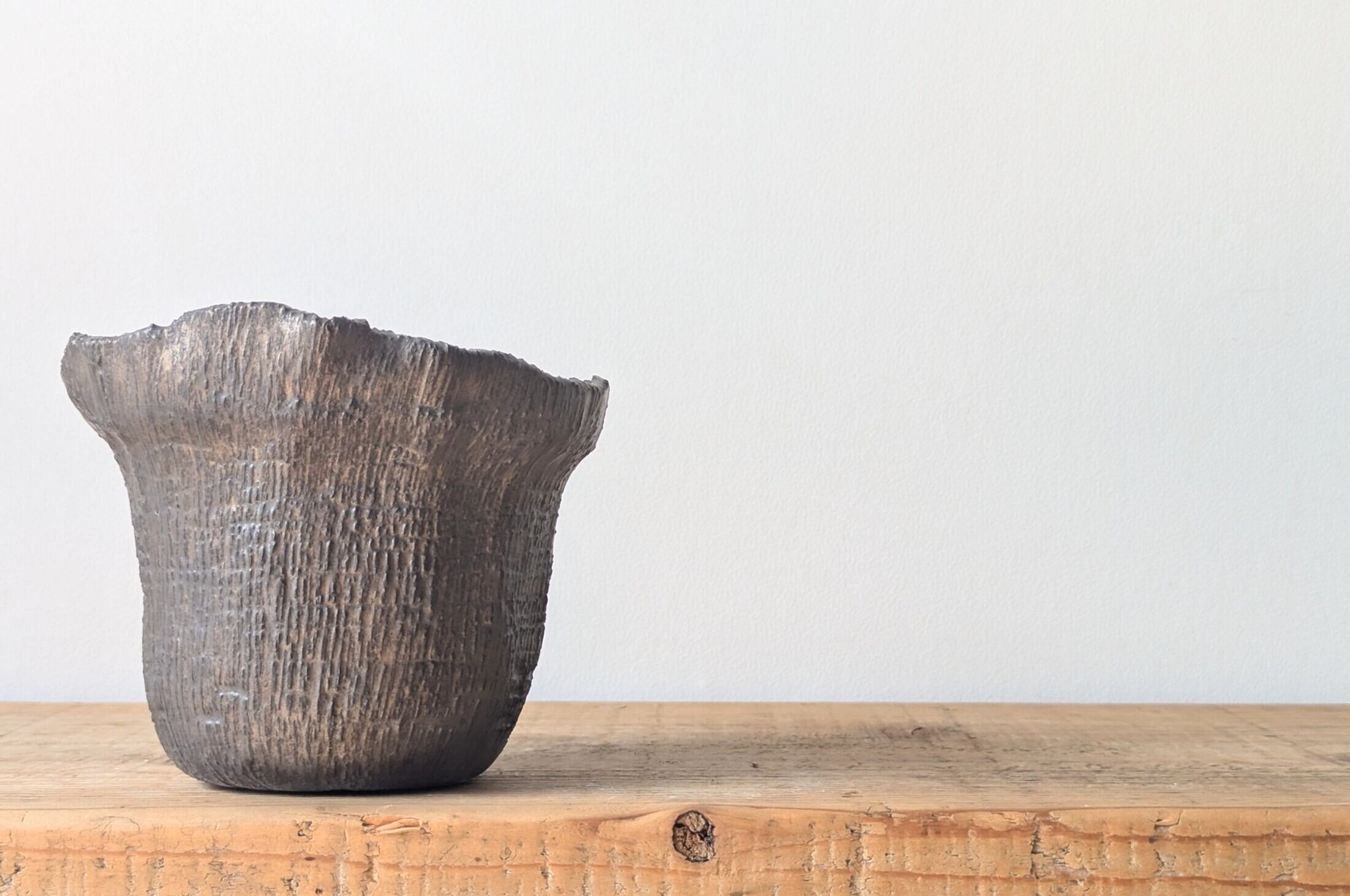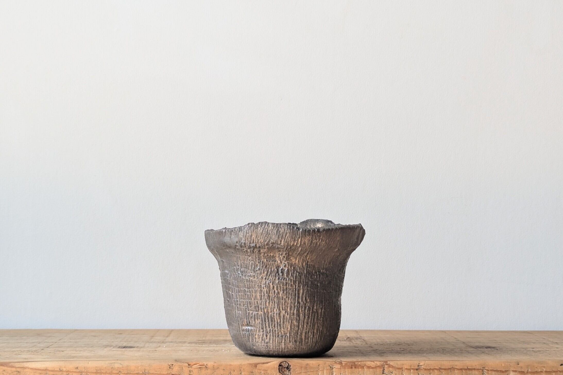 花瓶型に成型した陶土に無数の縦傷をつくり、アンティークゴールドの釉薬を施しました。ゴツゴツした木のような表情の器です。