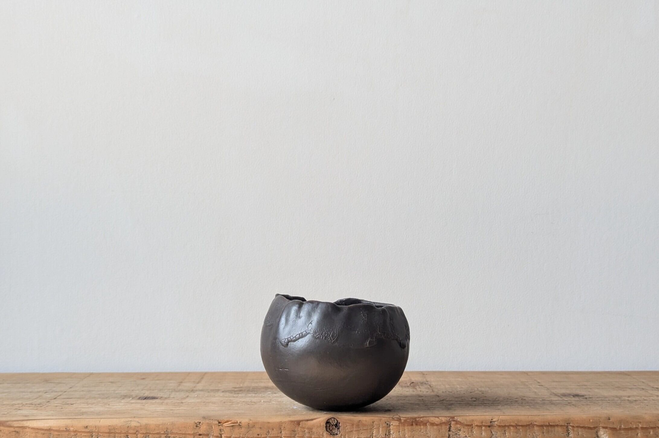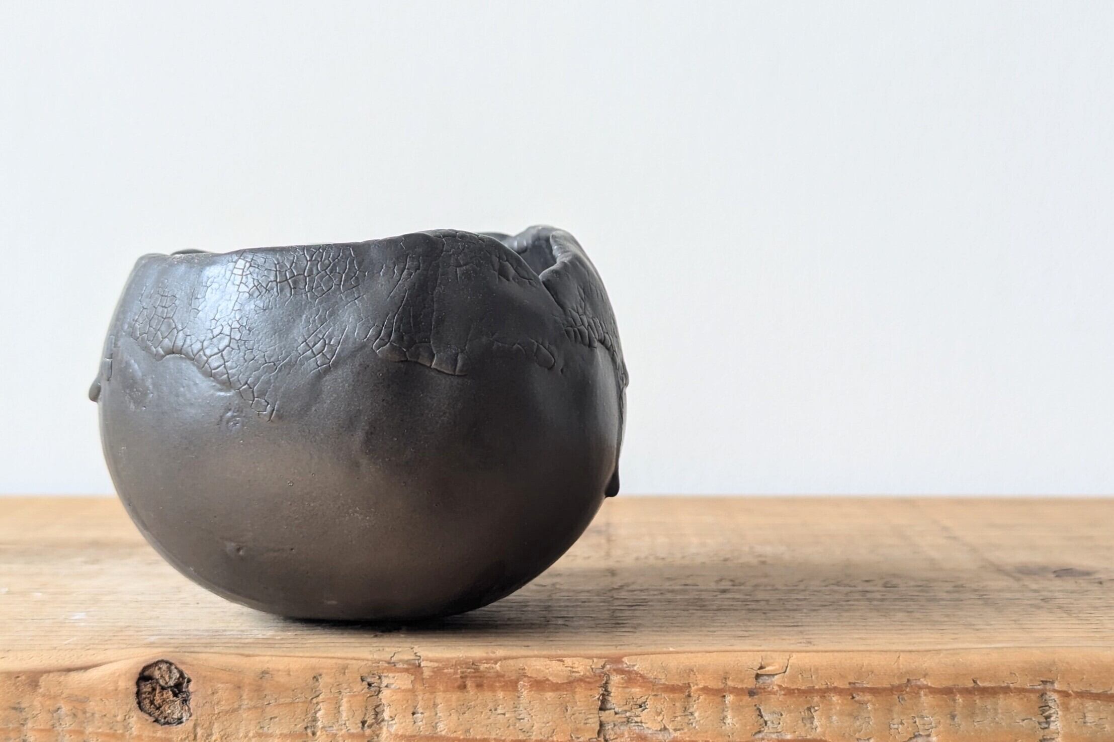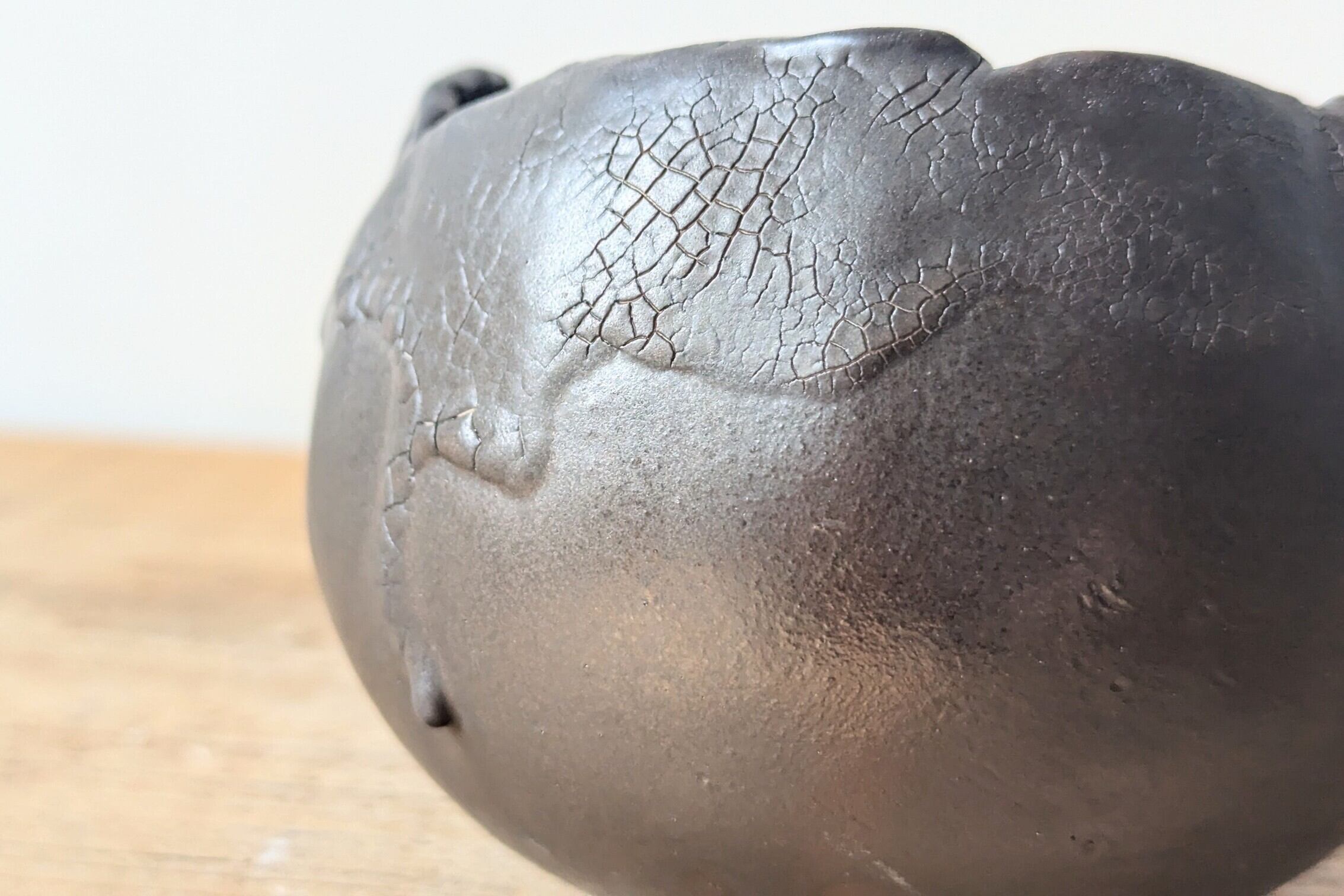 球型に成型した陶土にひび割れを施し釉薬で仕上げました。マットブラックのひび割れが独特な雰囲気を出しています。