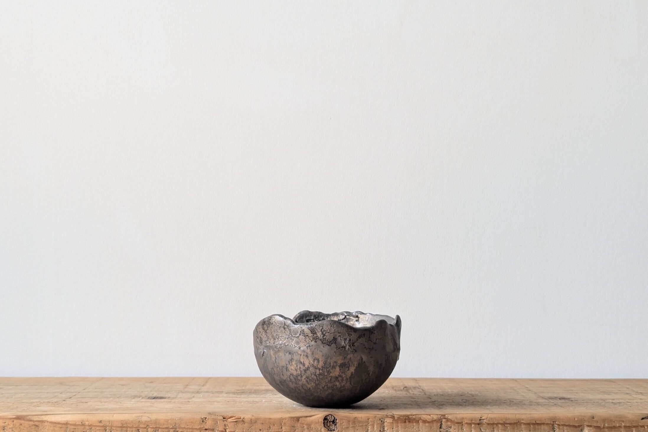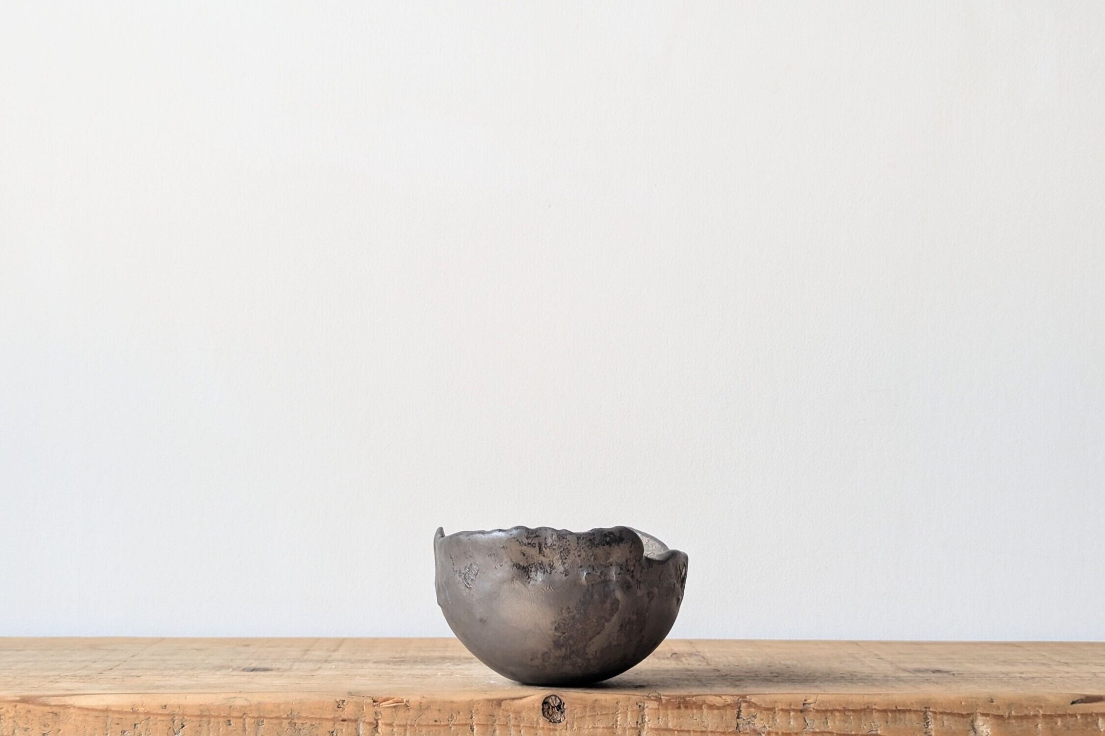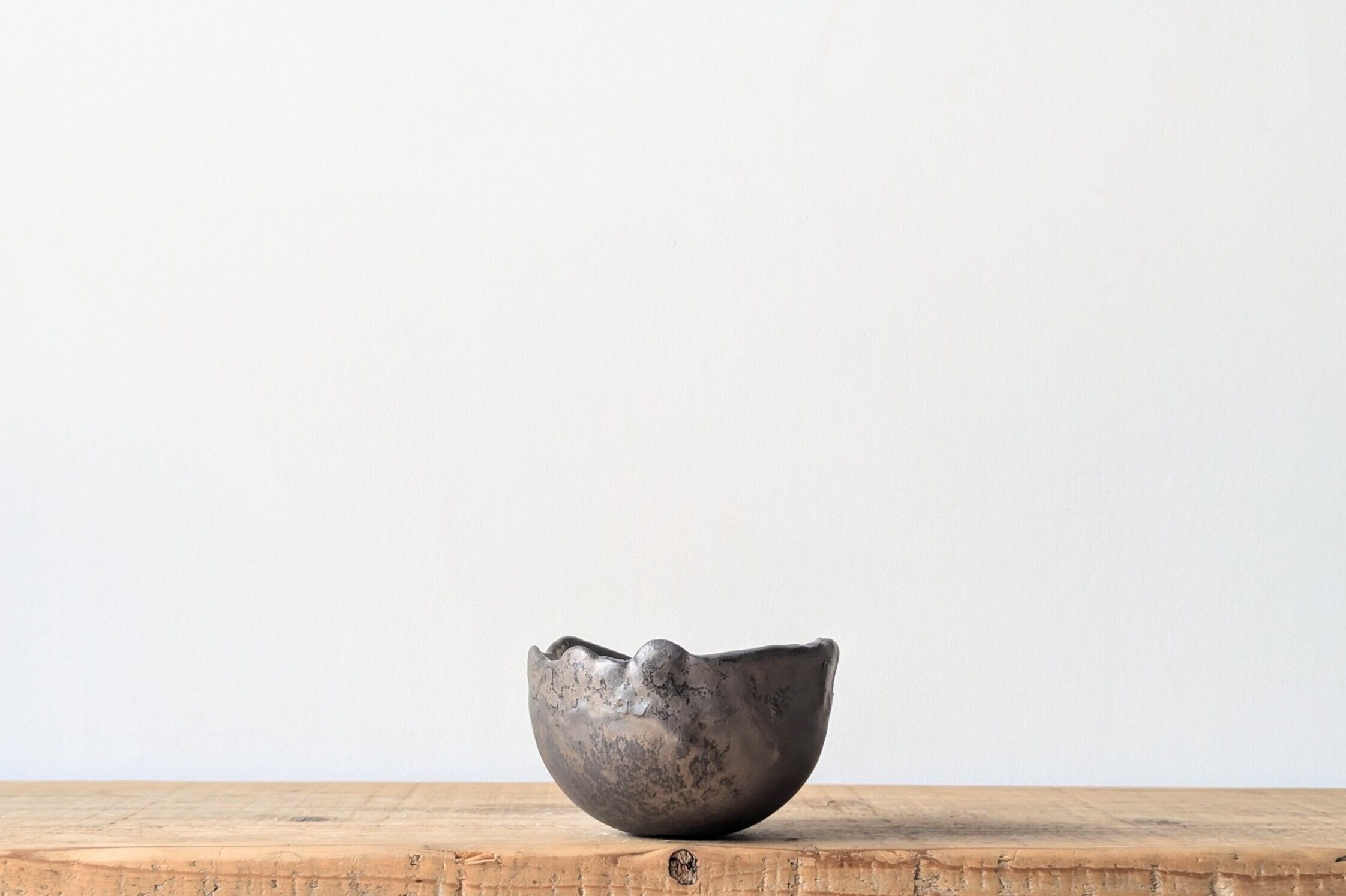 半円に成形した器にひび割れを施し釉薬で仕上げました。アンティークゴールドのひび割れが独特な雰囲気を出しています。