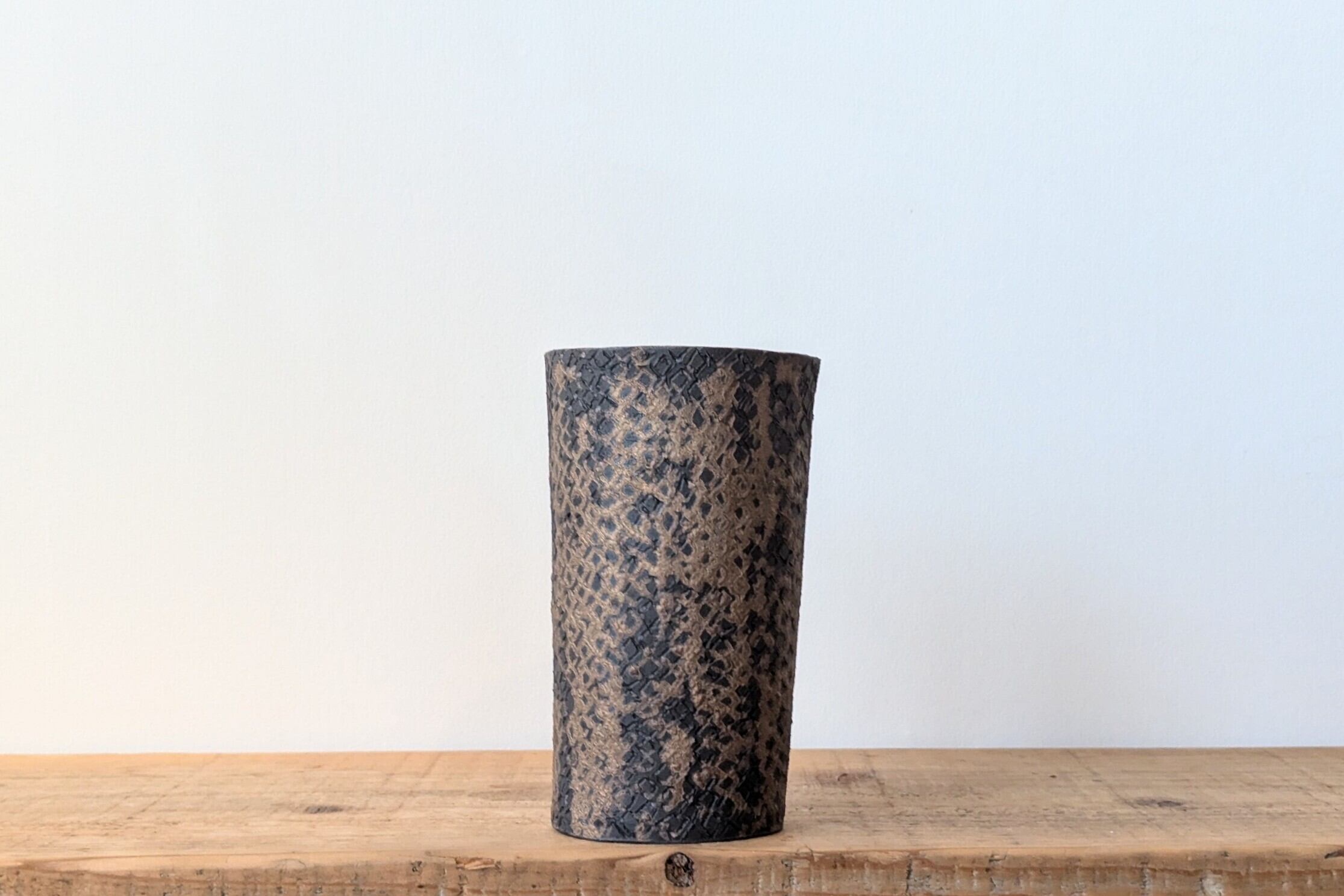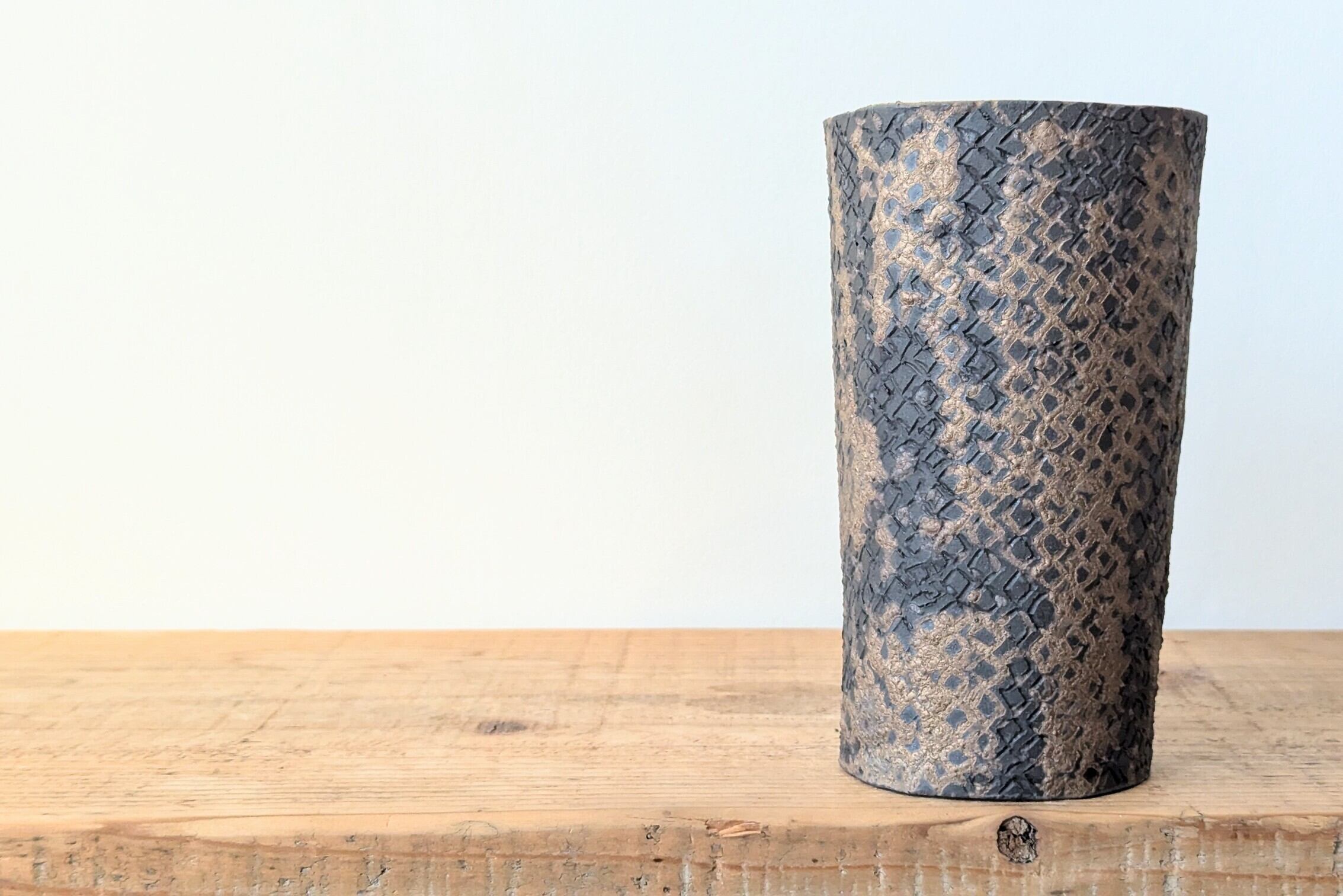 黒土を筒状に成形し、四角いパターン模様を作り、隙間を埋めるように金色の釉薬を施しました。見る角度で全く表情の違うデザインが他には見ない雰囲気の器となっています。とっておきの灌木や長めの塊根にぜひご利用ください。