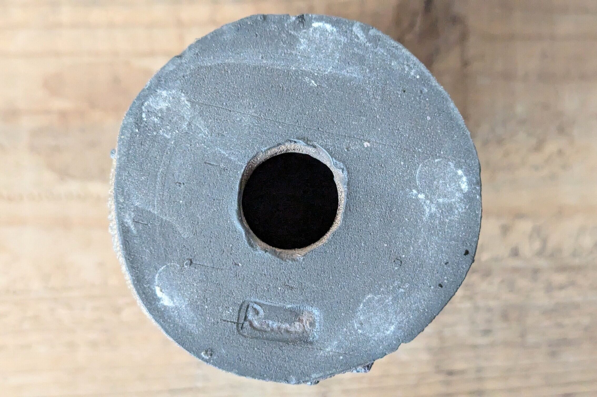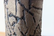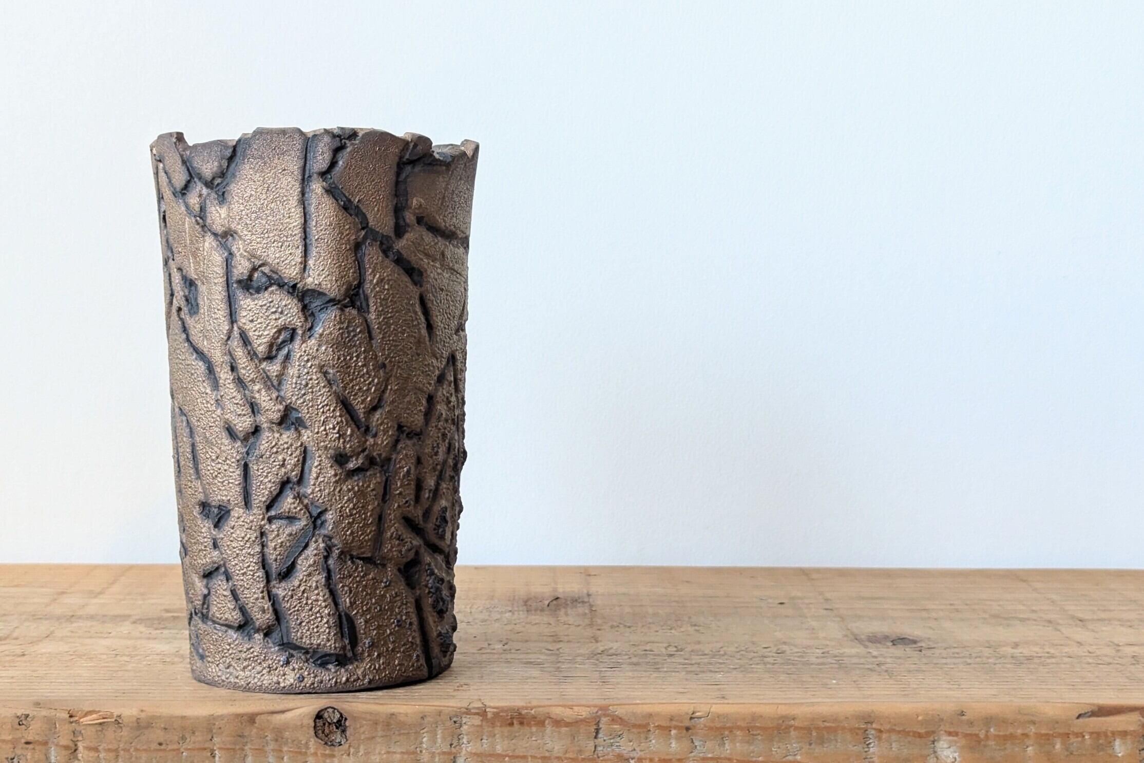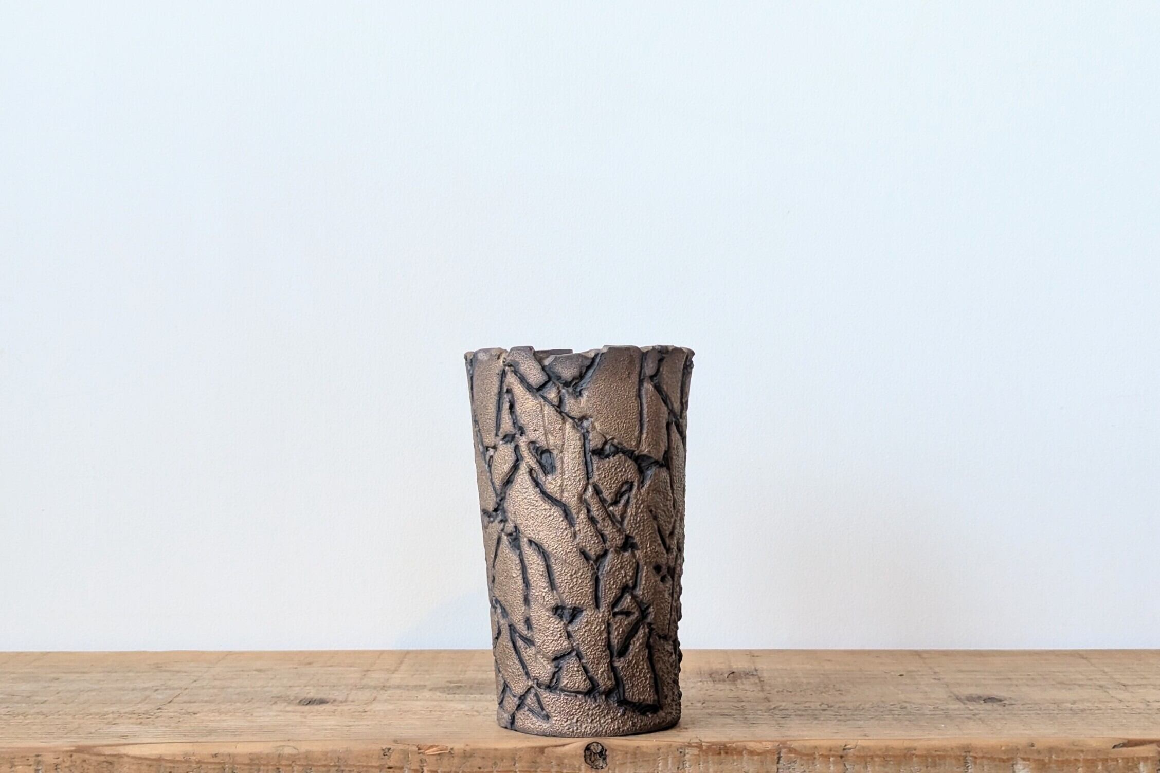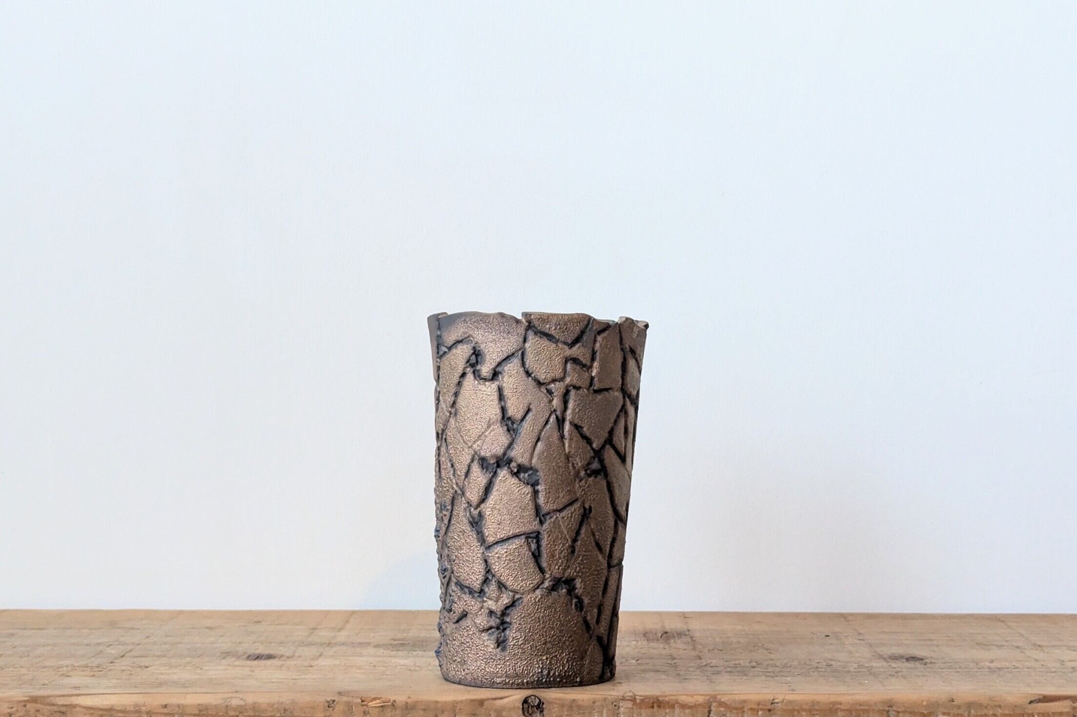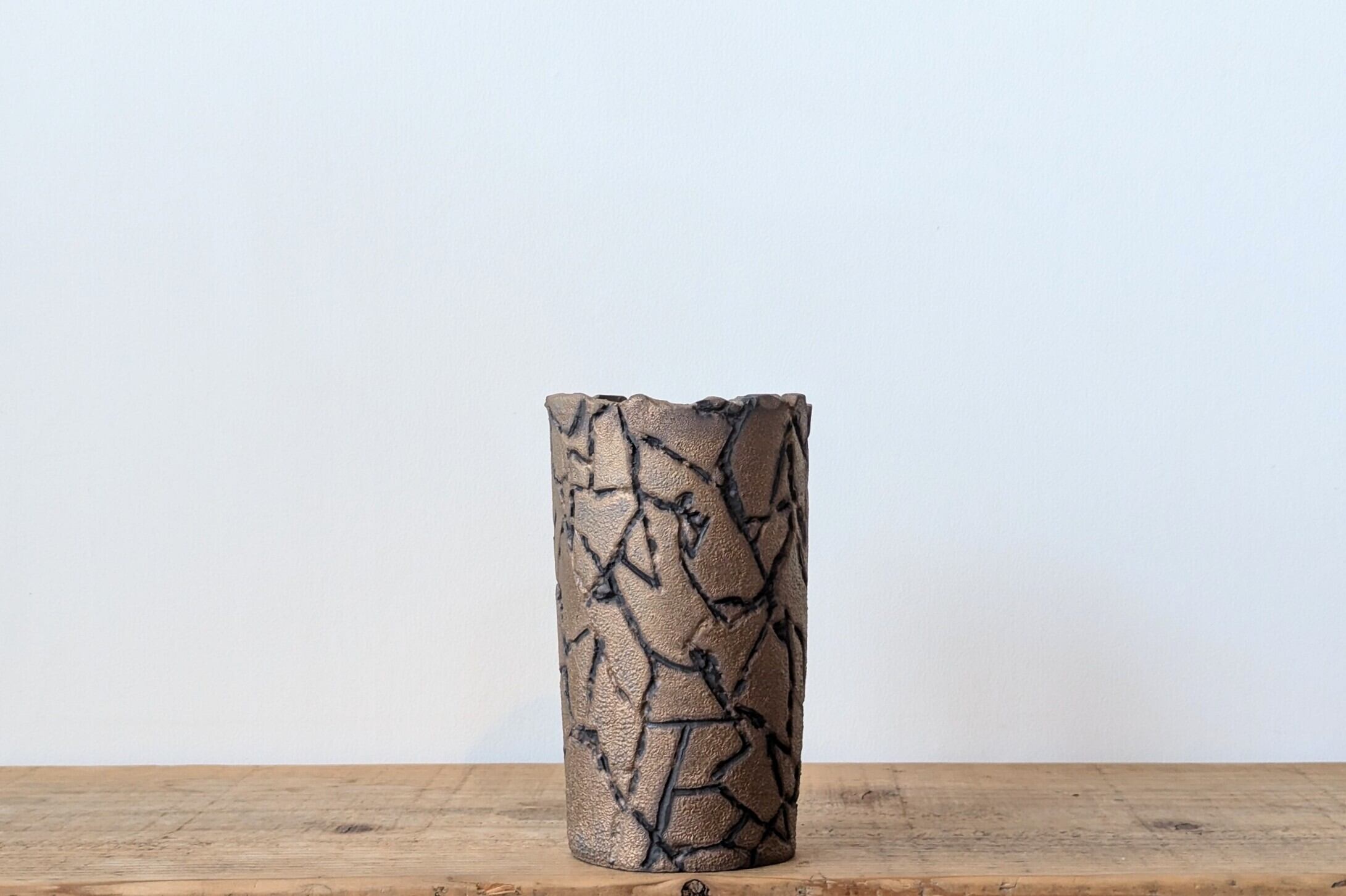 黒土を筒状に成形し、激しいクラッシュを作り、隙間を残して全体的に金色の釉薬を施しました。金の隙間に黒のひび割れが見えるデザインで、ゴージャスで力強い仕上がりになっています。とっておきの灌木や長めの塊根にぜひご利用ください。