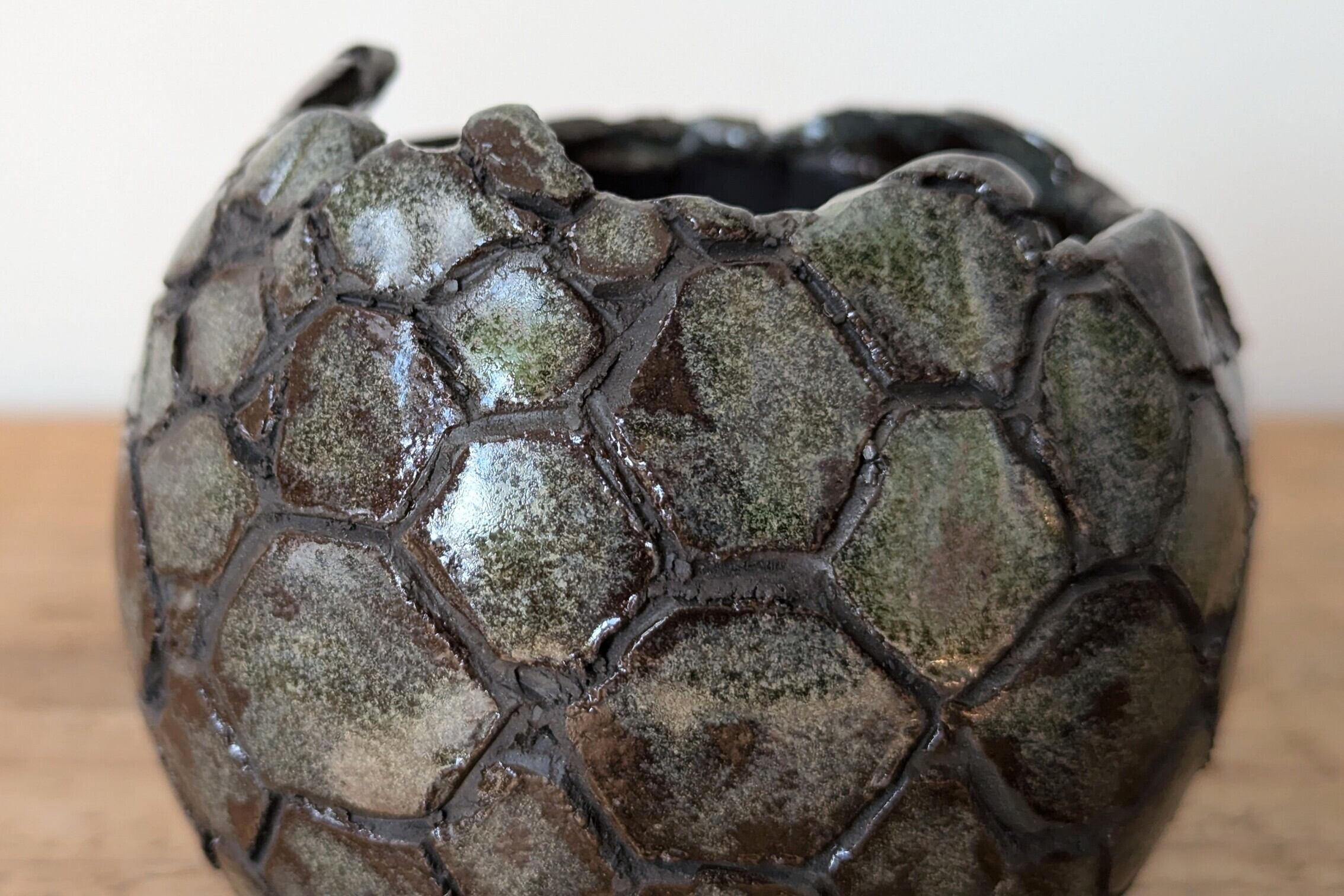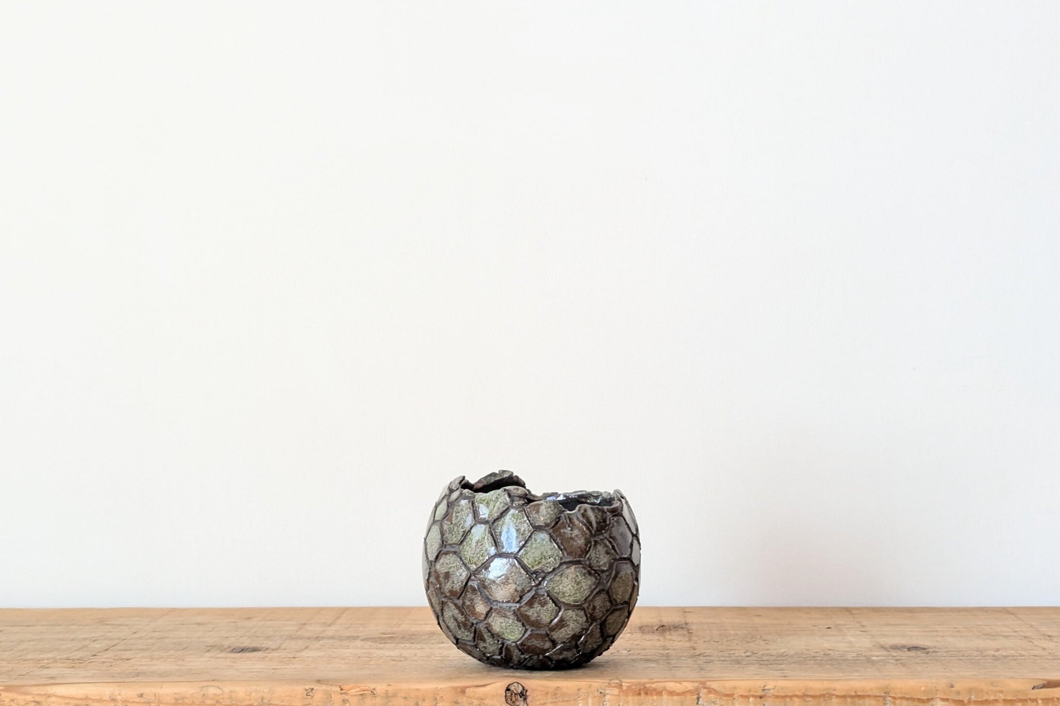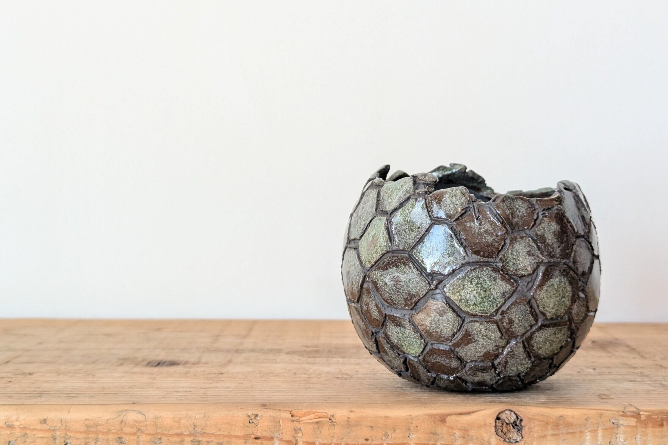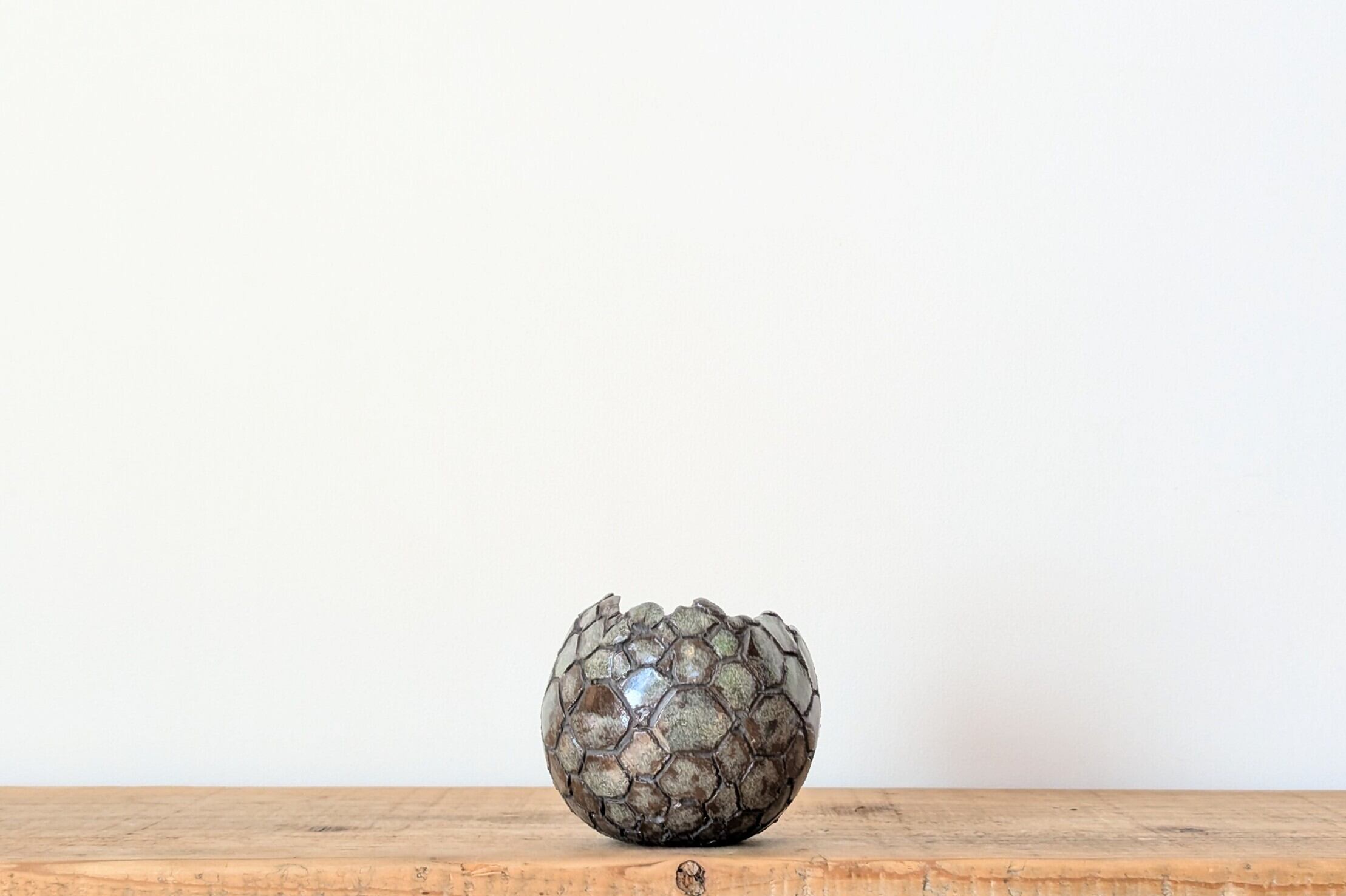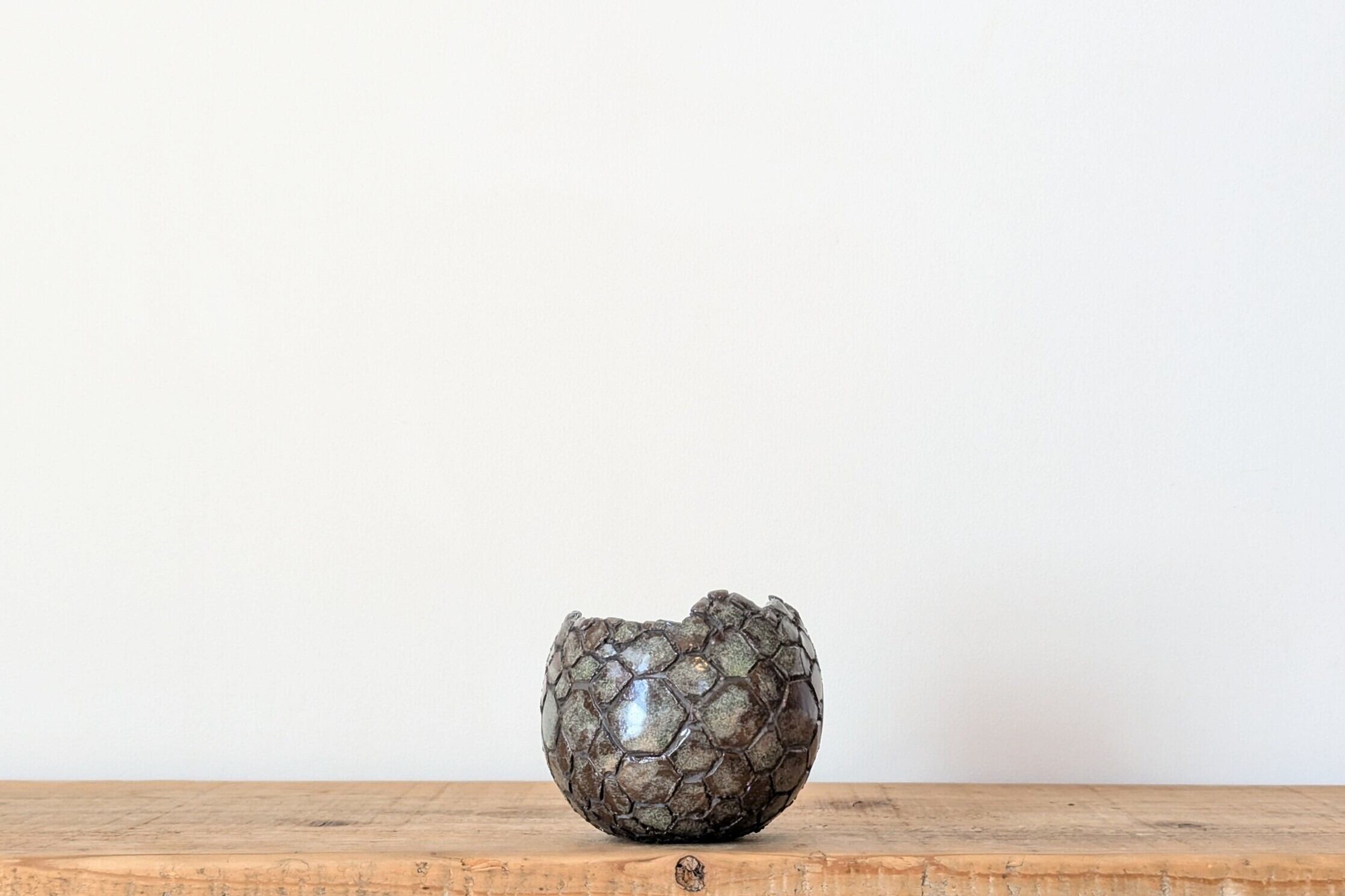 球型に成型した陶土に竜の鱗の様な模様を作り青銅色の釉薬を施しました。青銅とマットな黒色の表面がところどころで見せる風合いが渋い雰囲気を更に引き出しています。