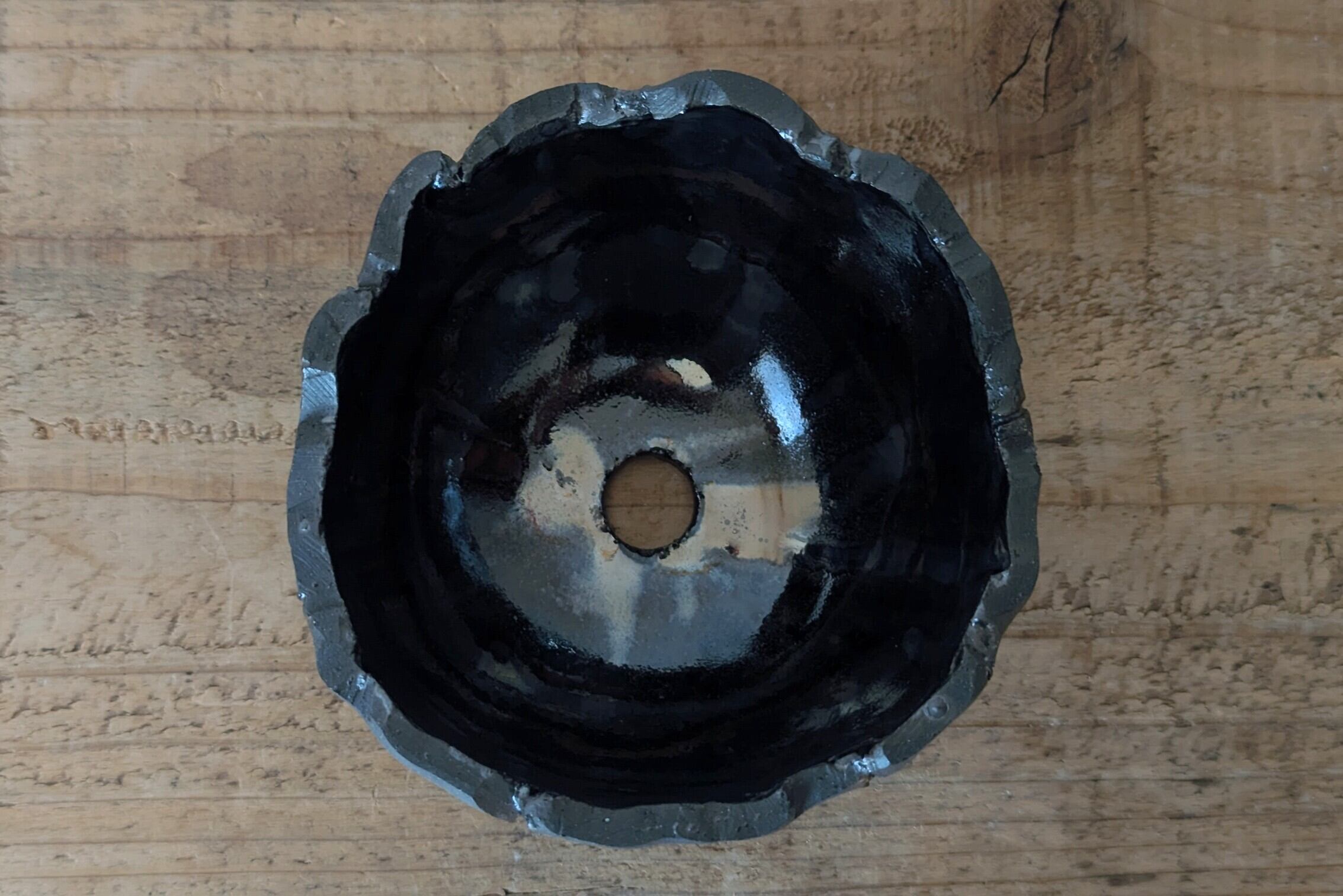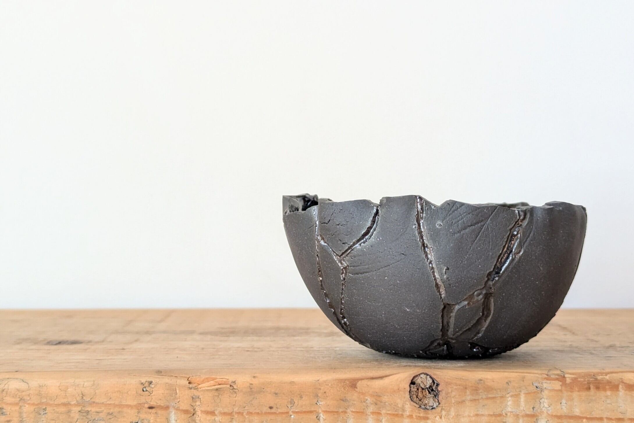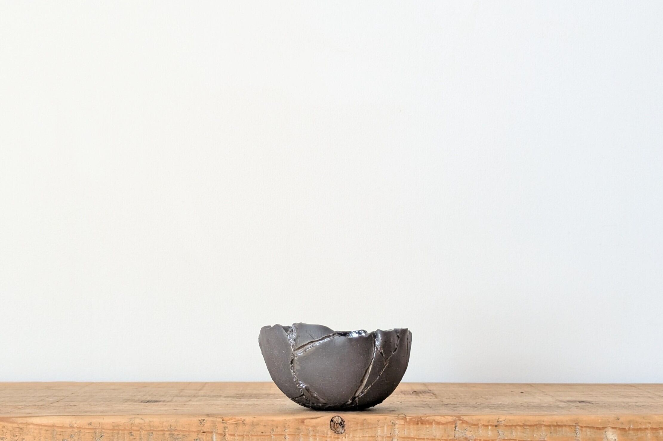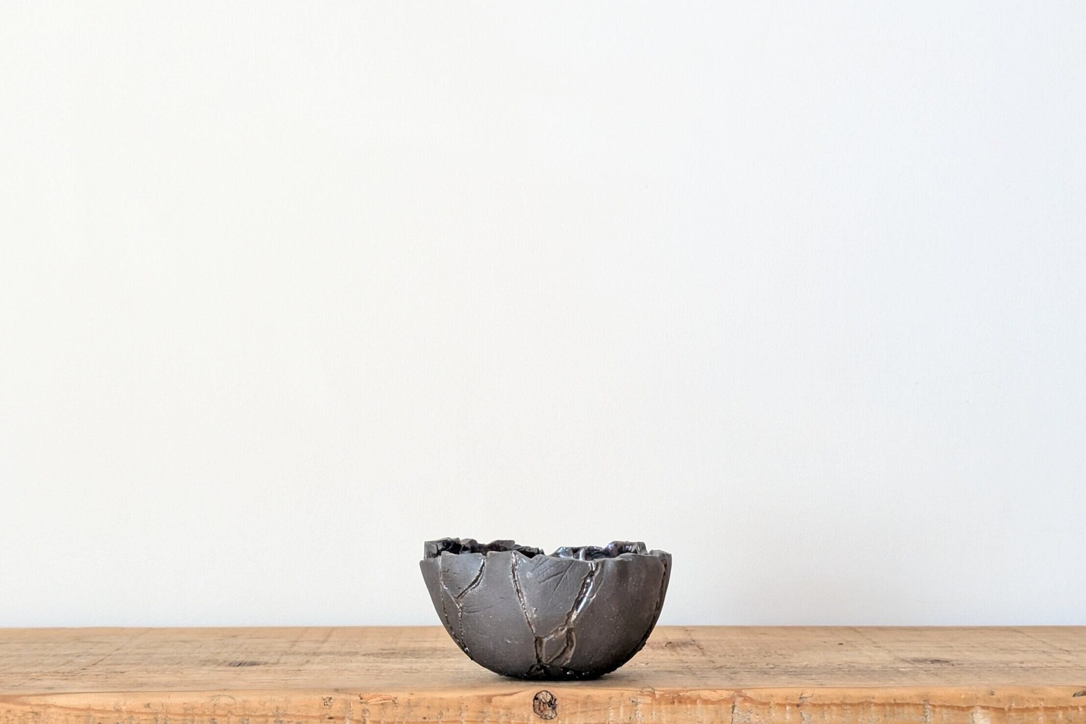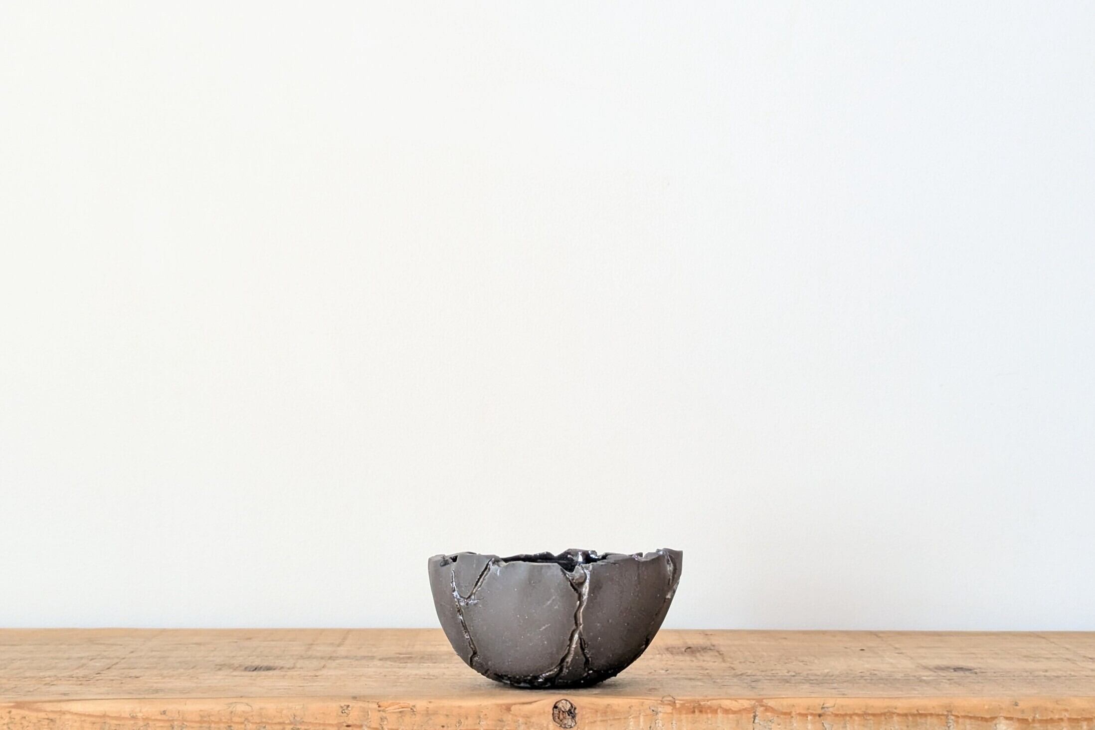 球型に成型した陶土に激しいひび割れを作りその隙間に銀色の釉薬を流し込みました。まるで銀色の隕石がひび割れたような宇宙的なデザインの器です。