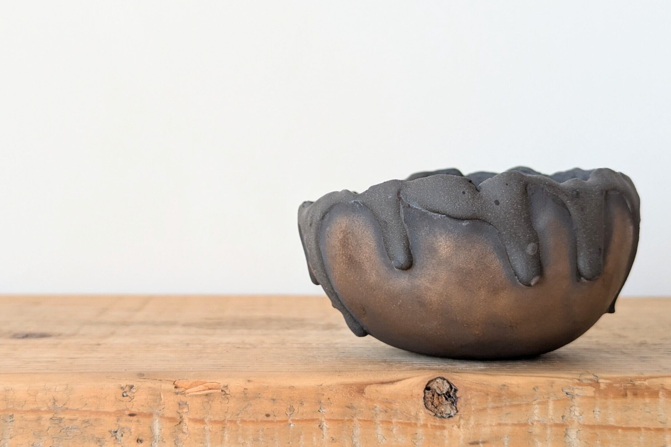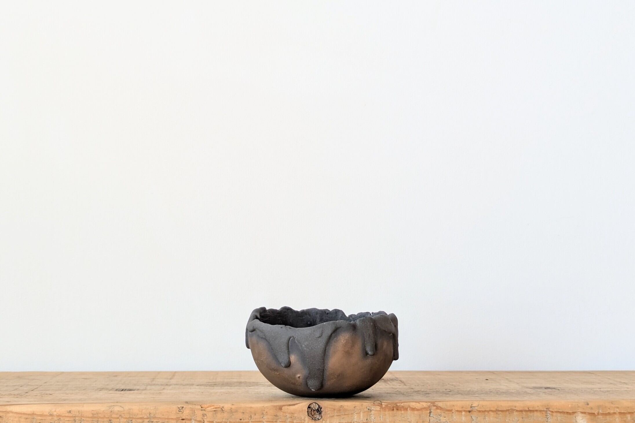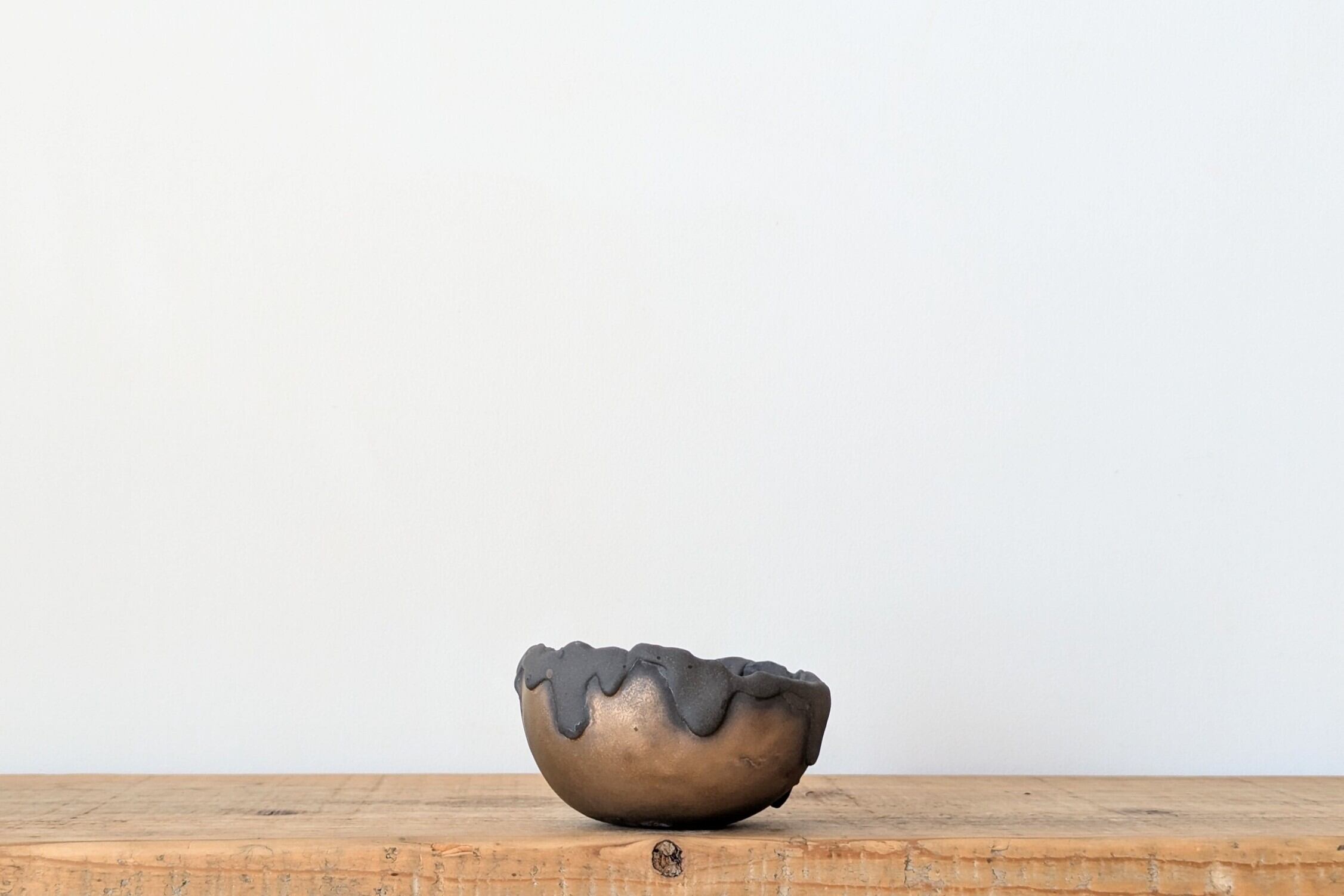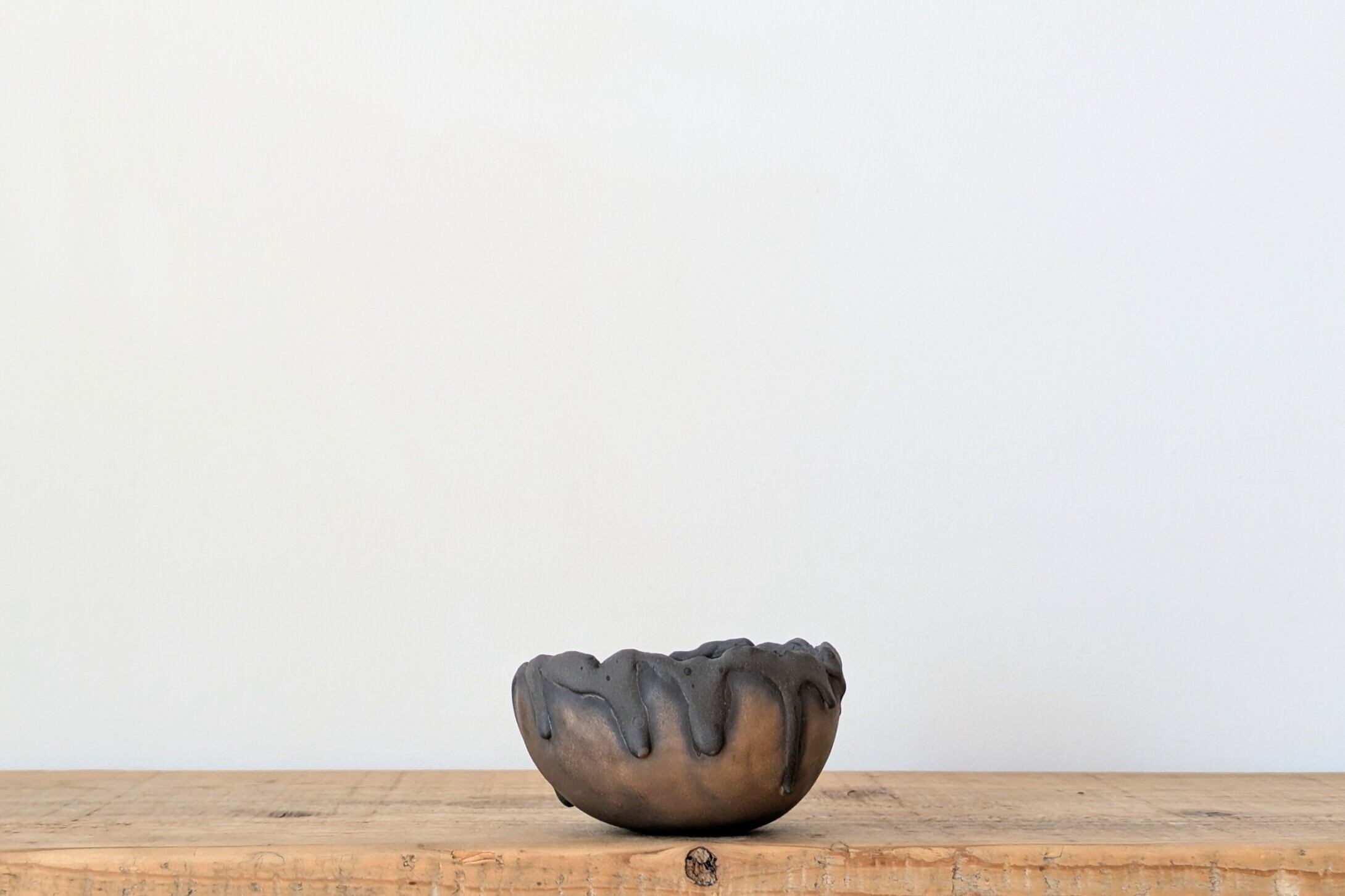 お椀型に成型した陶土に土を垂らし、金色の釉薬で仕上げました。黒と金色のコントラストが独特な雰囲気の器です。