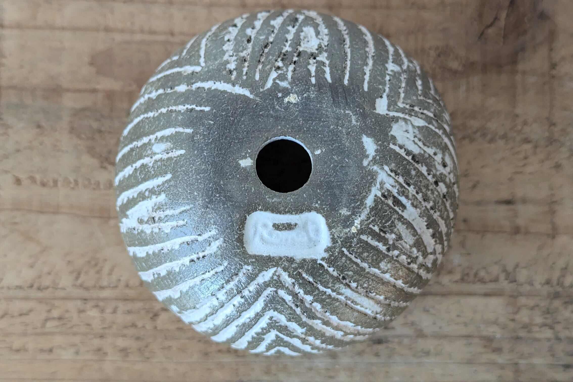 球型に成型した陶土に民族調の模様をつけ特殊な製法で隙間だけ白い釉薬を施しました。