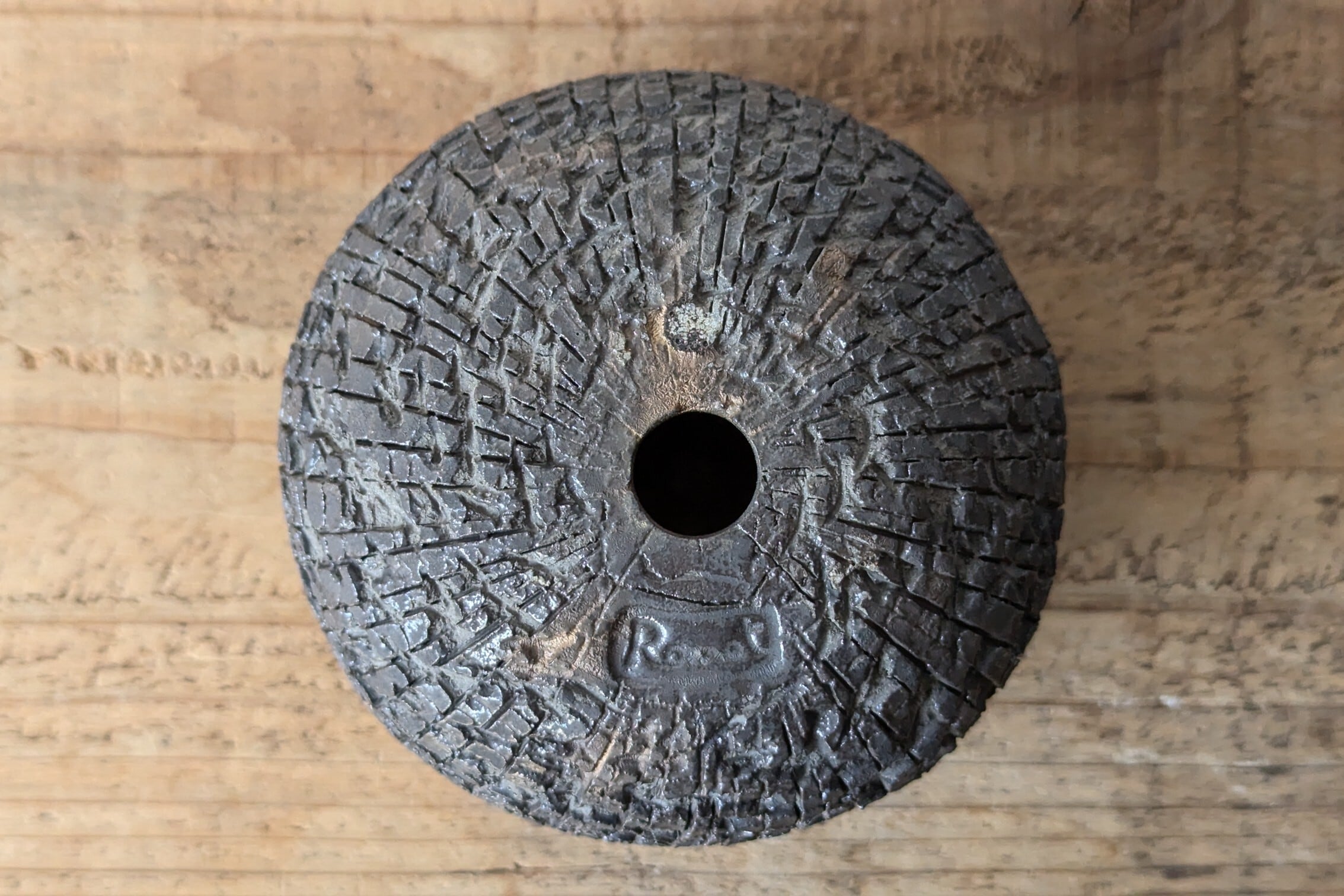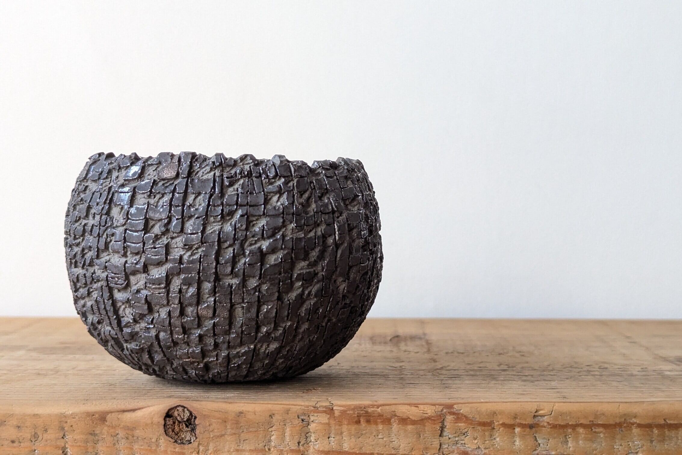 球型に成型した陶土に中世の城を連想させる石壁の様な模様を作り、アンティークゴールドの釉薬で仕上げました。金色が控えめな発色となり、マッドブラックの様な色合い野器です。