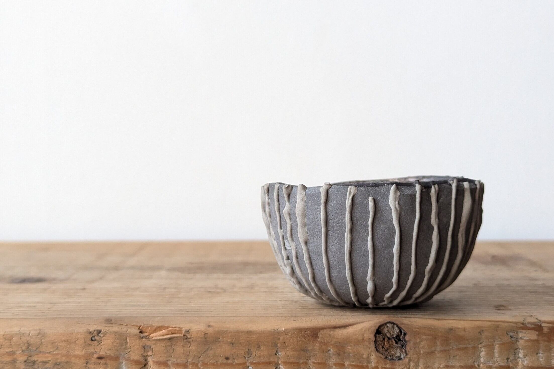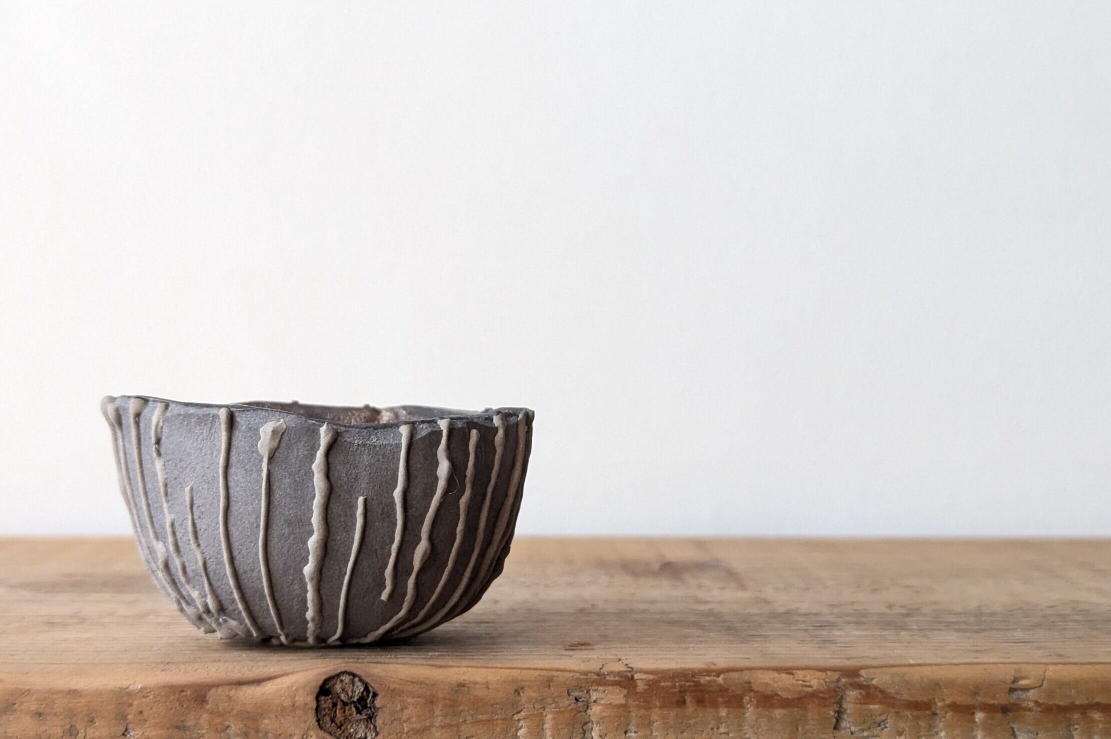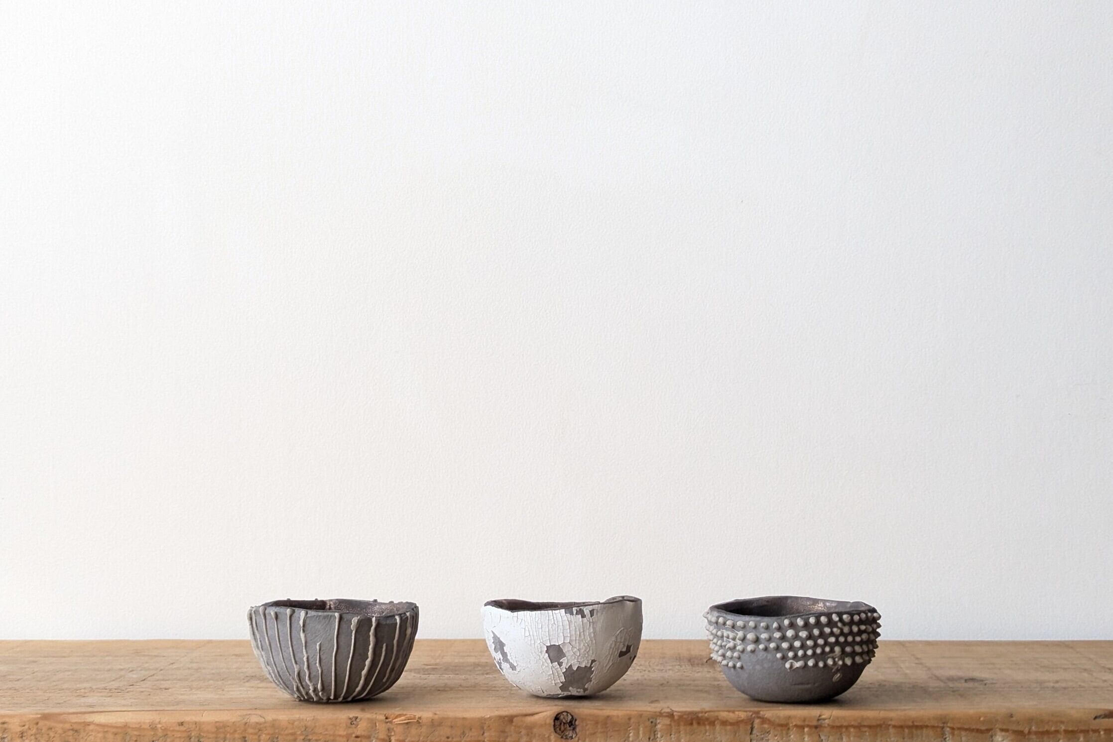 小さなお椀型に成型した成型した陶土に陶土を垂らし釉薬で仕上げました。実生や小さな植物を入れると存在感のある仕立てになります。