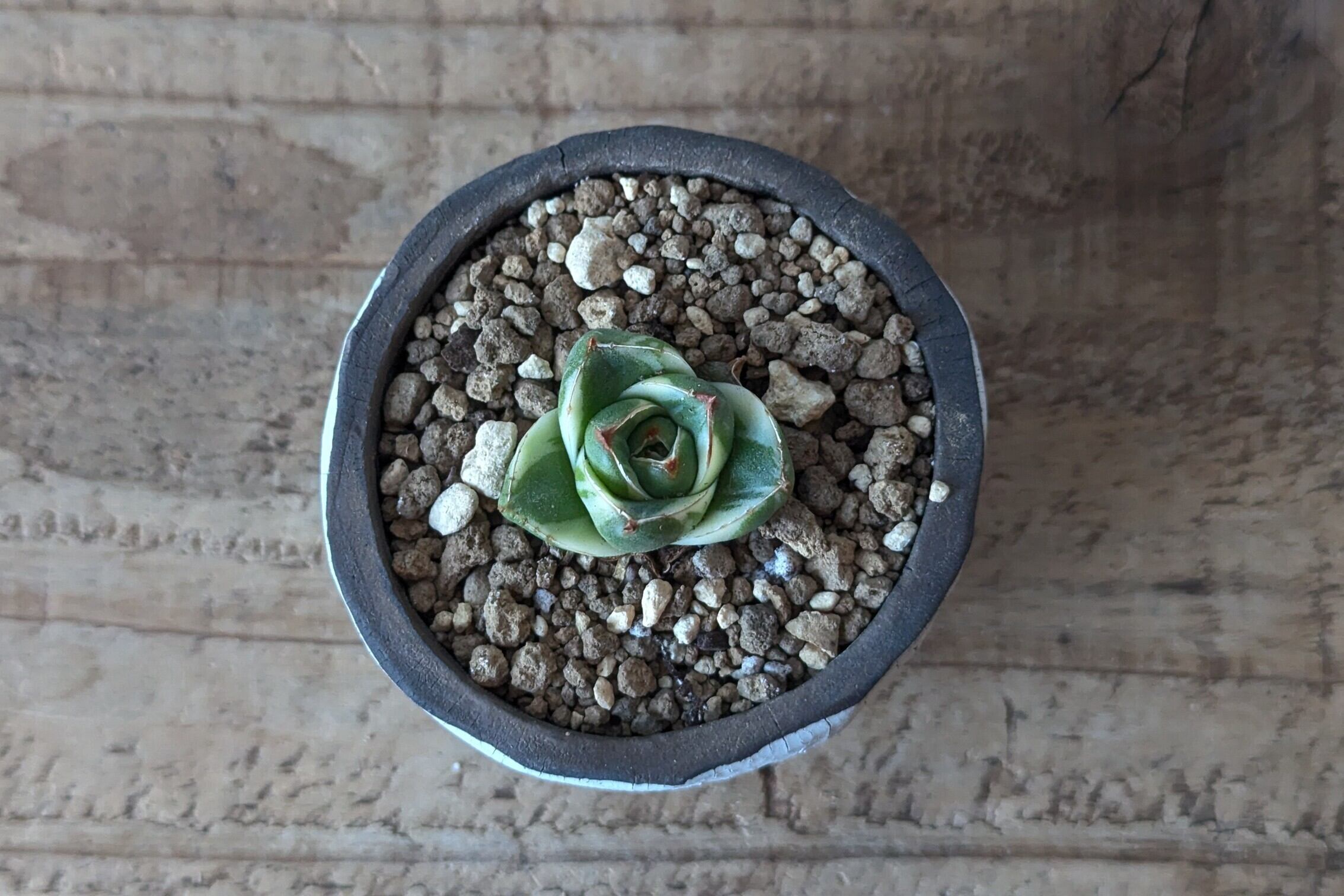 小さなお椀型に成型した成型した陶土に陶土を垂らし釉薬で仕上げました。実生や小さな植物を入れると存在感のある仕立てになります。